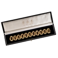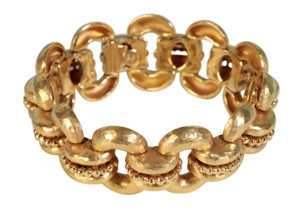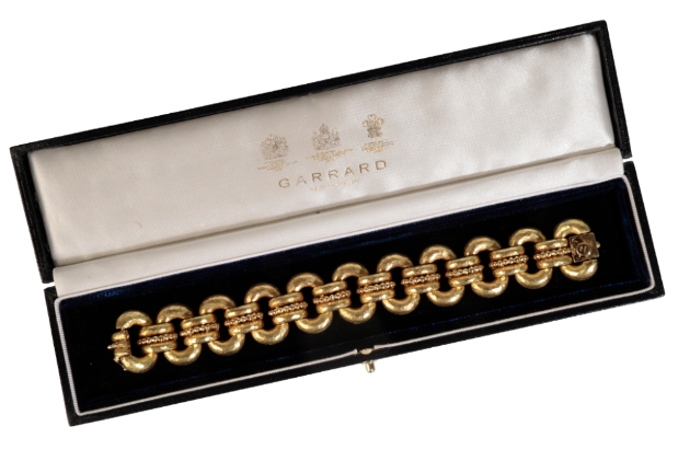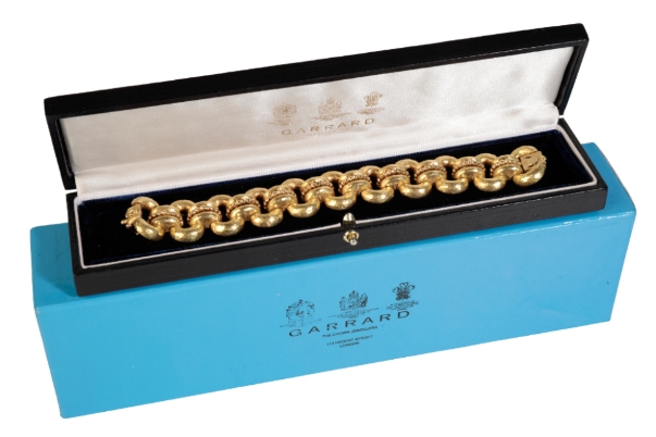 AN 18CT GOLD LINK BRACELET BY GARRARDS, the textured oval links, joined by crescents with beading to the centre, in its original Gerrard's box c.74.65grams length: 19cm