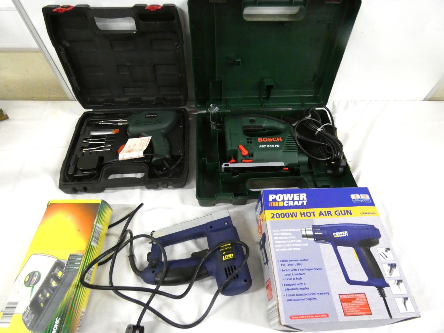 Box of power tools to include Bosh jigsaw, soldering gun, stapler etc.
