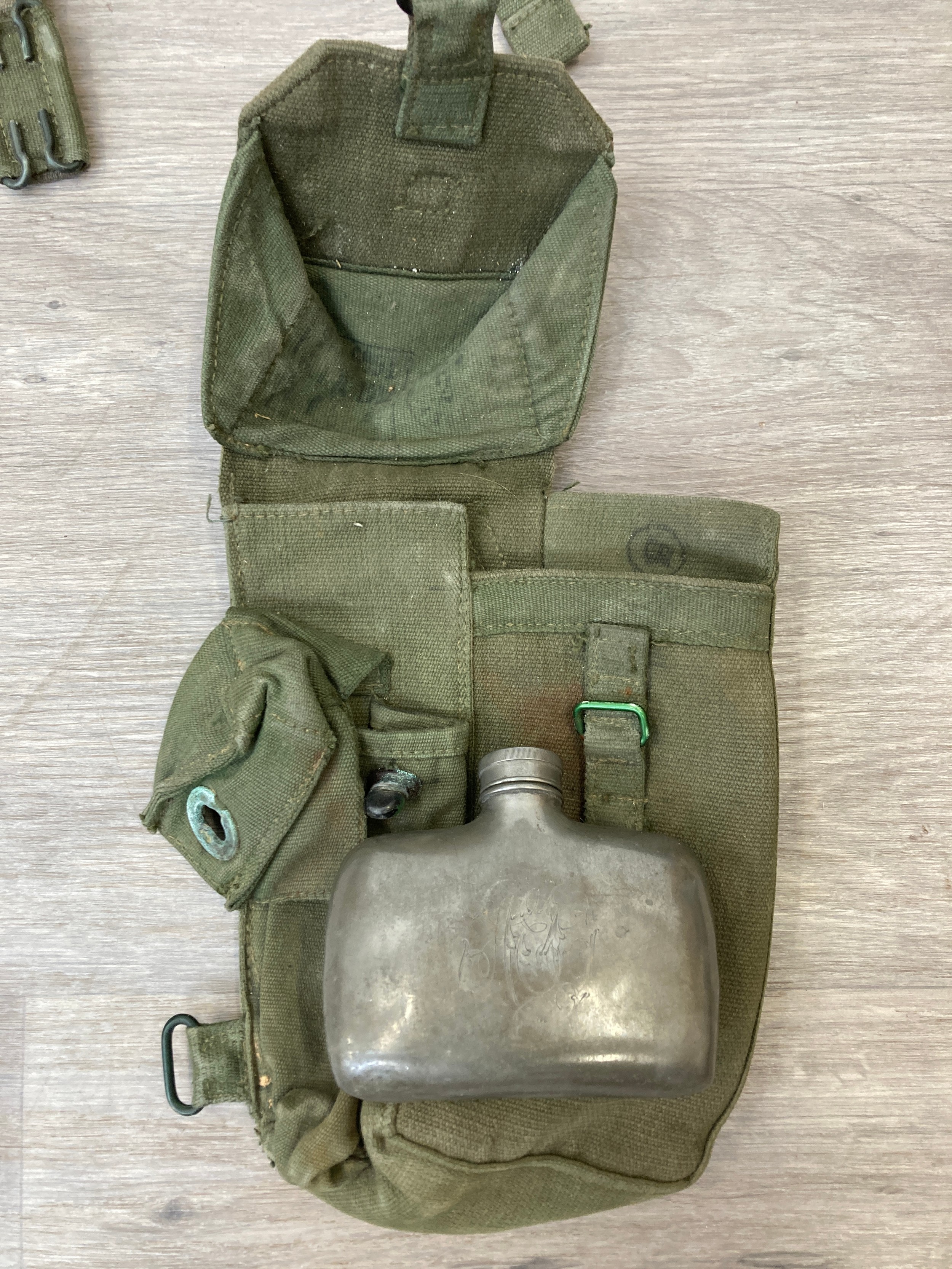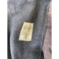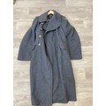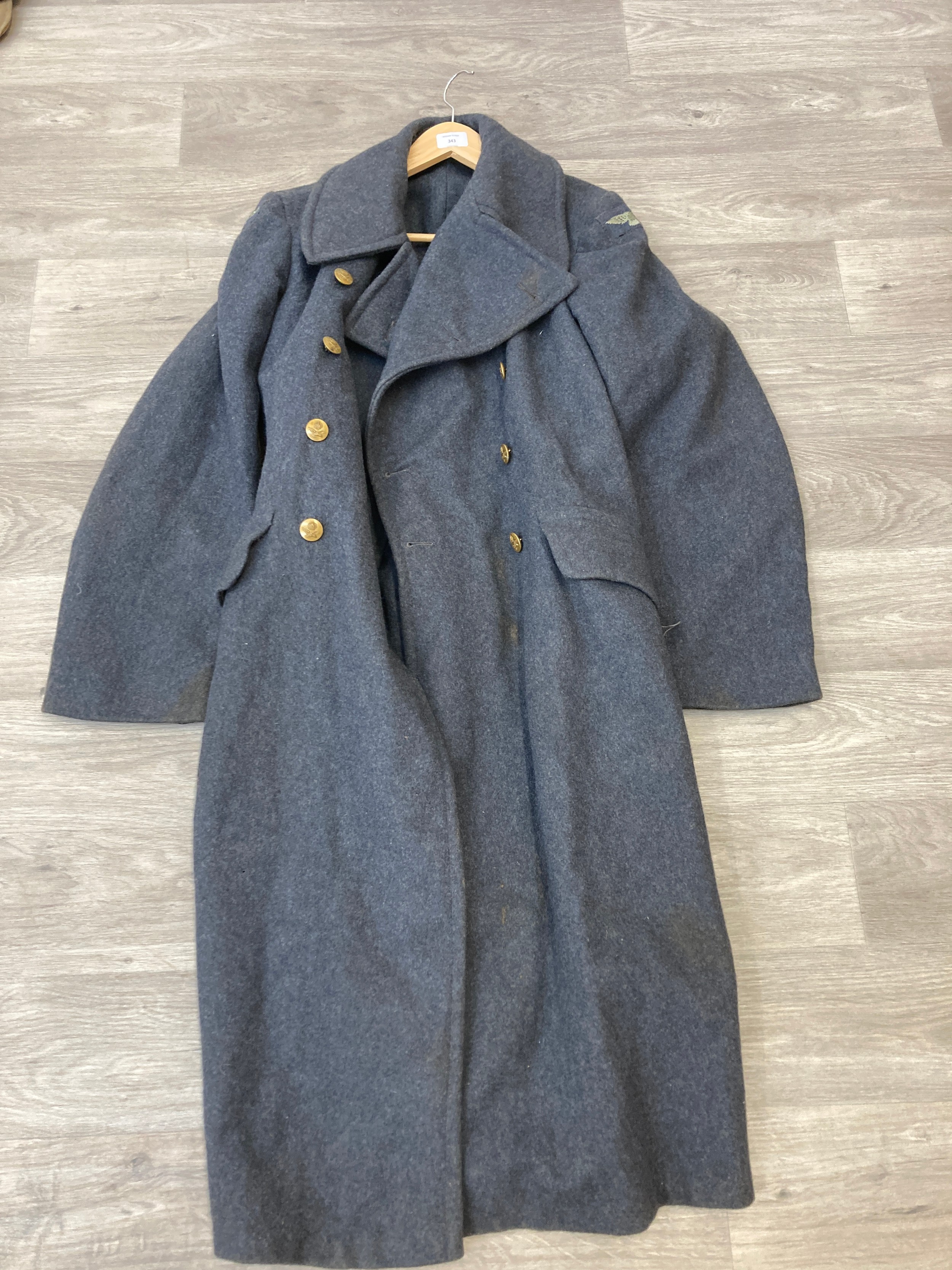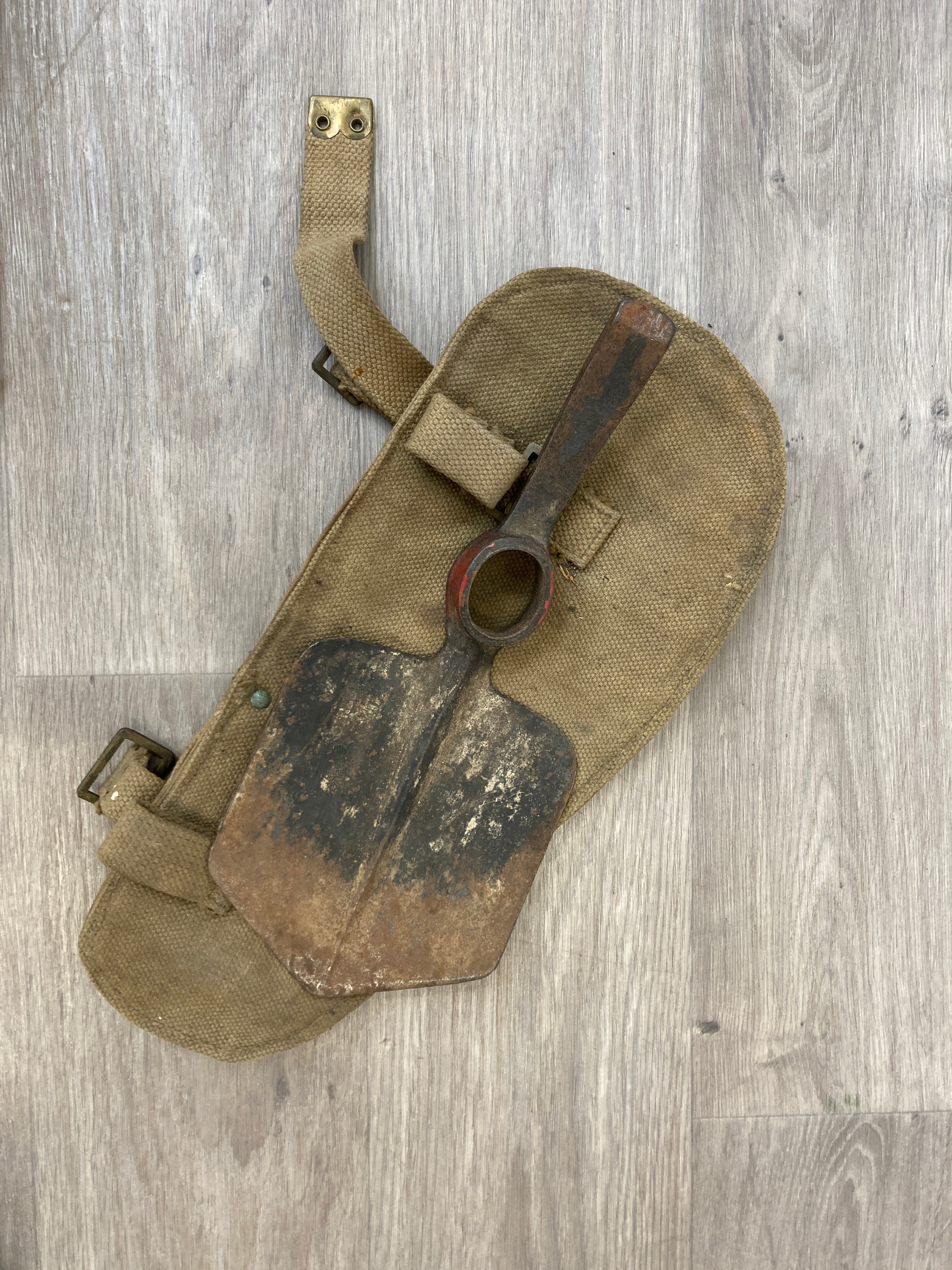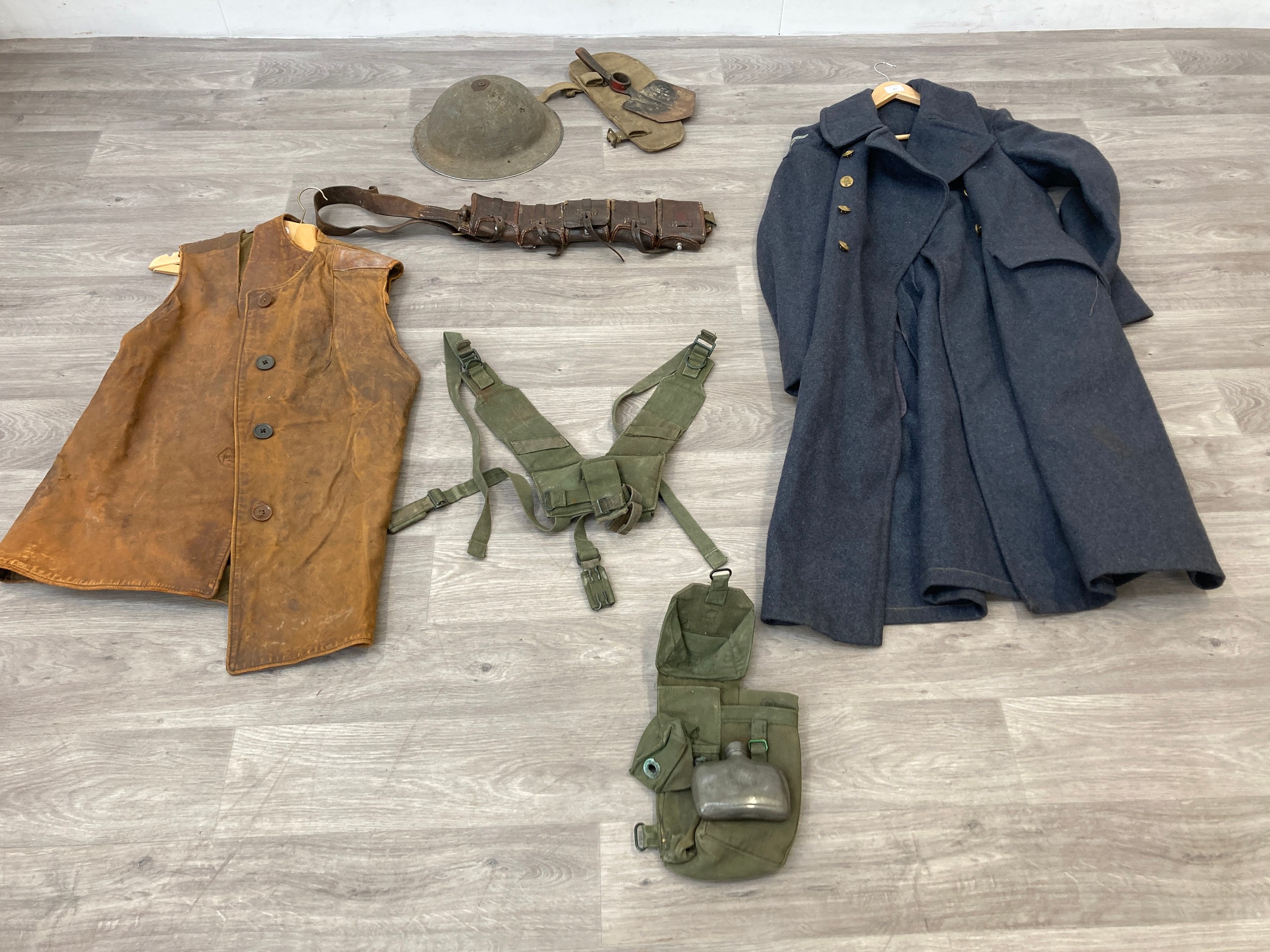 Seven items to include cased WWII entrenching tool, WWII canvas gas mask bag containing pewter hip flask, WWII British Brodie helmet, leather five pouch bandolier with crown stamp, 1951 Windsmoor Ltd. size no.12 new pattern RAF great coat etc.
