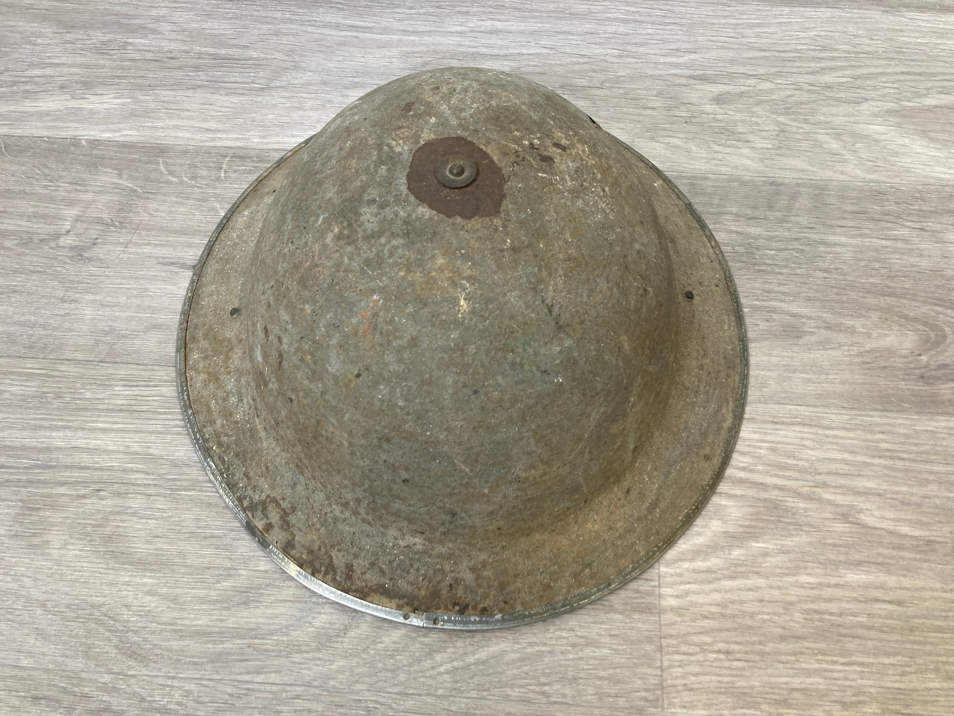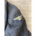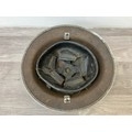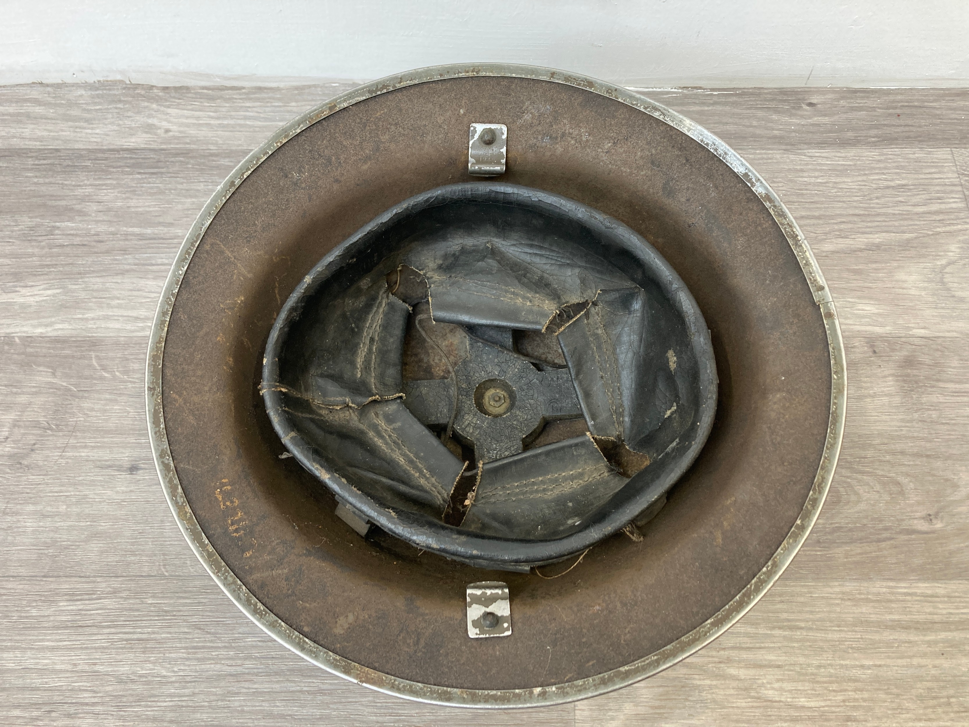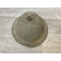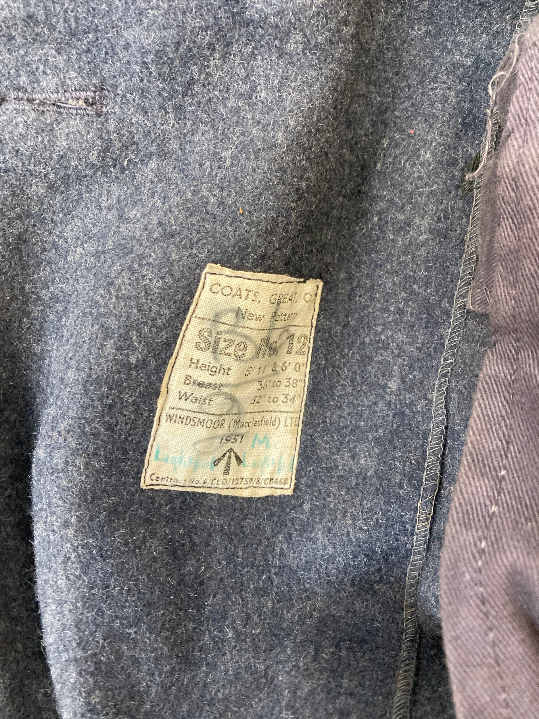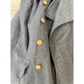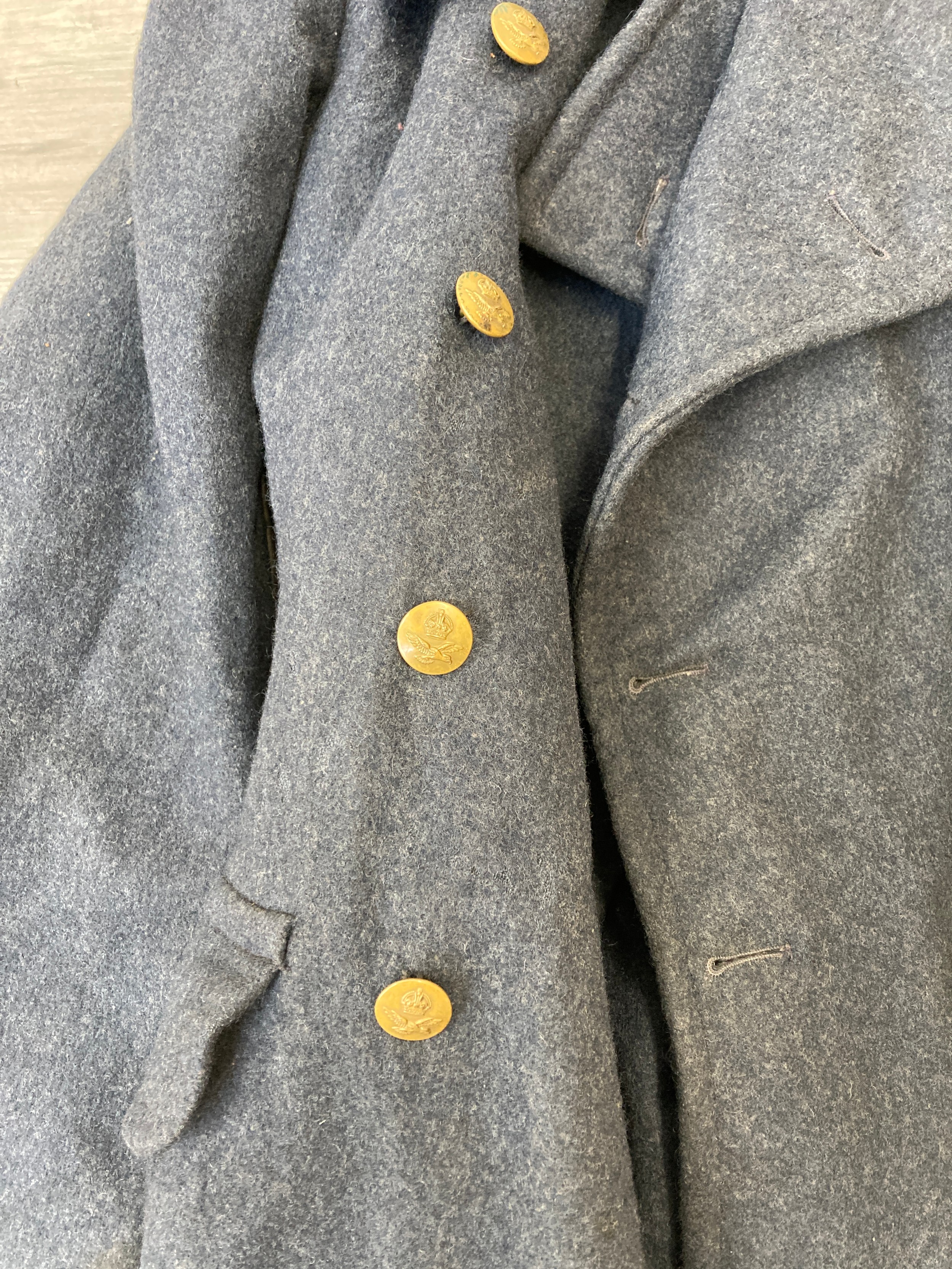 Seven items to include cased WWII entrenching tool, WWII canvas gas mask bag containing pewter hip flask, WWII British Brodie helmet, leather five pouch bandolier with crown stamp, 1951 Windsmoor Ltd. size no.12 new pattern RAF great coat etc.