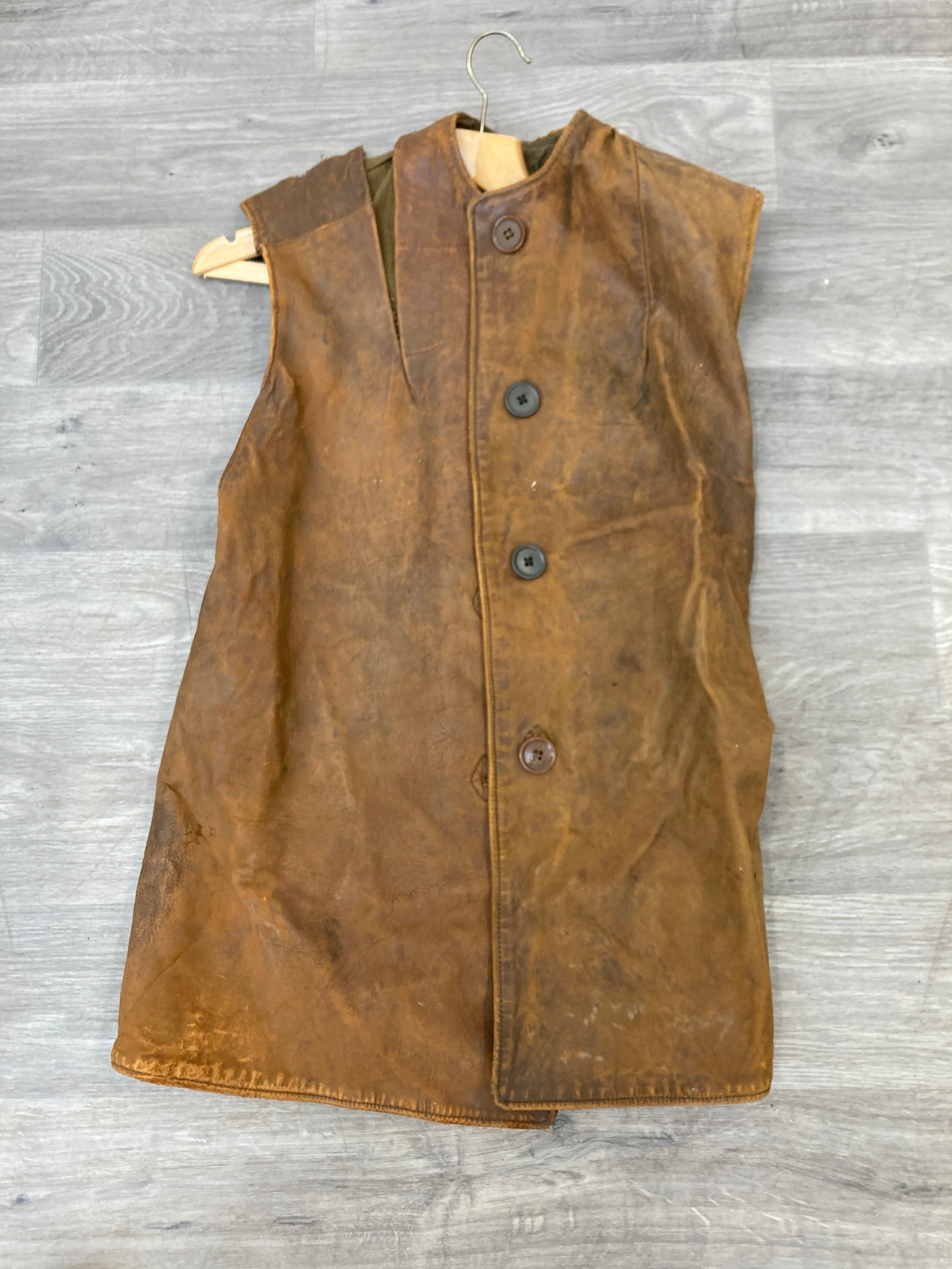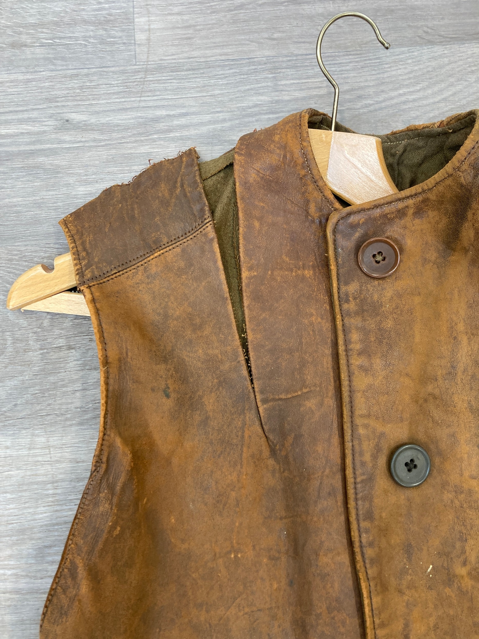 Leather waistcoat right shoulder seems have come undone.