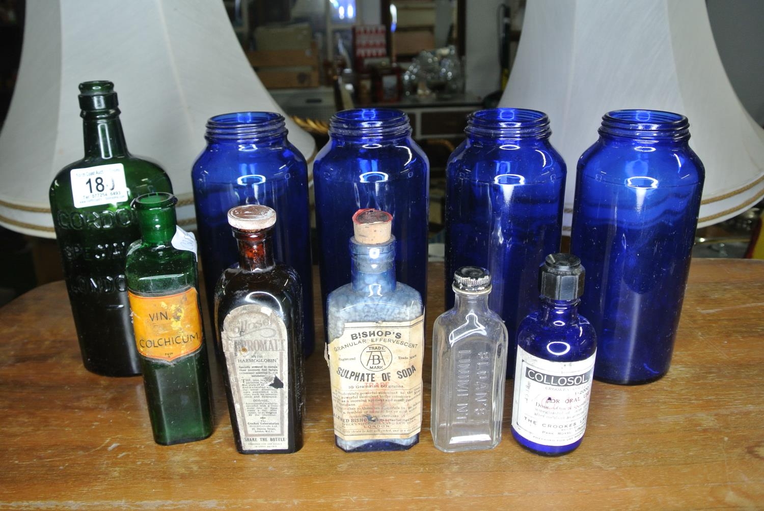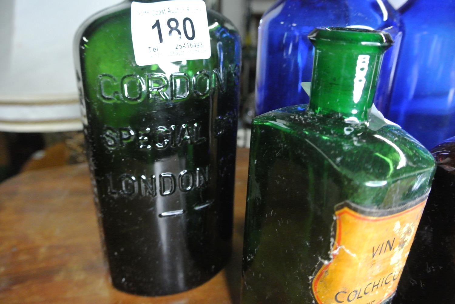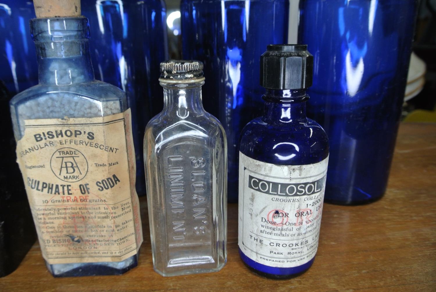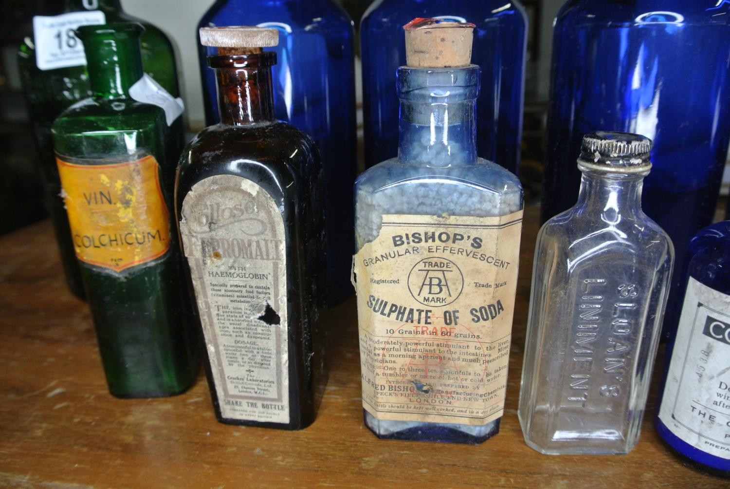 An assortment of antique / vintage bottles to include, 'Bishop's Granular Effervescent', 'Gordon's Special Dry London Gin', 'Slogan's Liniment', and more.