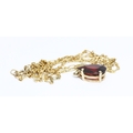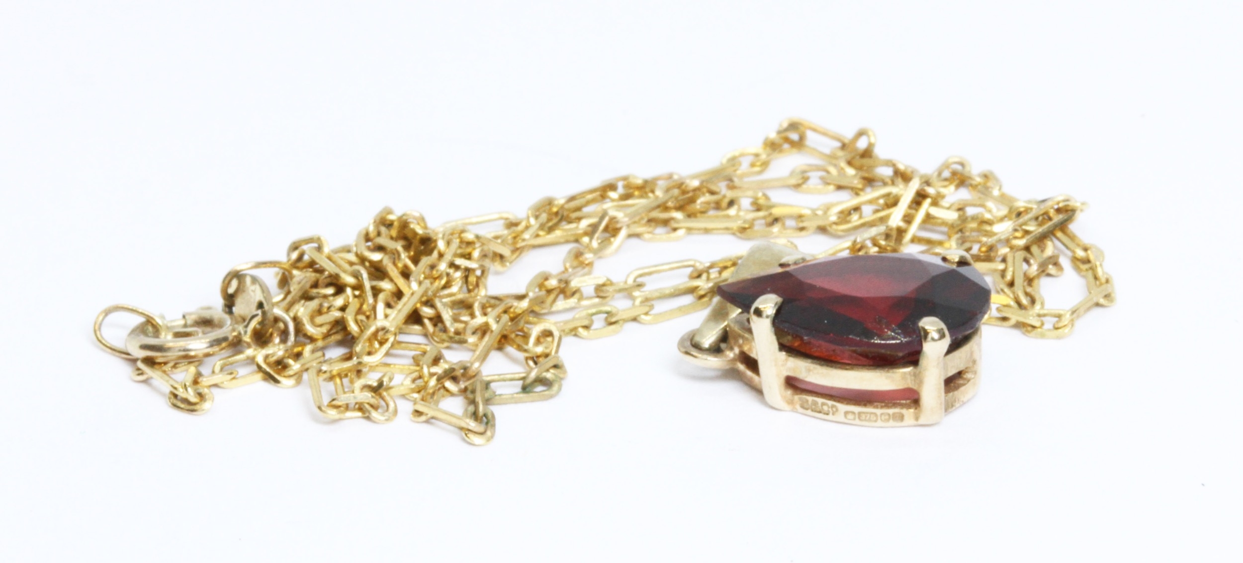 A hallmarked 9ct gold garnet pendant, length 18mm, suspended on 42cm chain, marked with 9ct gold import marks, gross weight 3.8g.