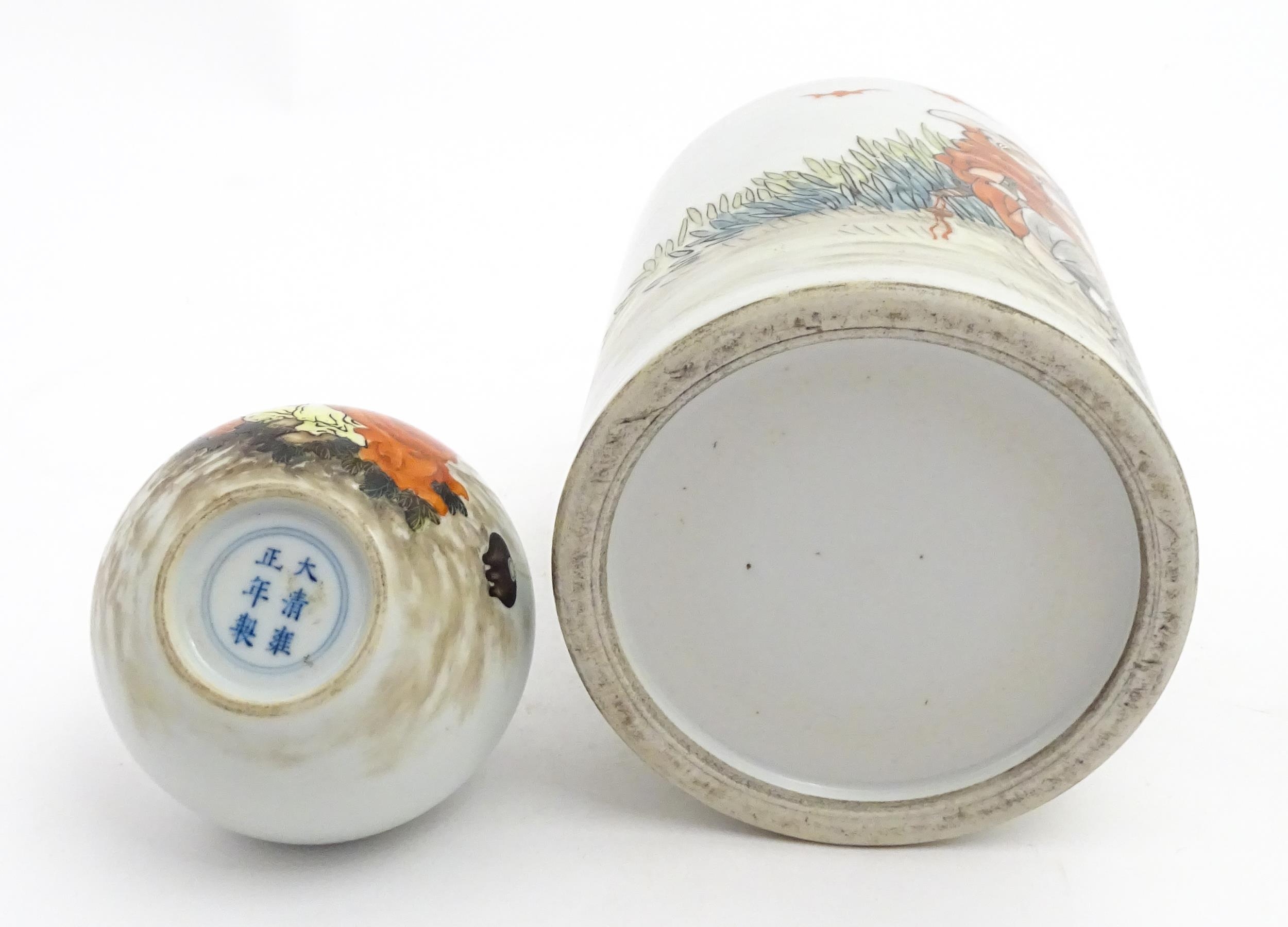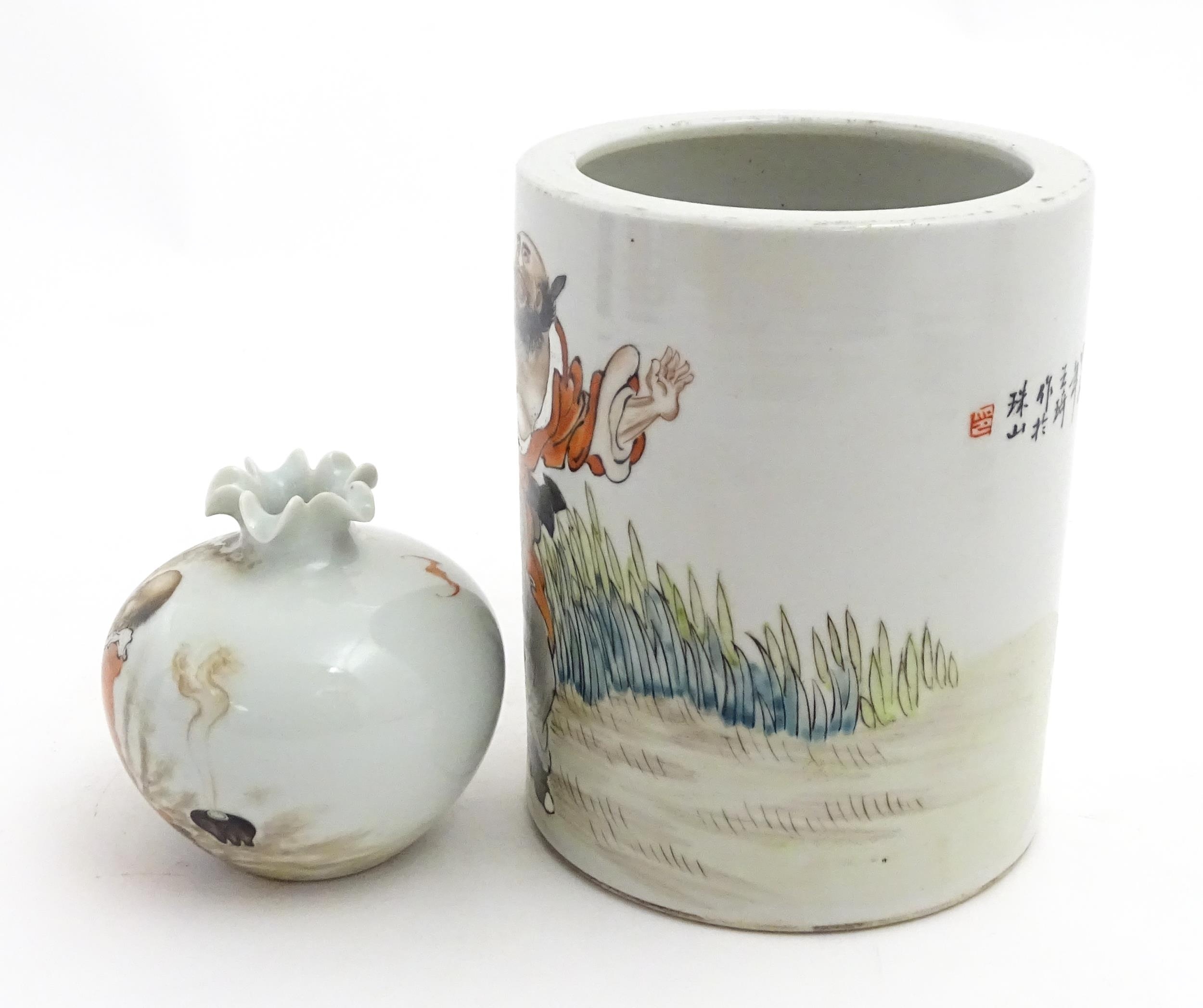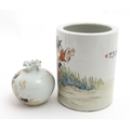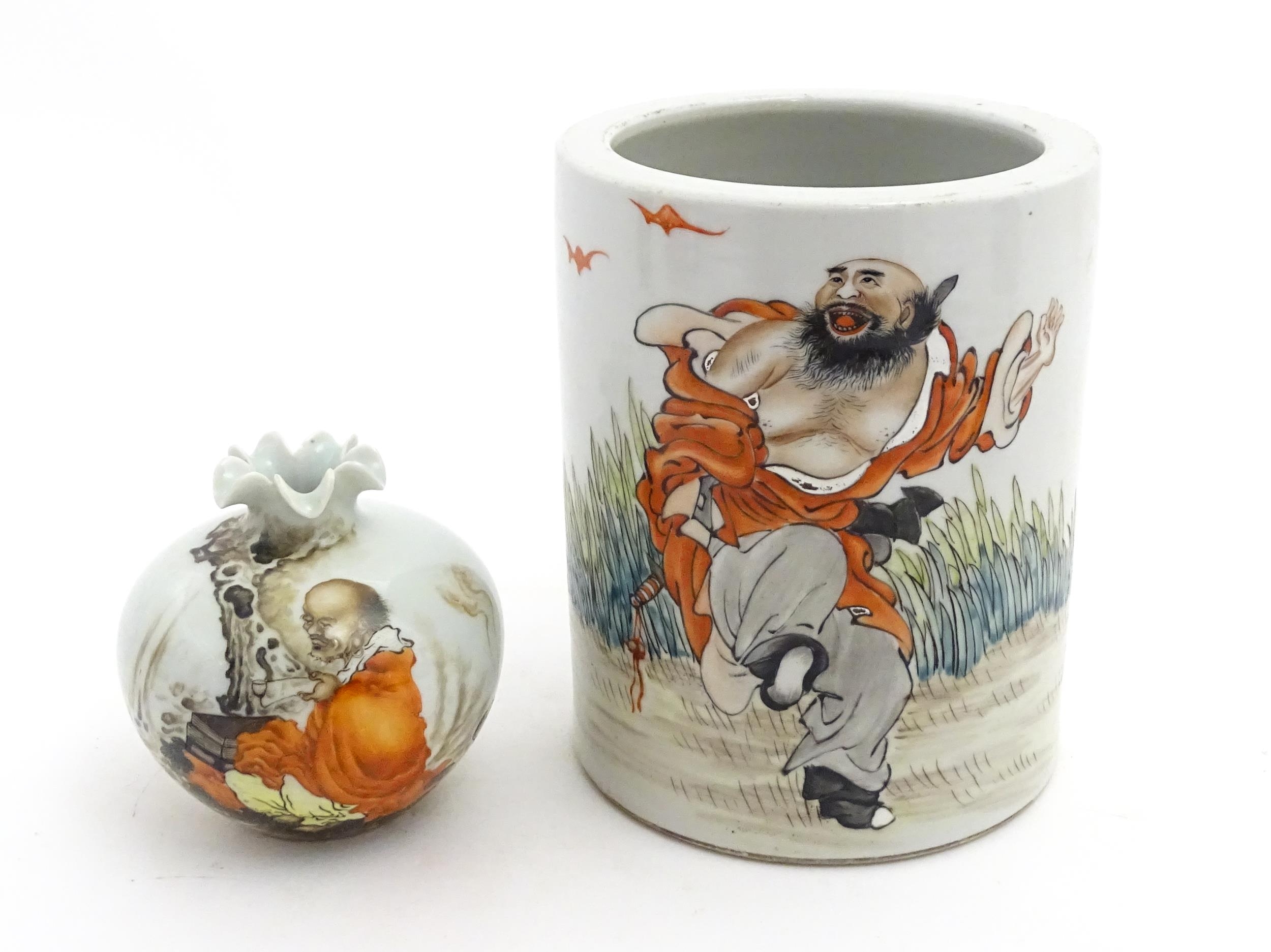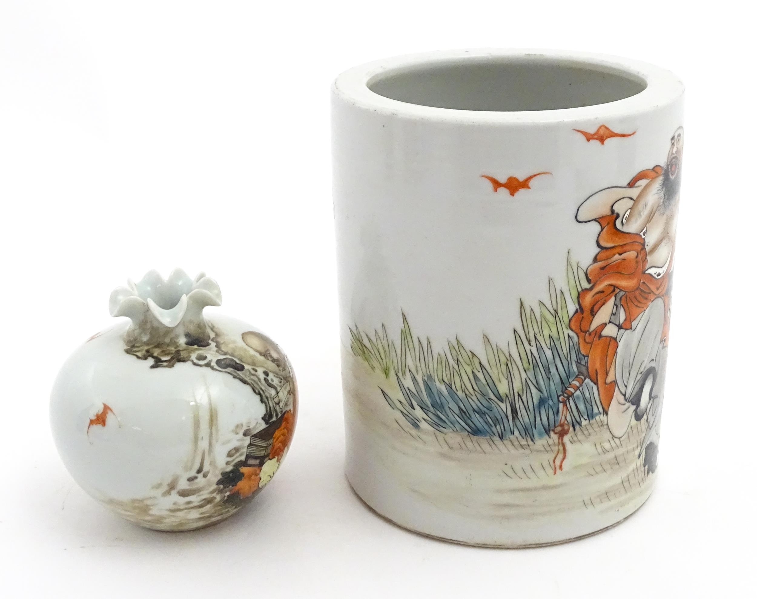 A Chinese brush pot with figural and bat detail with Character script to reverse. Together with a small vase with frilled rim decorated with a figure in a landscape. One with Character marks under. Largest approx. 6" high (2)