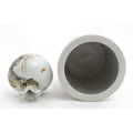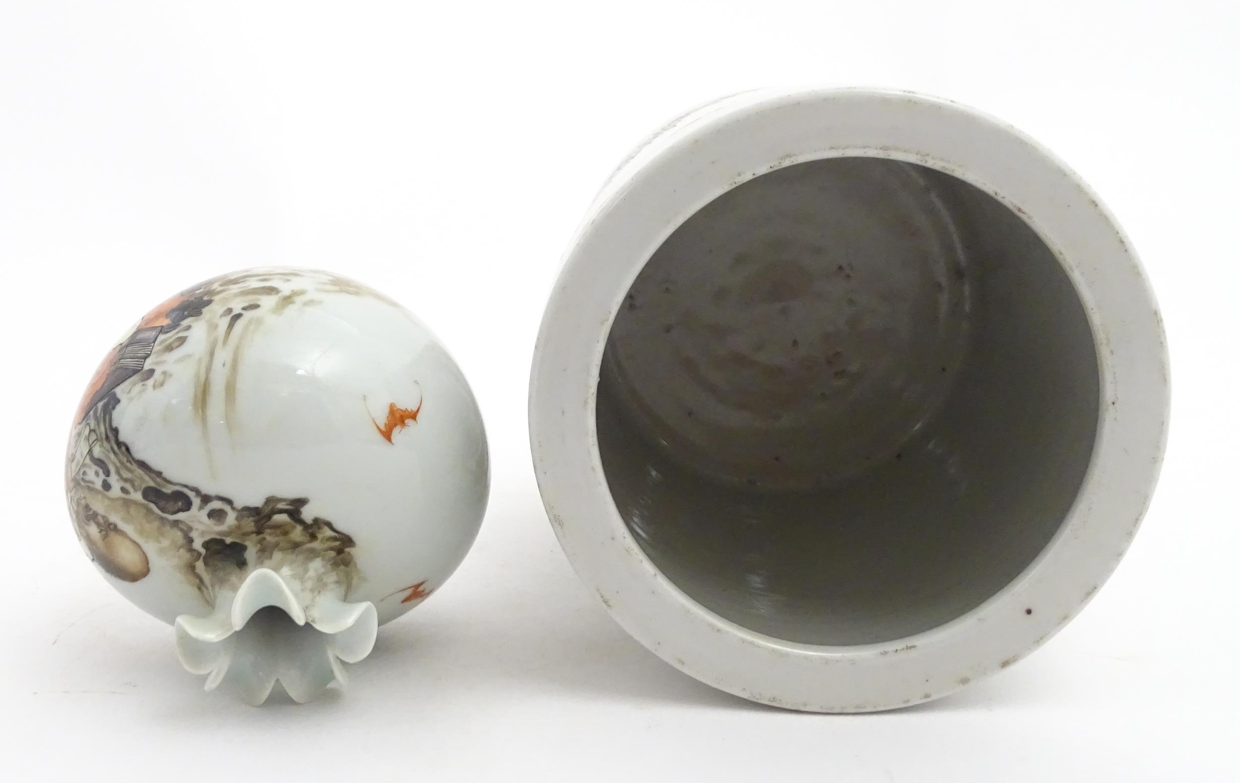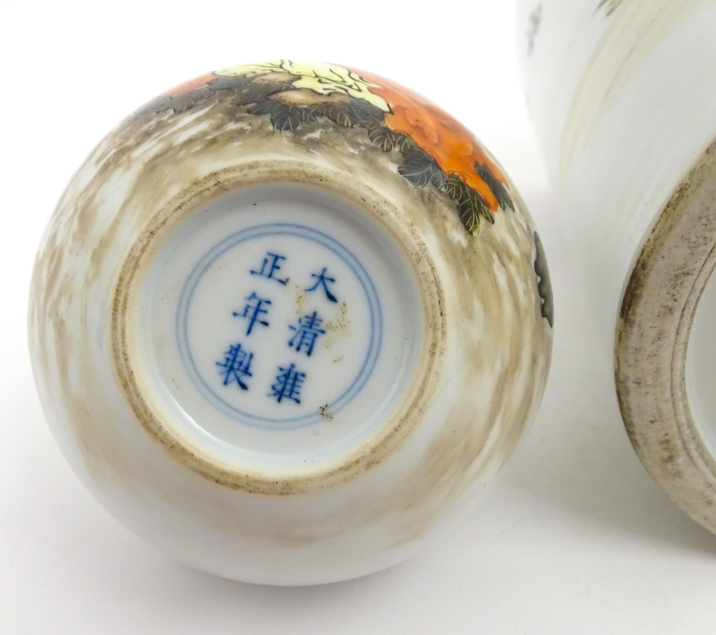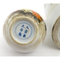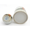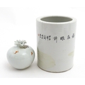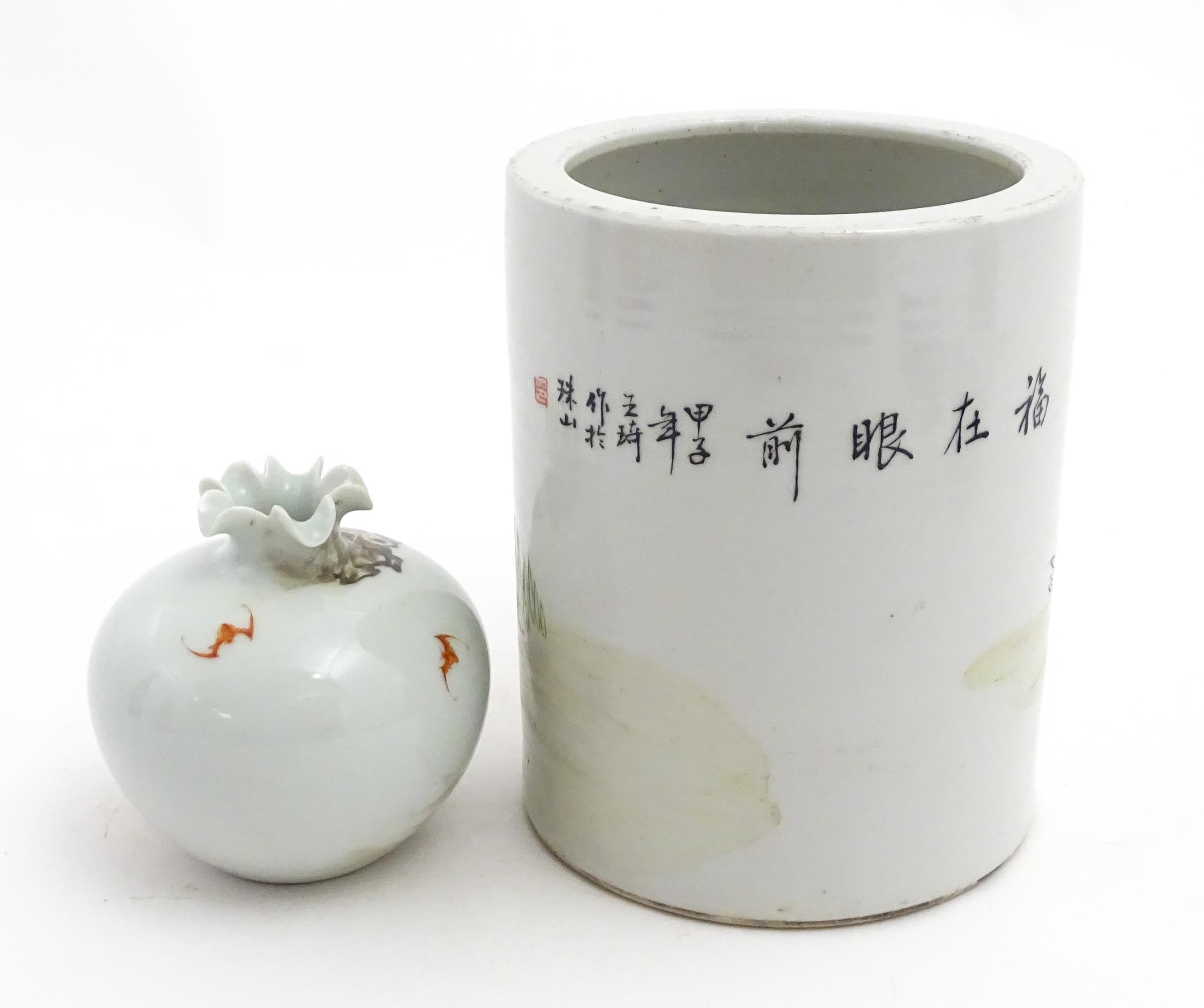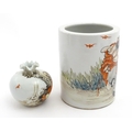 A Chinese brush pot with figural and bat detail with Character script to reverse. Together with a small vase with frilled rim decorated with a figure in a landscape. One with Character marks under. Largest approx. 6" high (2)