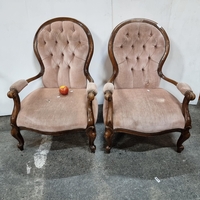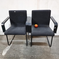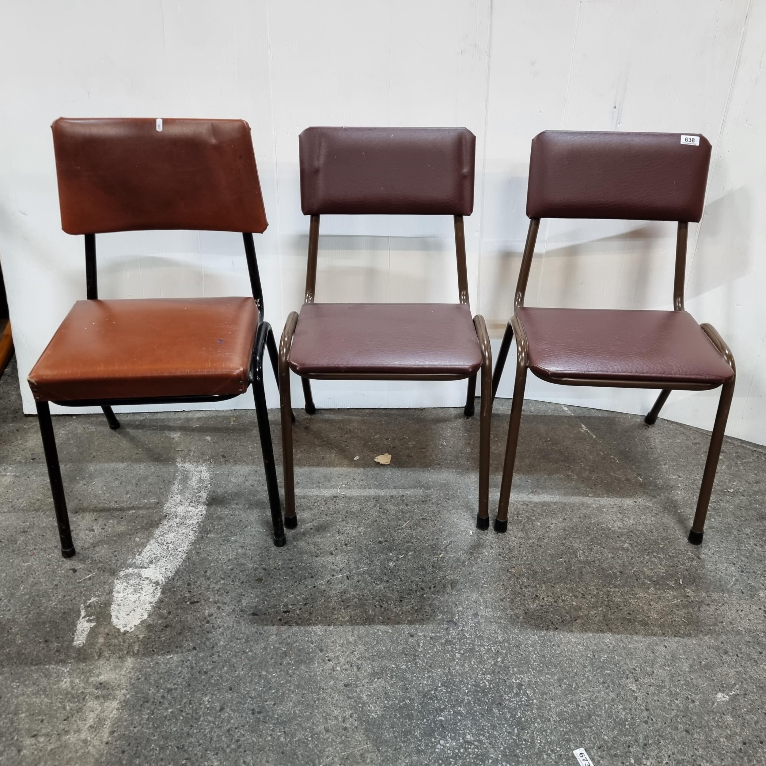 Three vintage schoolchairs with burnt orange and maroon upholstered seats.