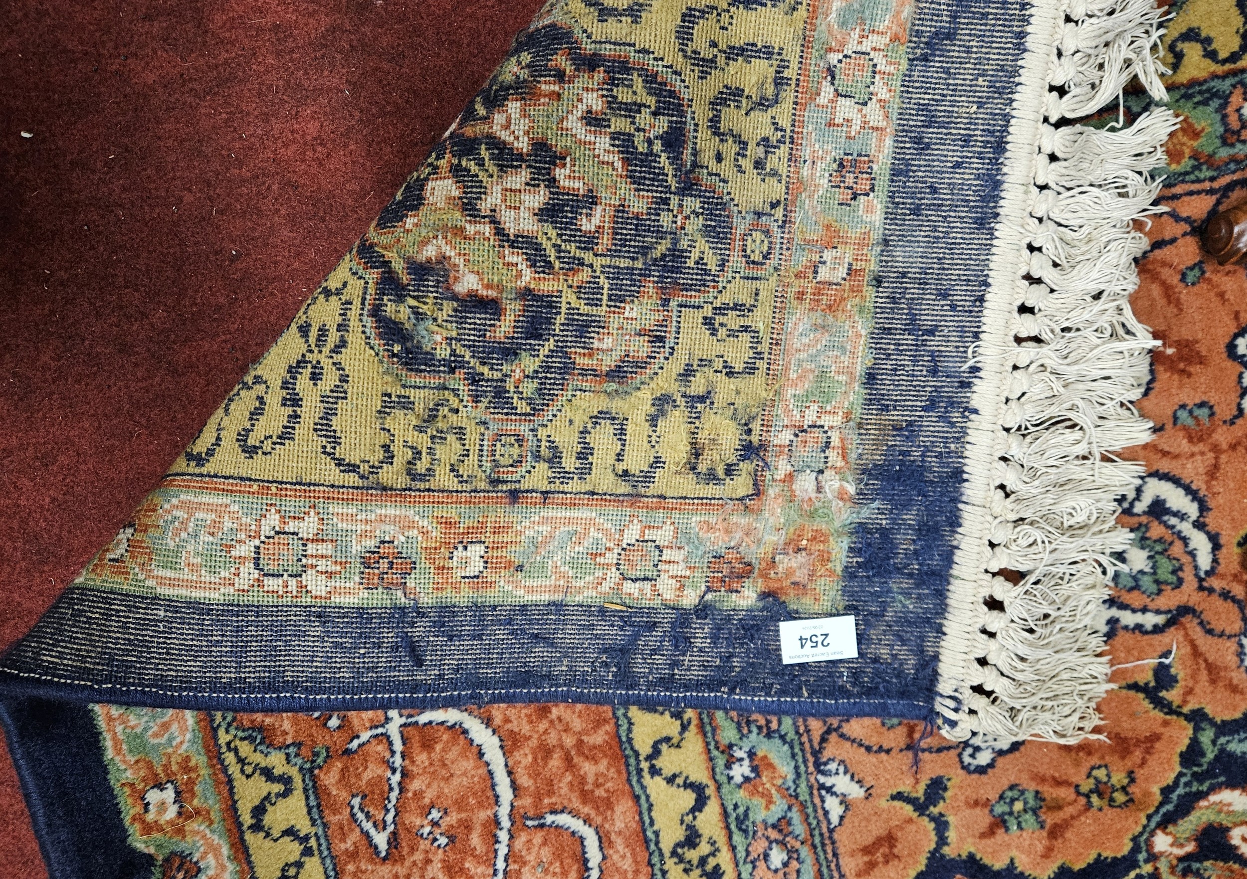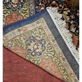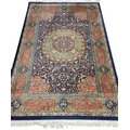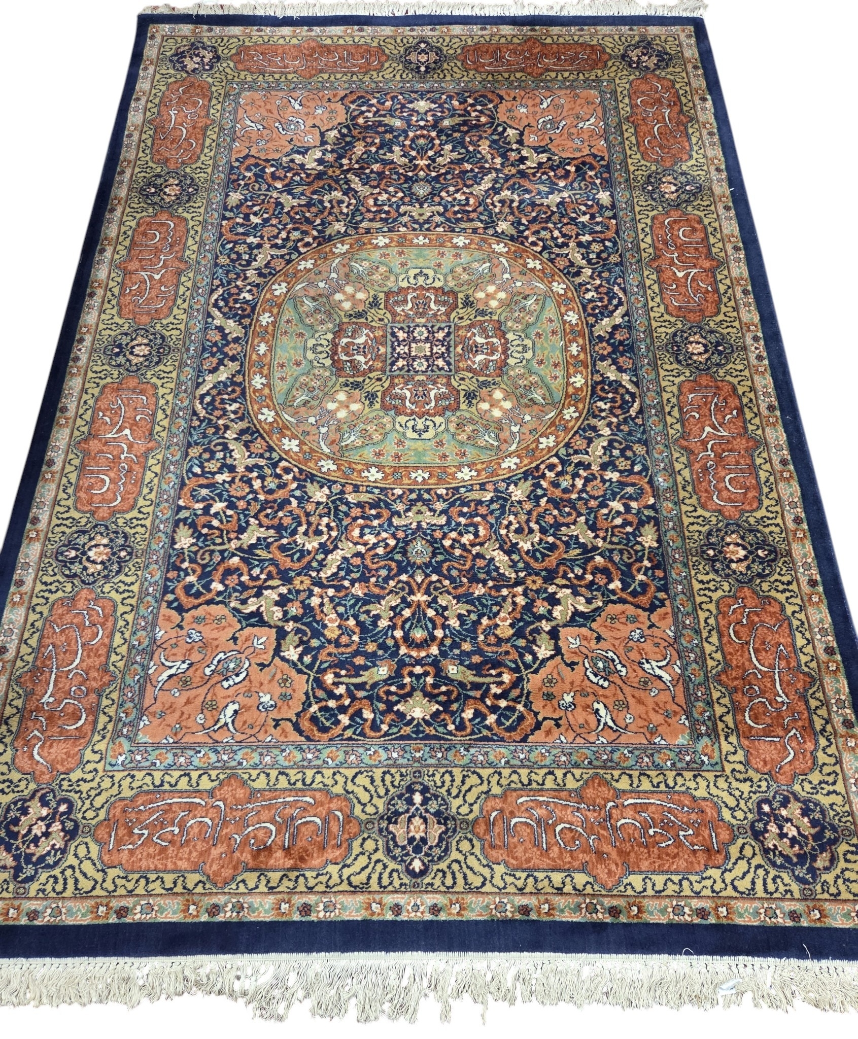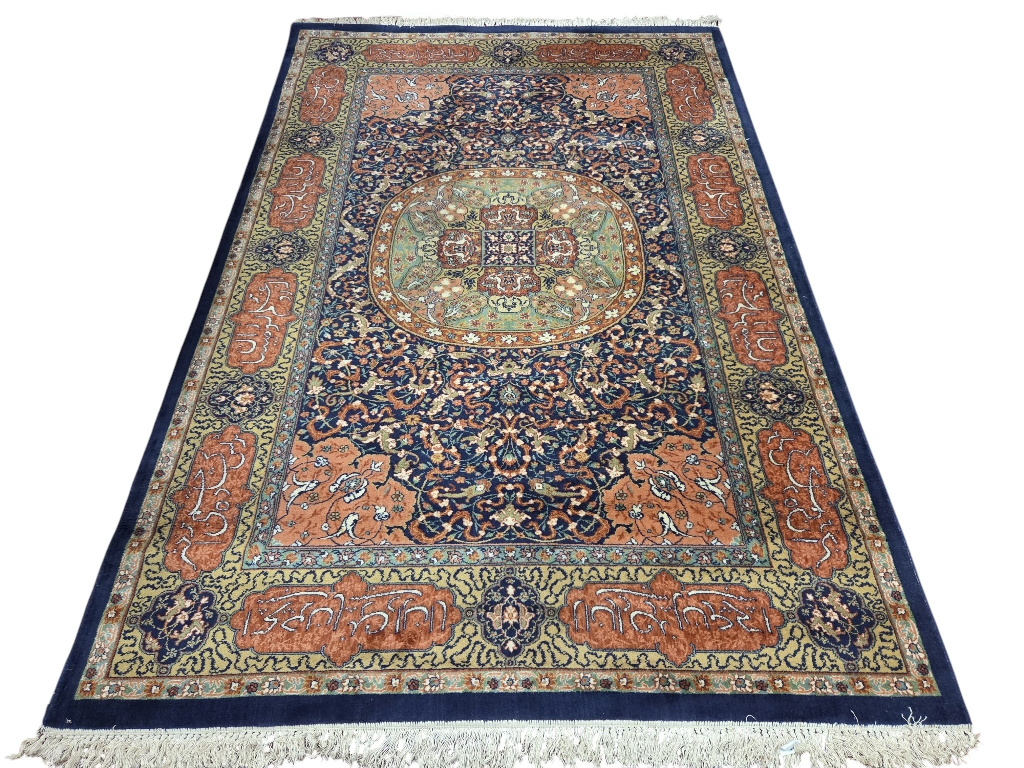 A good Persian Blue ground Carpet, Arabic lettering border and central medallion design. 320 x 203 cm approx.