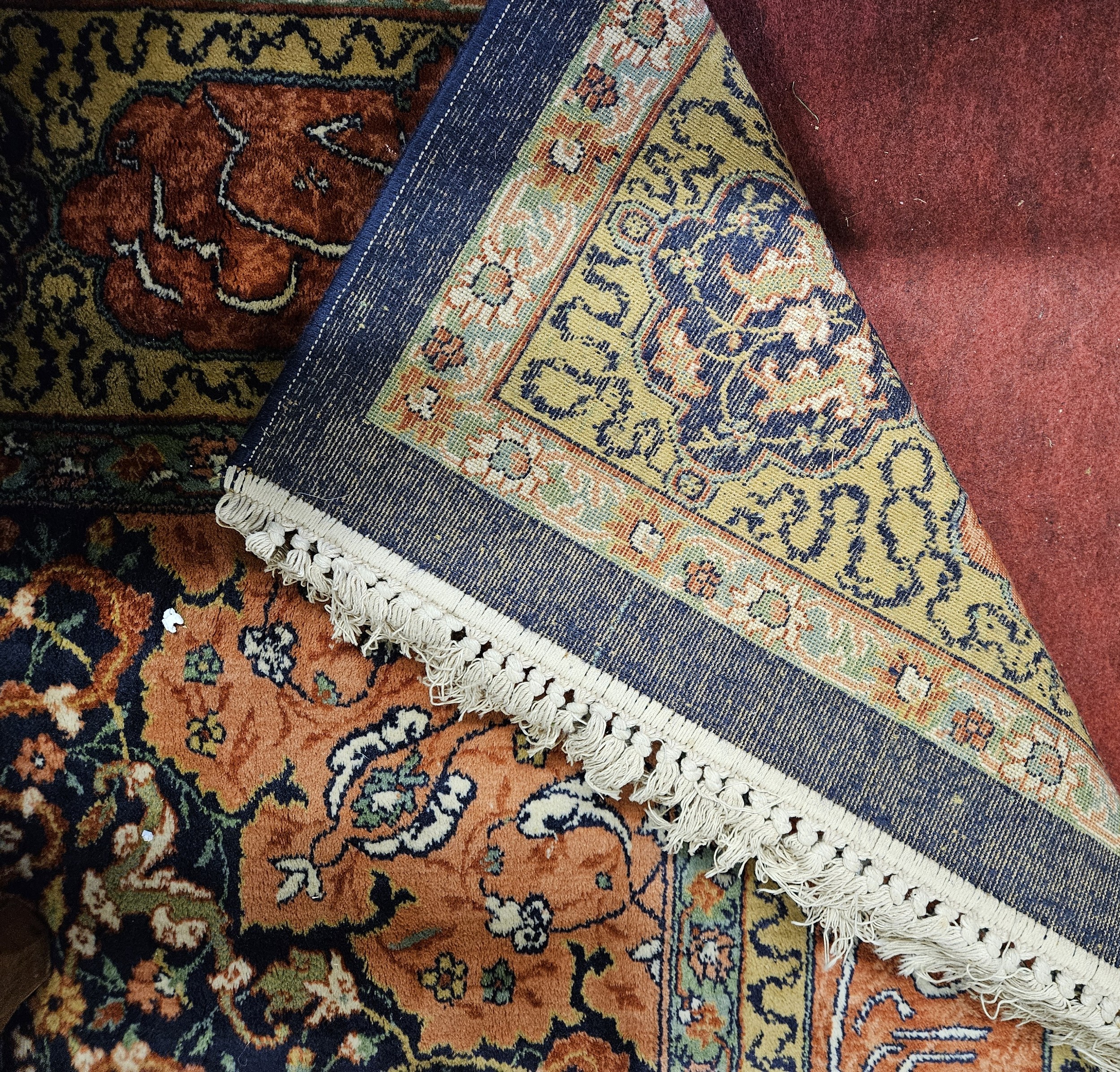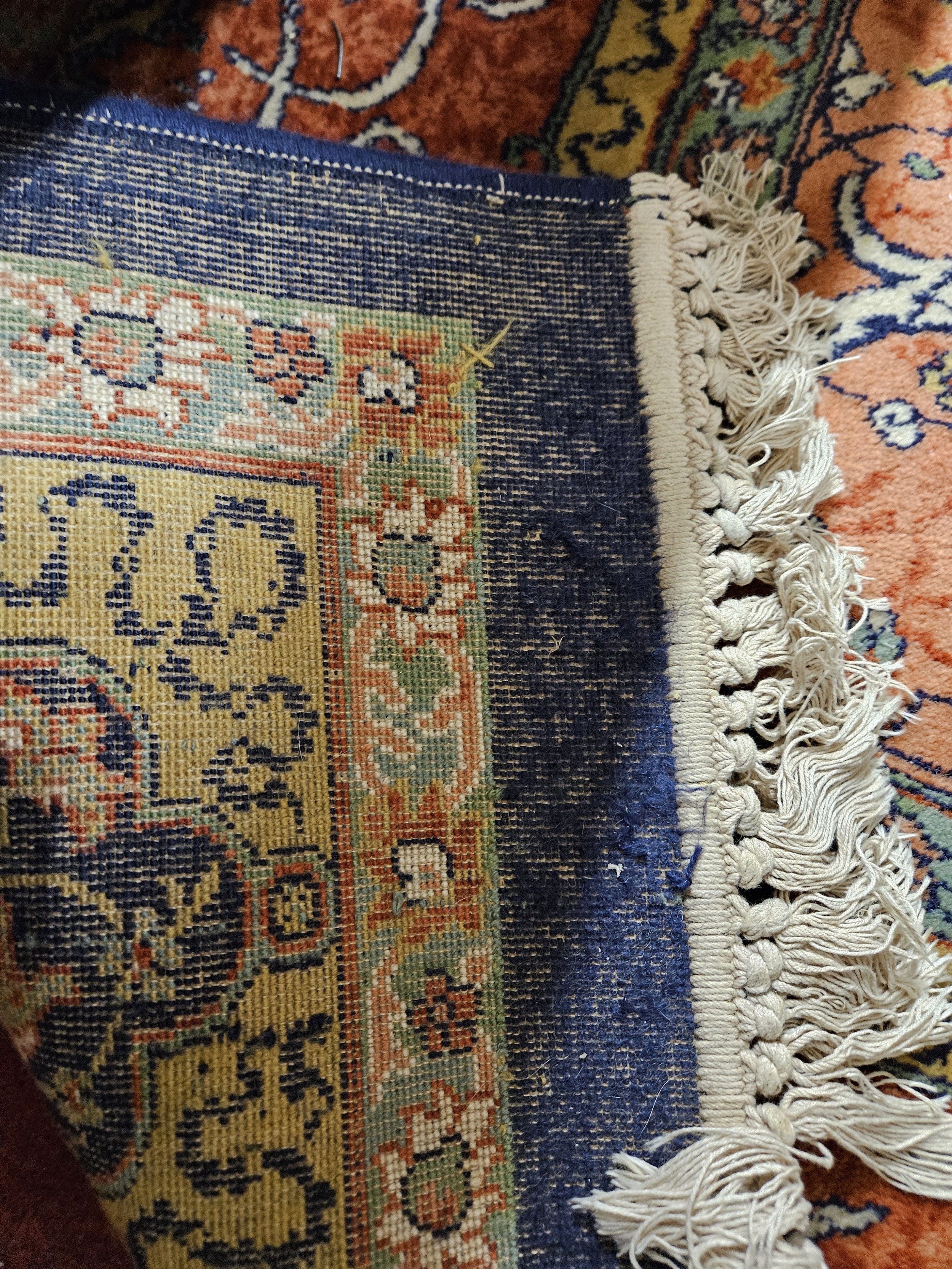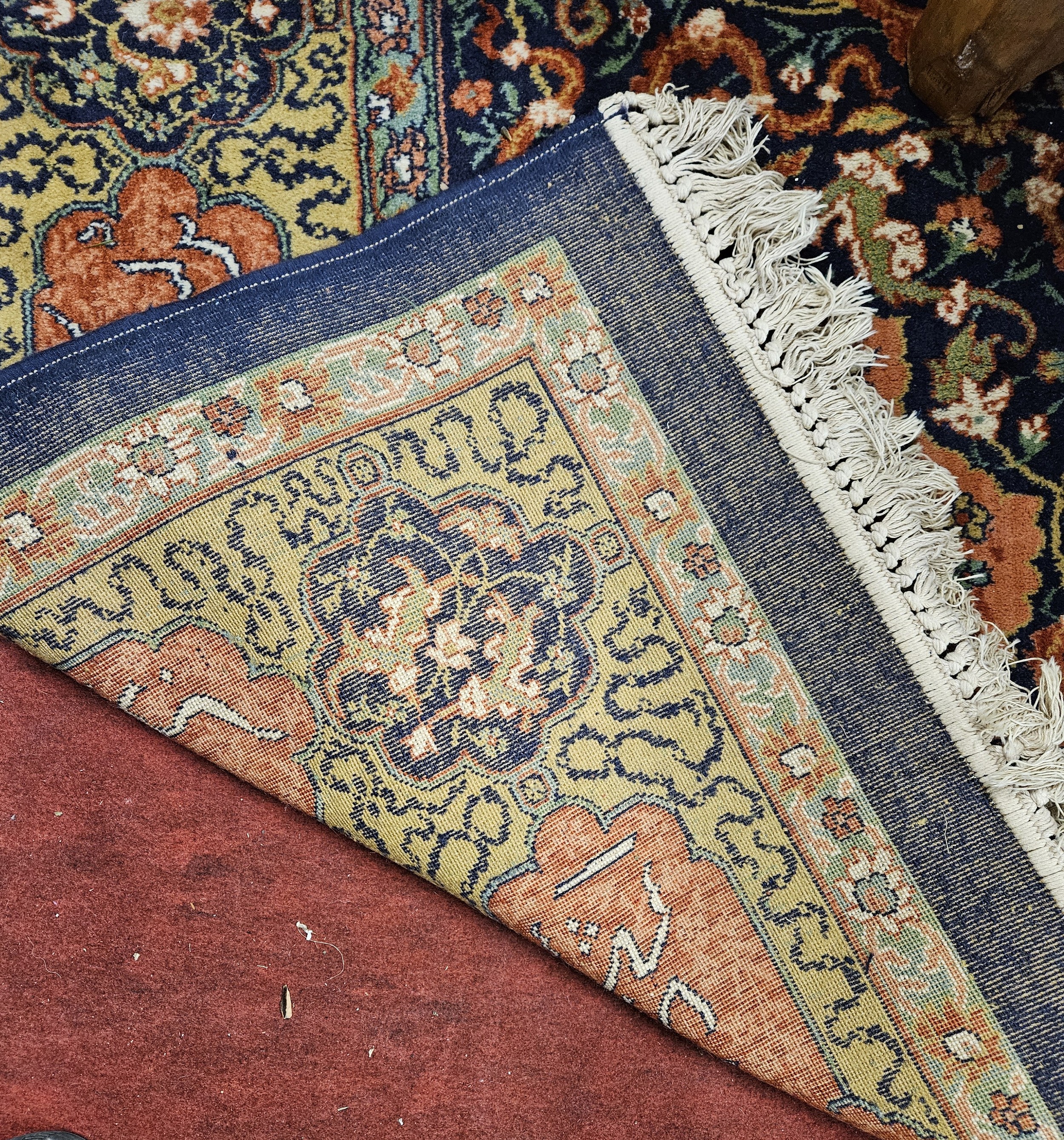 A good Persian Blue ground Carpet, Arabic lettering border and central medallion design. 320 x 203 cm approx.