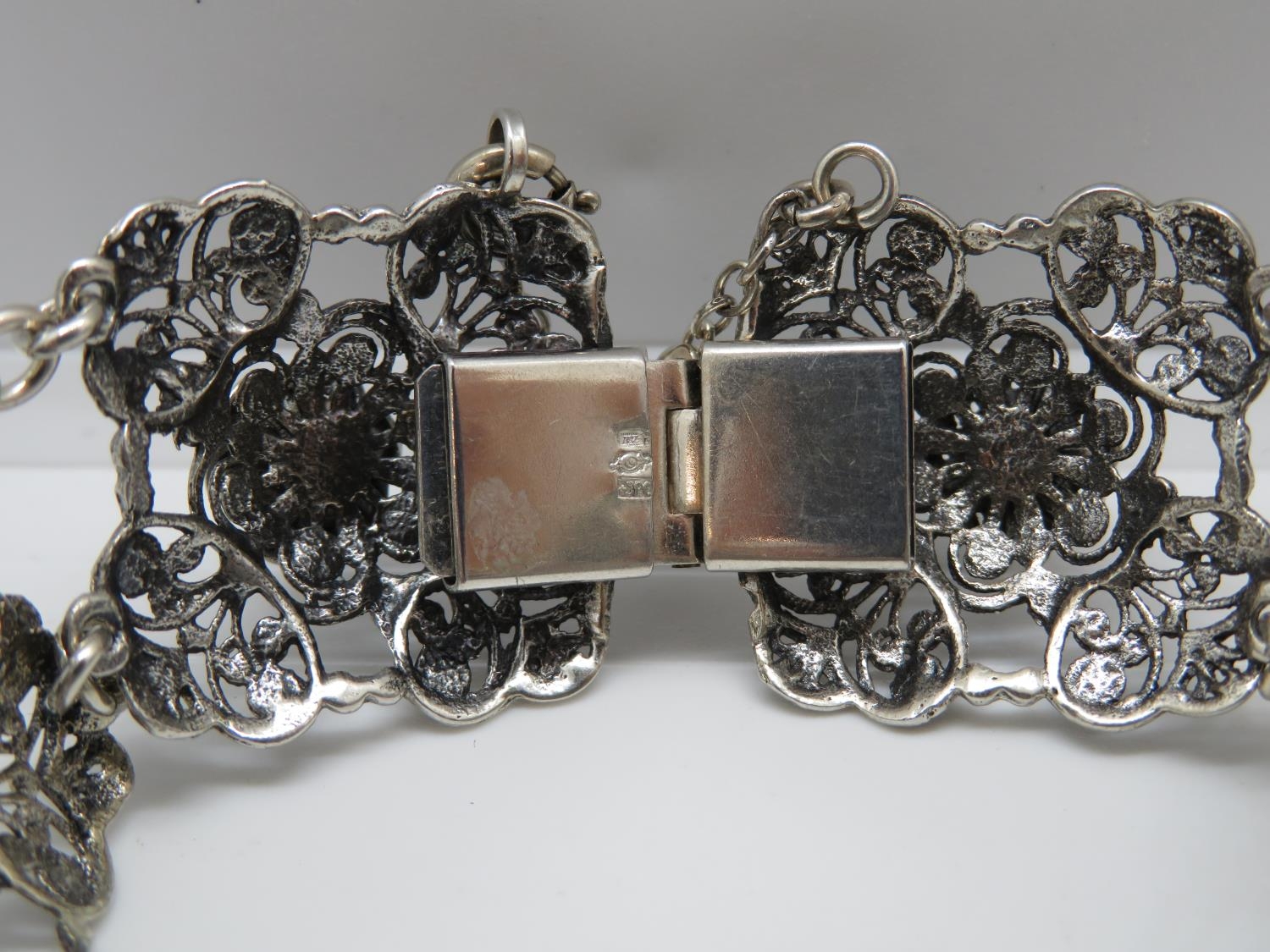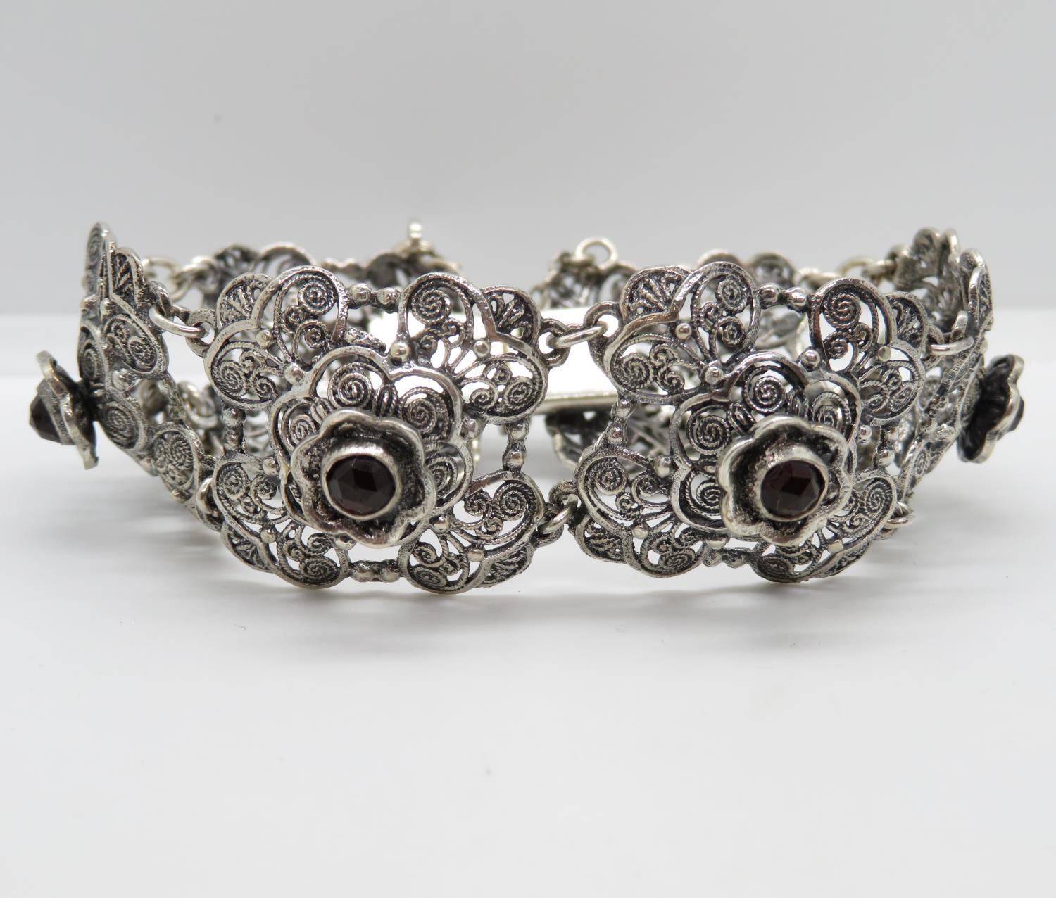 Vintage silver filigree bracelet 7" long set with garnets 23.5g