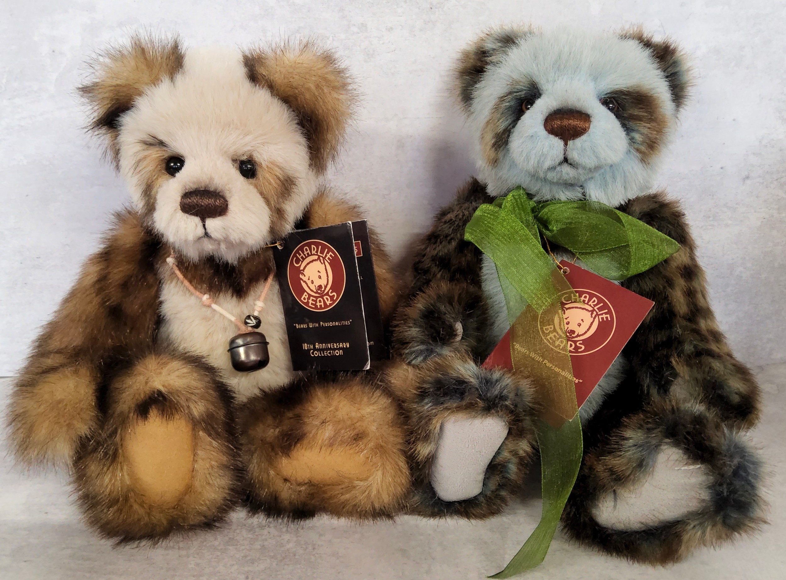 Charlie Bears 10th Anniversary Collection - Anniversary Mia CB151560 exclusively designed by Isabelle Lee with jointed arms and legs, stitched nose, bell necklace, original tags (height in bear paws 10) 2015; another Niall exclusively designed by Isabelle Lee with jointed arms and legs, stitched nose, green bow, original tags (height in bear paws 10) 2015 (2)