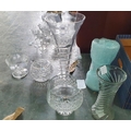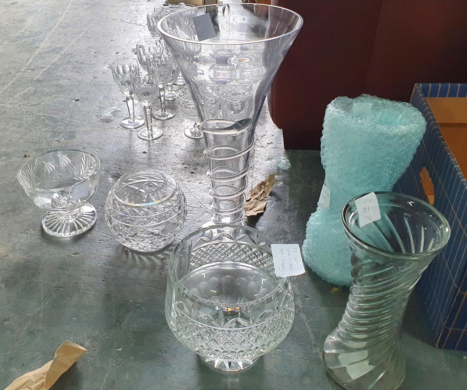 Large modern swirl decorated trumpt shaped glass vase together with other cut glass items (Qty)