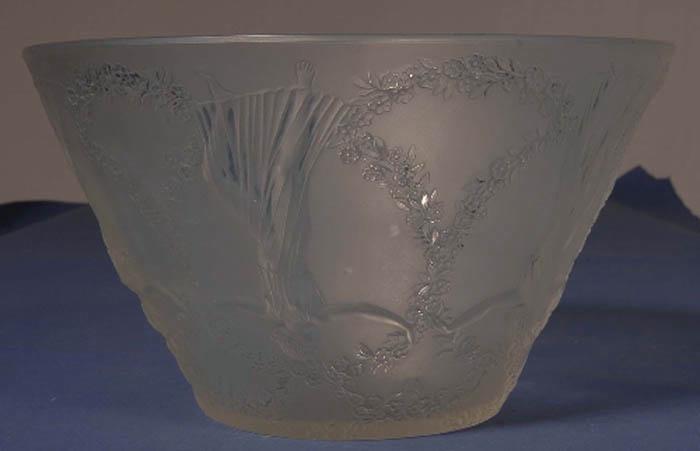 Lalique style iridescent glass bowl with dancing maidens upside down - no marks found (diameter 35cm, H15cm approx) -