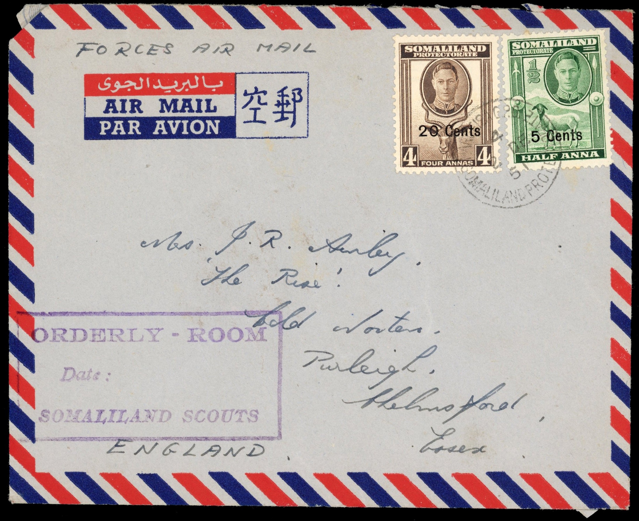 1951 airmail envelope to Essex with 5c on 4a and 5c on ½a, Hargeisa GPO CDS of 2 DE.  Endorsed 'FORCES AIR MAIL and with boxed ORDERLYROOM/ SOMALILAND SCOUTS violet cach