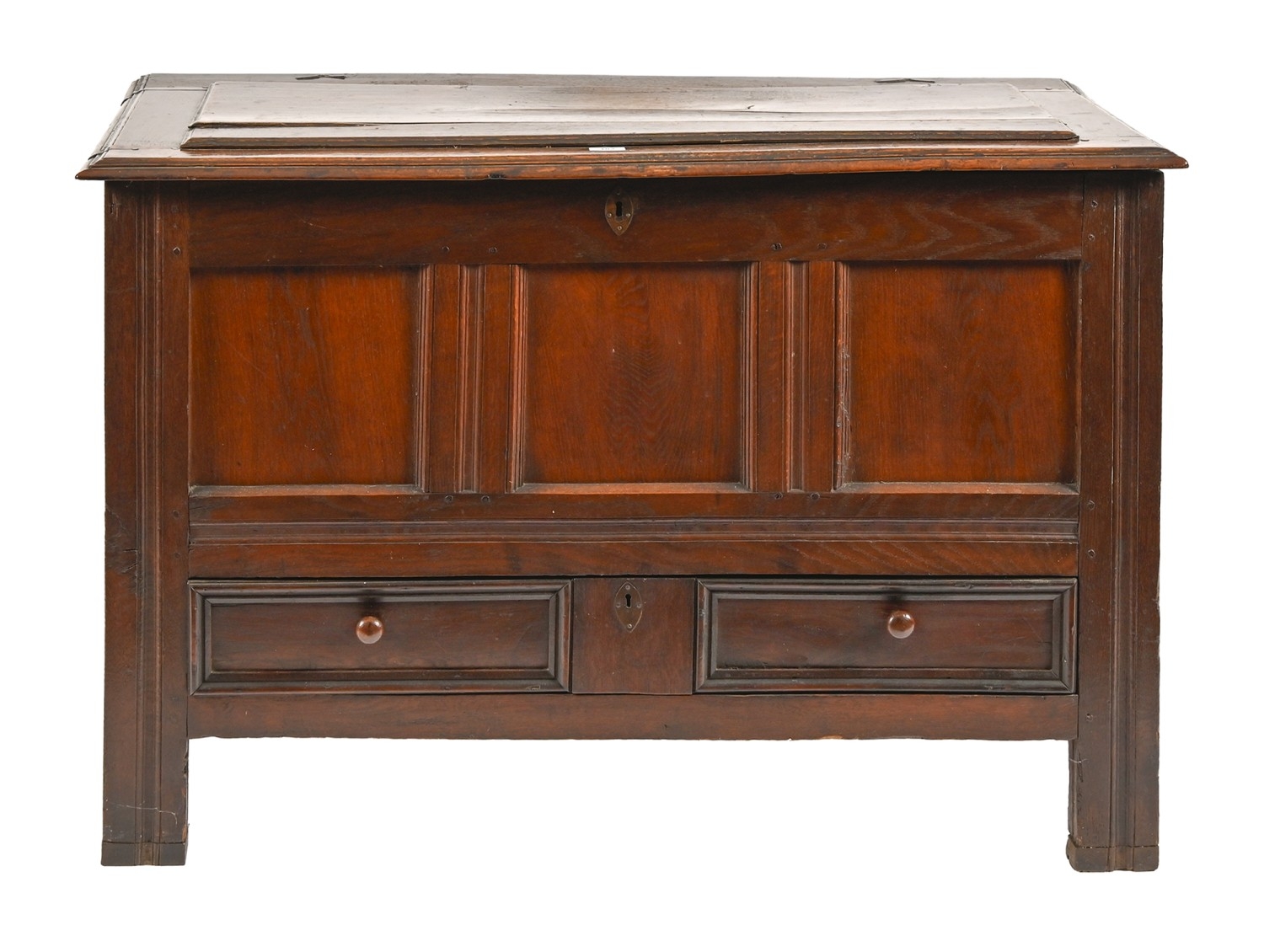 A George II oak mule chest, the altered lid with ovolo lip above three plain panels and two moulded drawers, on channelled stiles, 116cm long