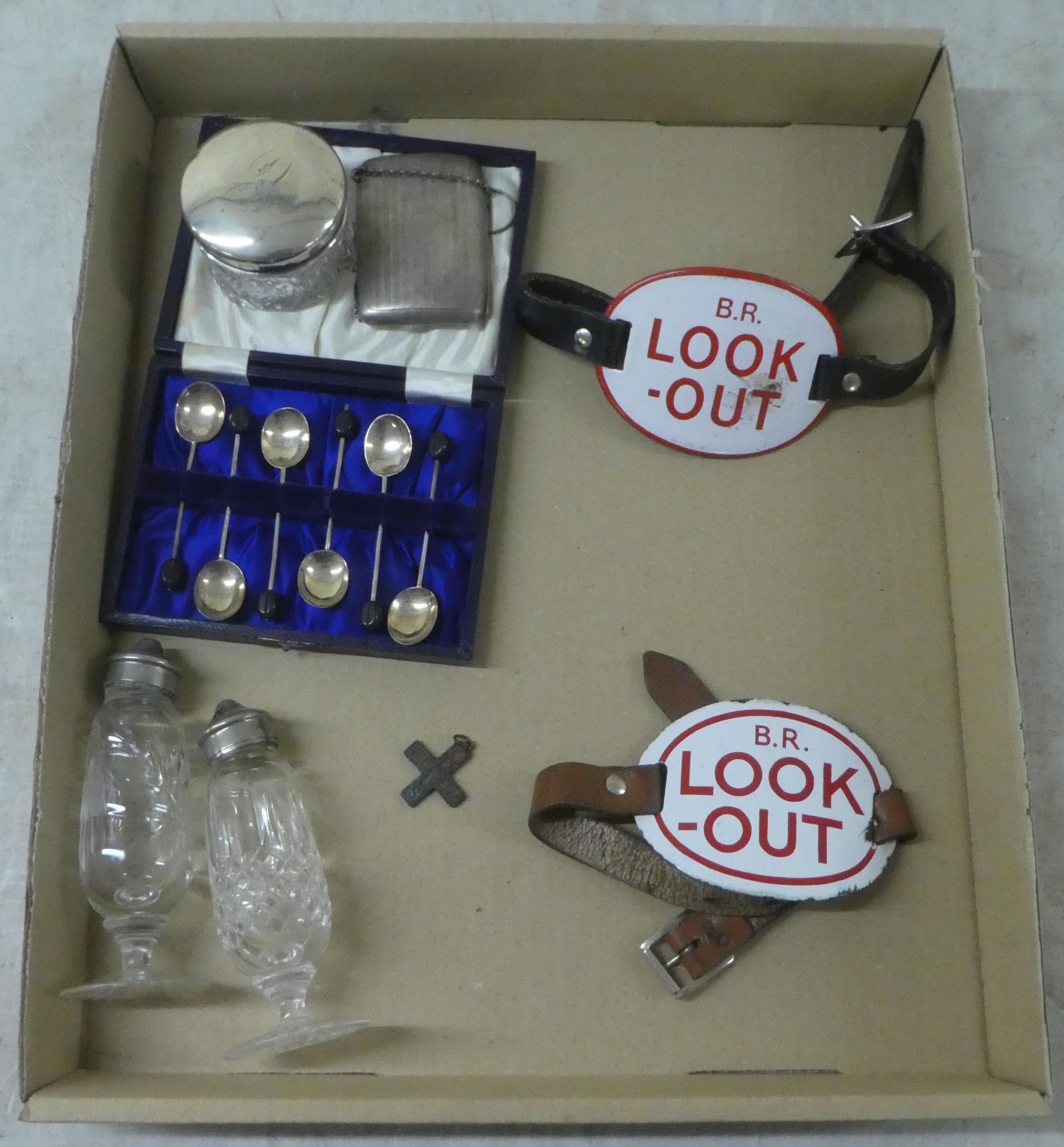 Small collectables: to include six silver bean terminal coffee spoons Sheffield marks; and two British Rail 'Look Out' enamelled metal arm plates