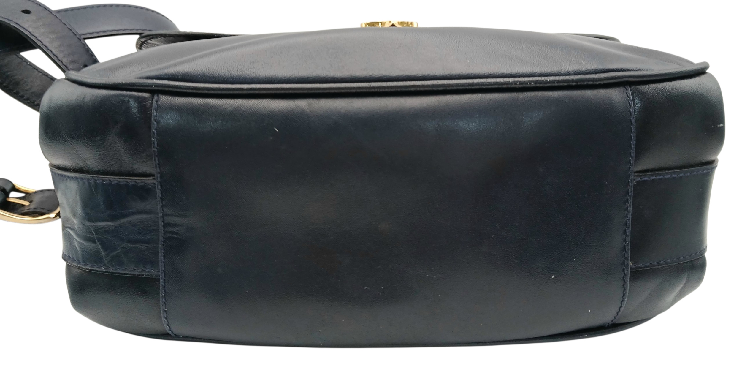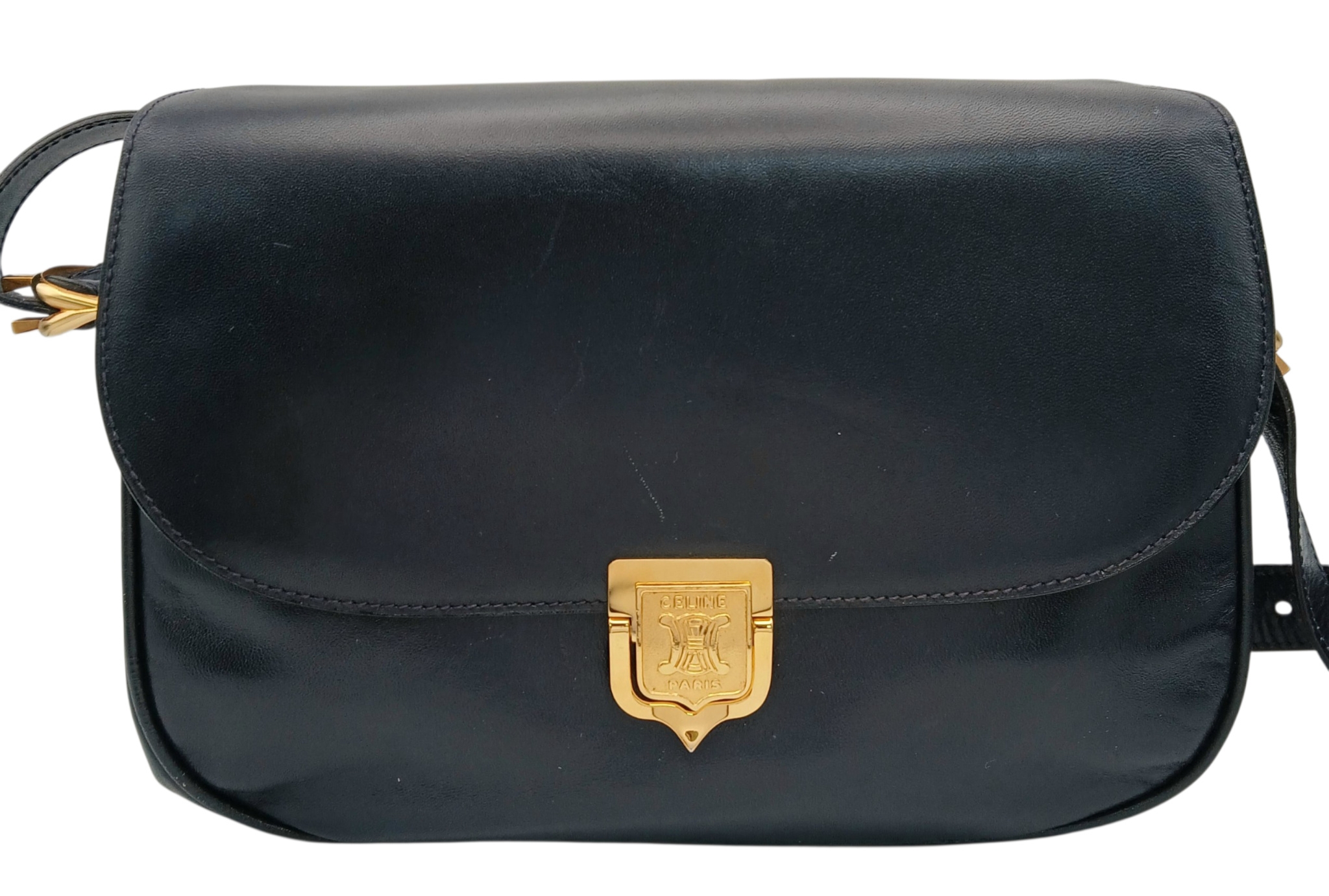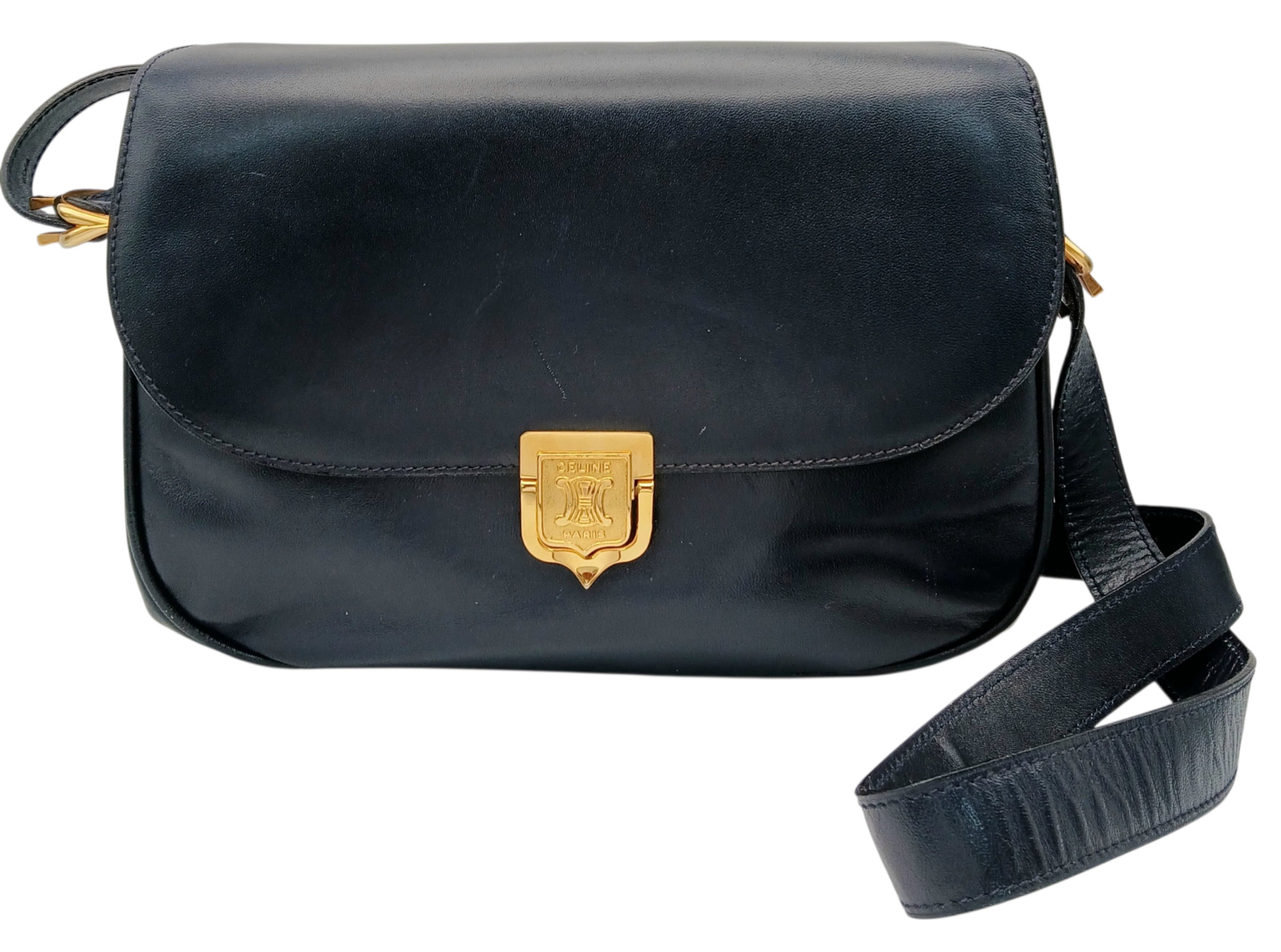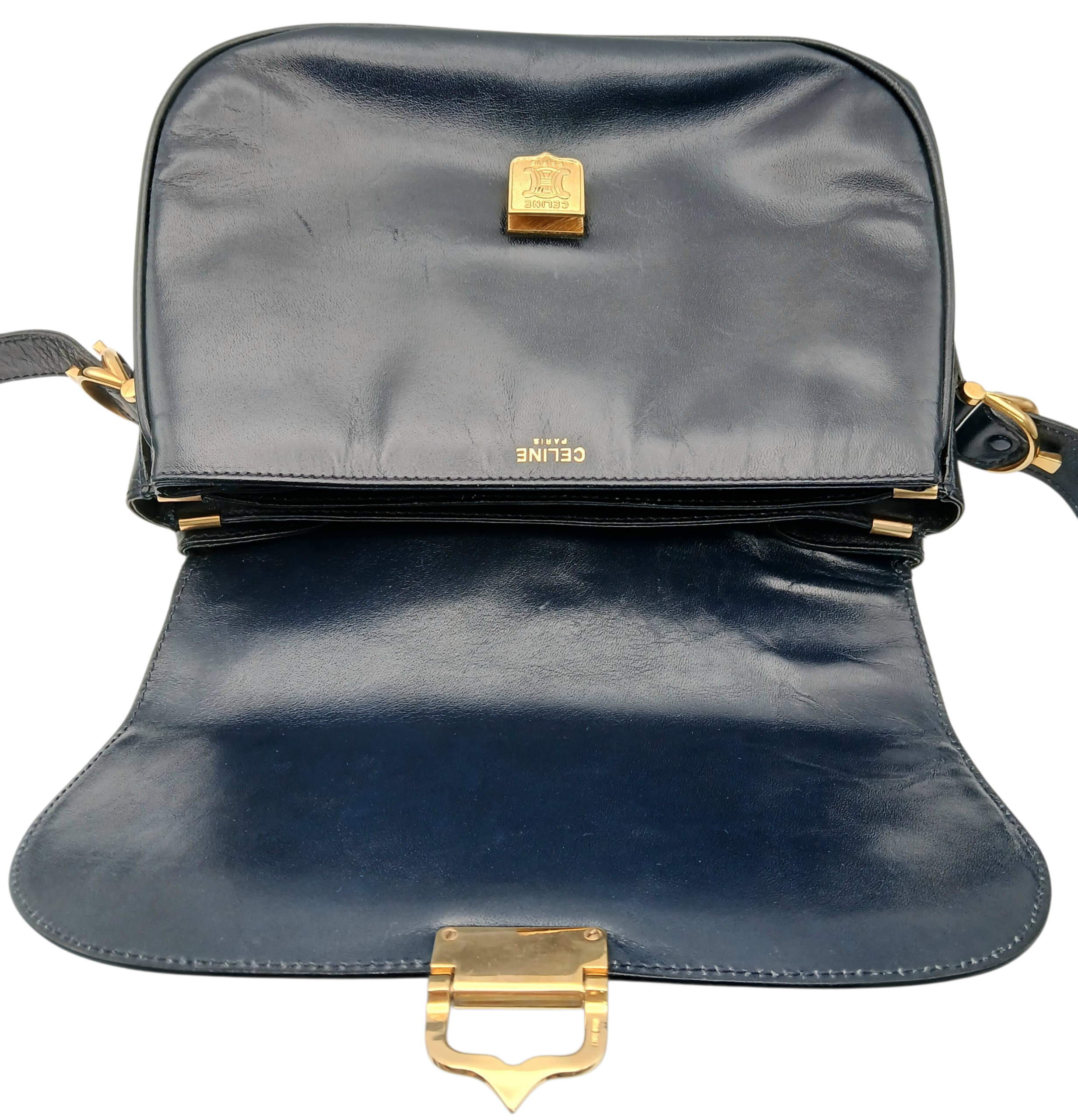 A Céline Vintage Navy Triomphe Shoulder Bag. Navy leather exterior with gold-tone hardware, Triomphe push-lock closure, adjustable shoulder strap and structured flap design. Beige leather interior with multiple compartments and a zipped pocket. Approximate size: 25cm length x 17cm height. Scratches and light creasing to the leather exterior. Please see photos for details condition or request a condition report. Ref: 27514