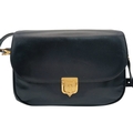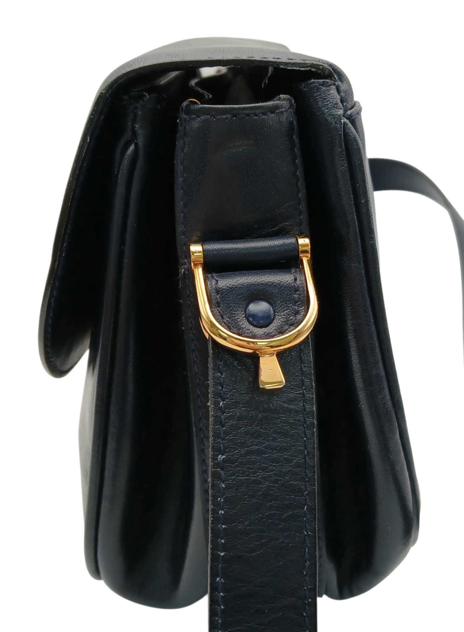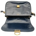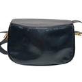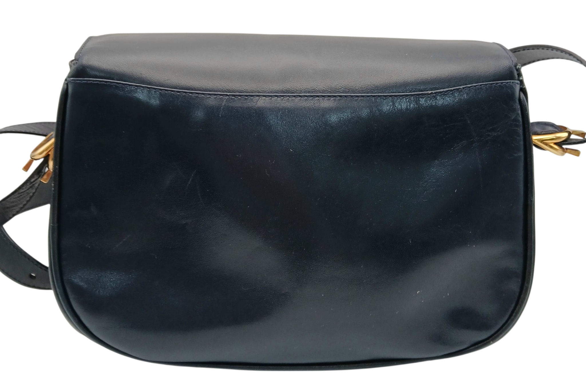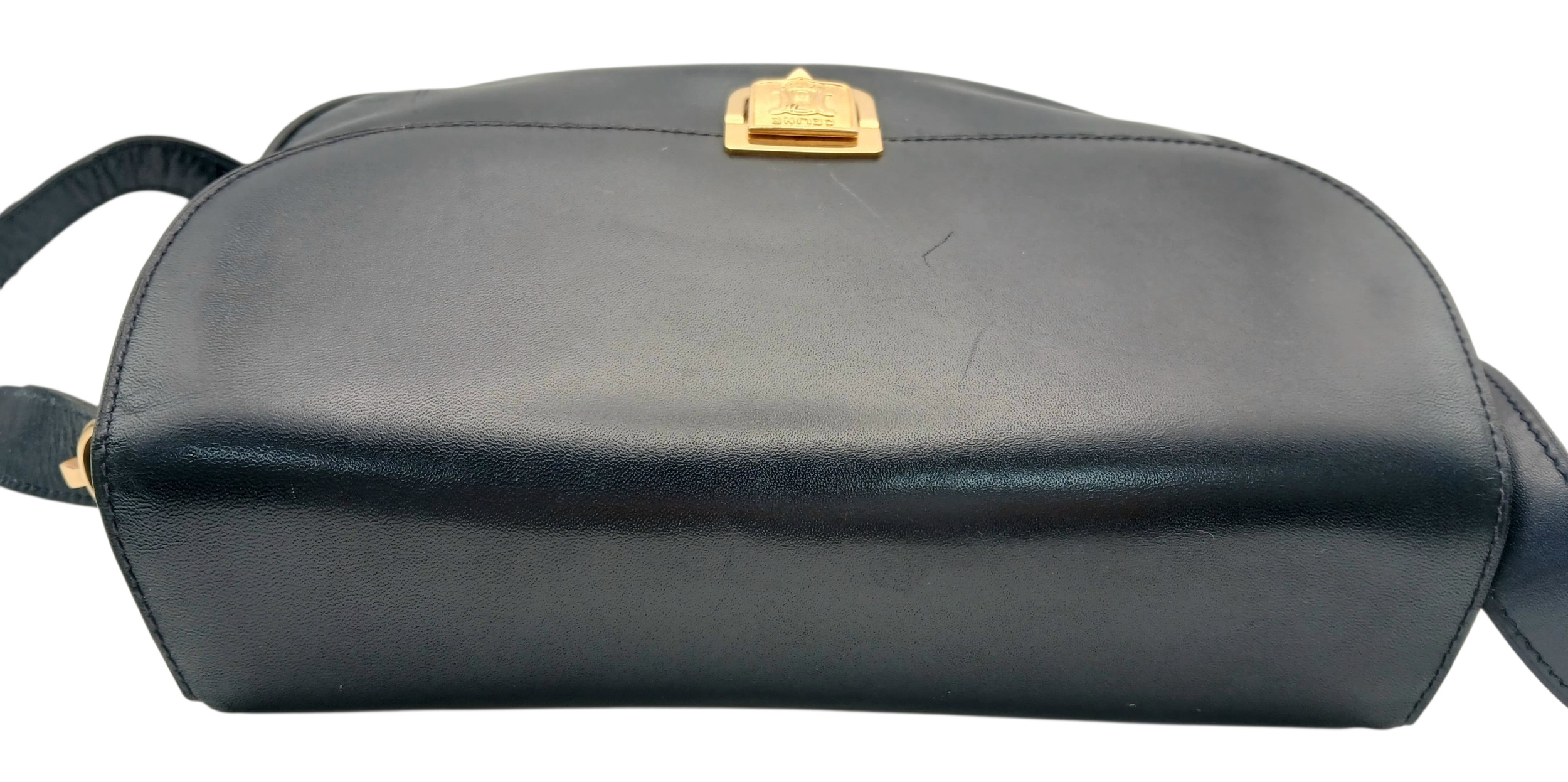 A Céline Vintage Navy Triomphe Shoulder Bag. Navy leather exterior with gold-tone hardware, Triomphe push-lock closure, adjustable shoulder strap and structured flap design. Beige leather interior with multiple compartments and a zipped pocket. Approximate size: 25cm length x 17cm height. Scratches and light creasing to the leather exterior. Please see photos for details condition or request a condition report. Ref: 27514