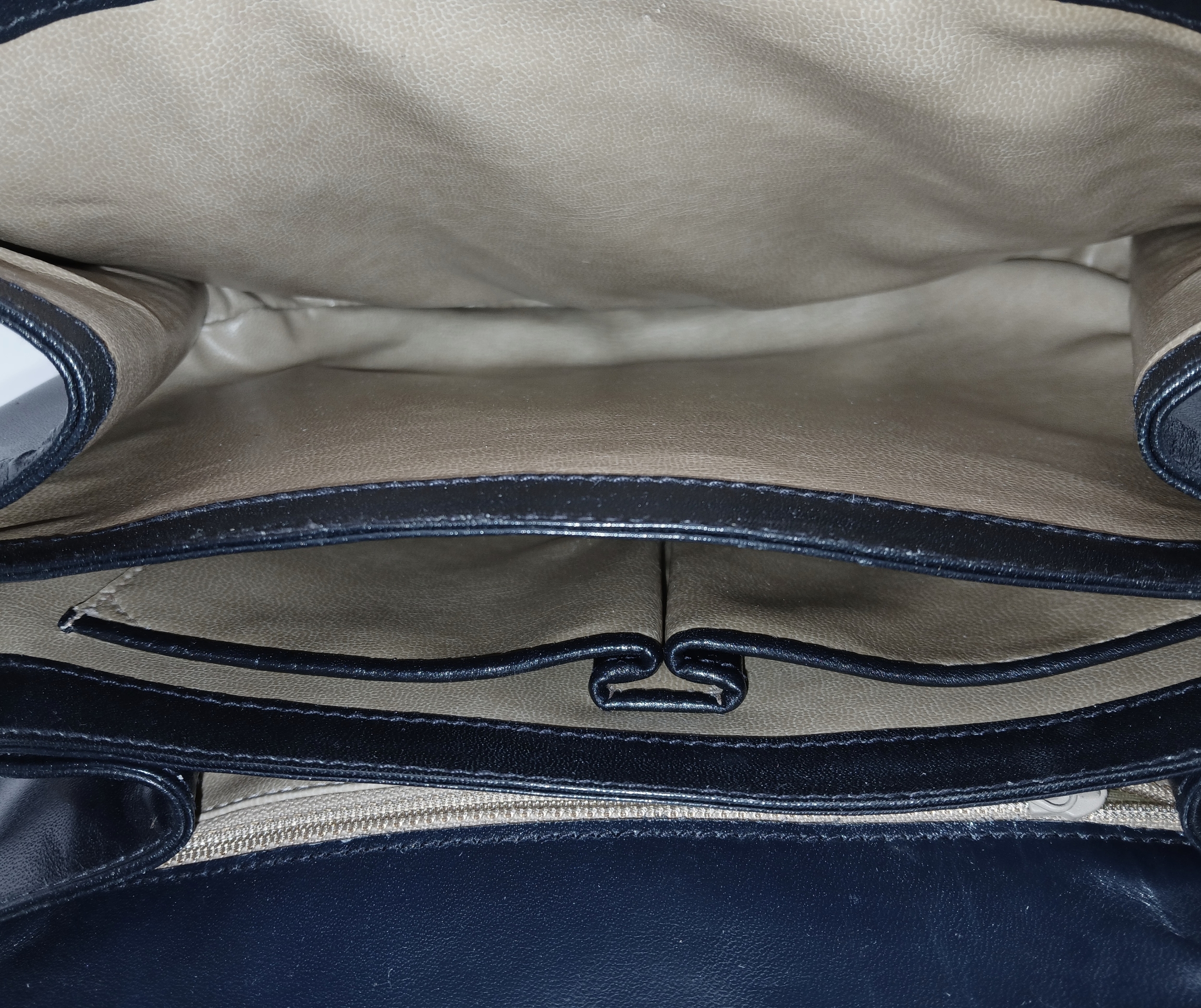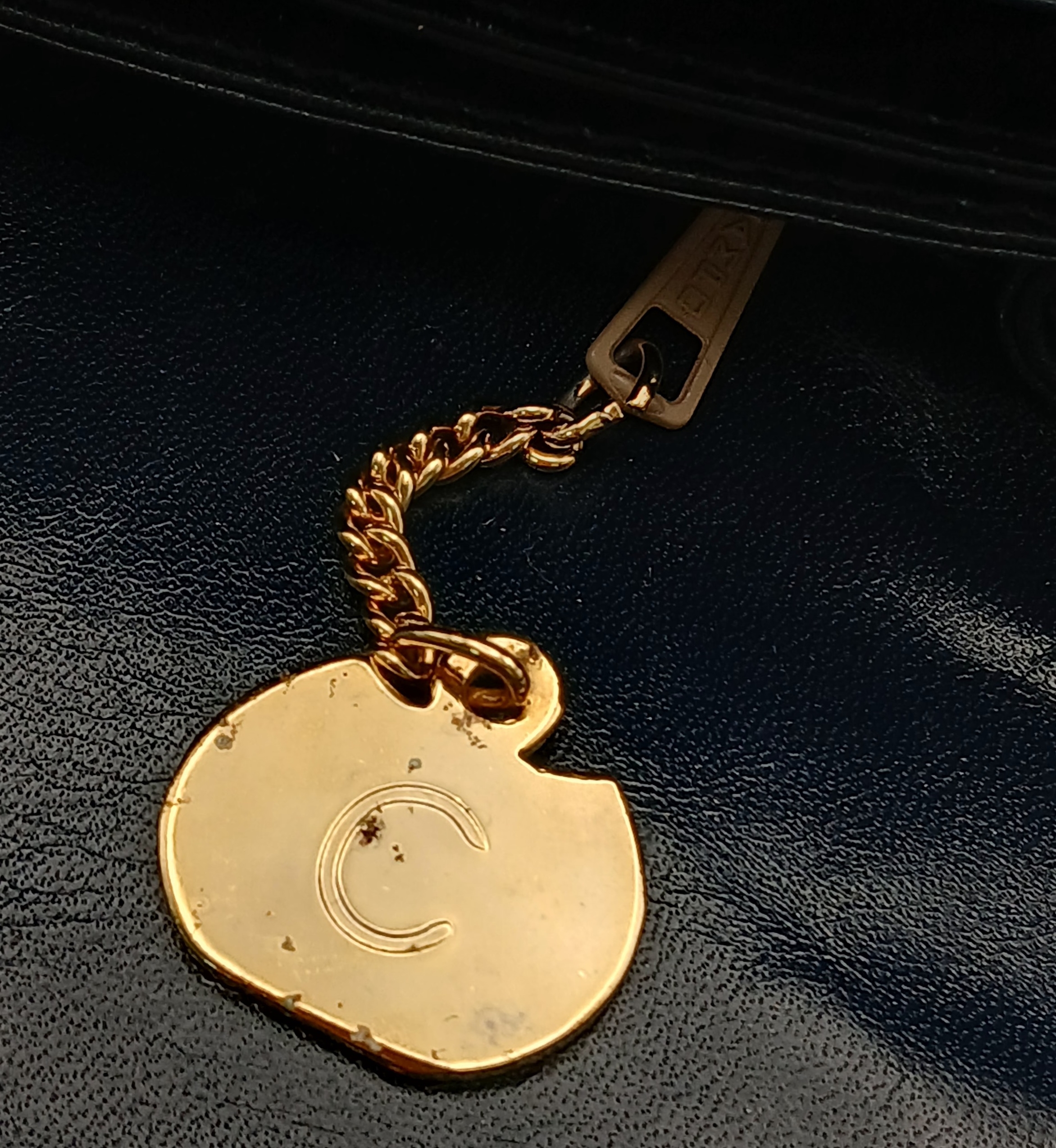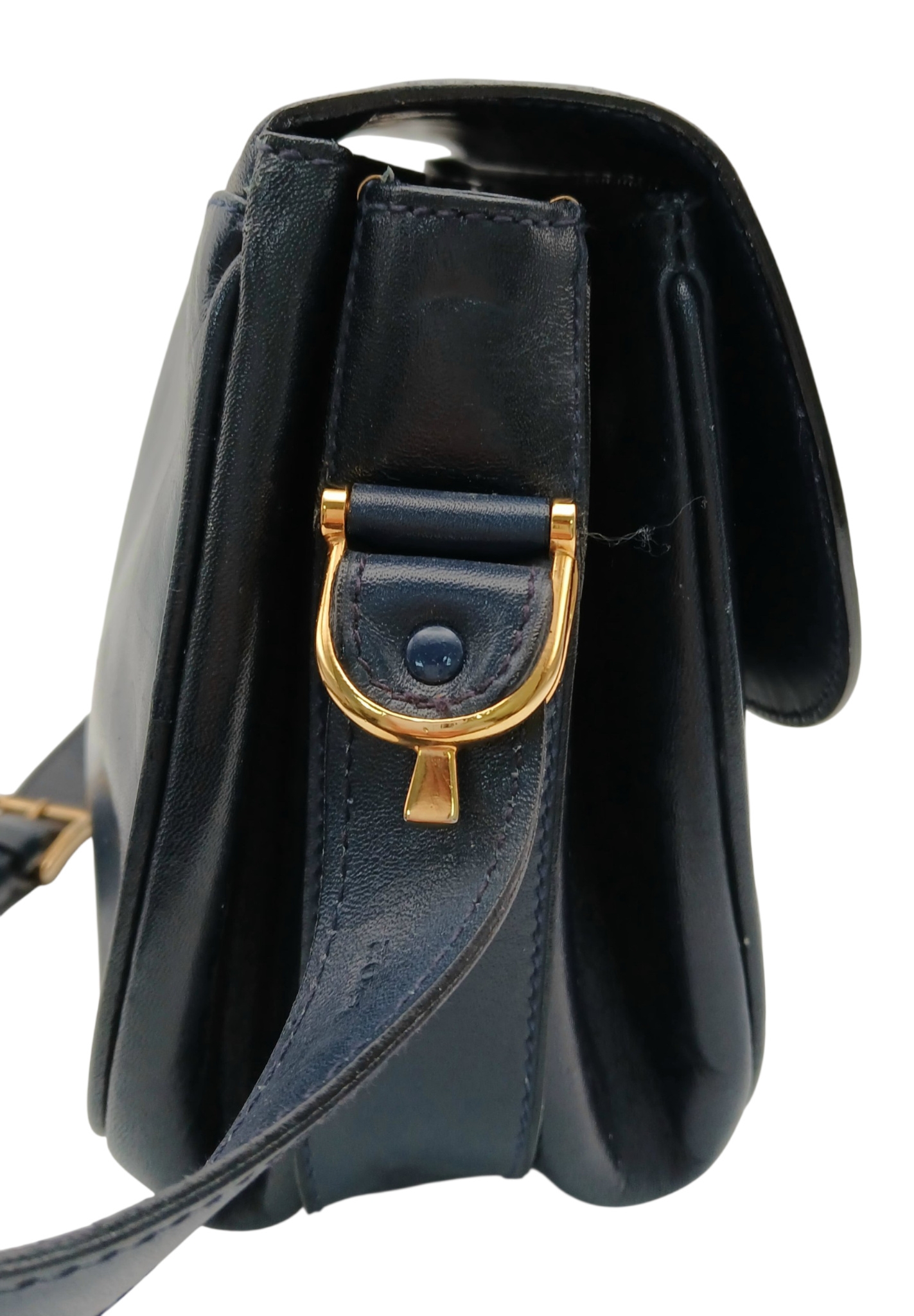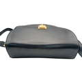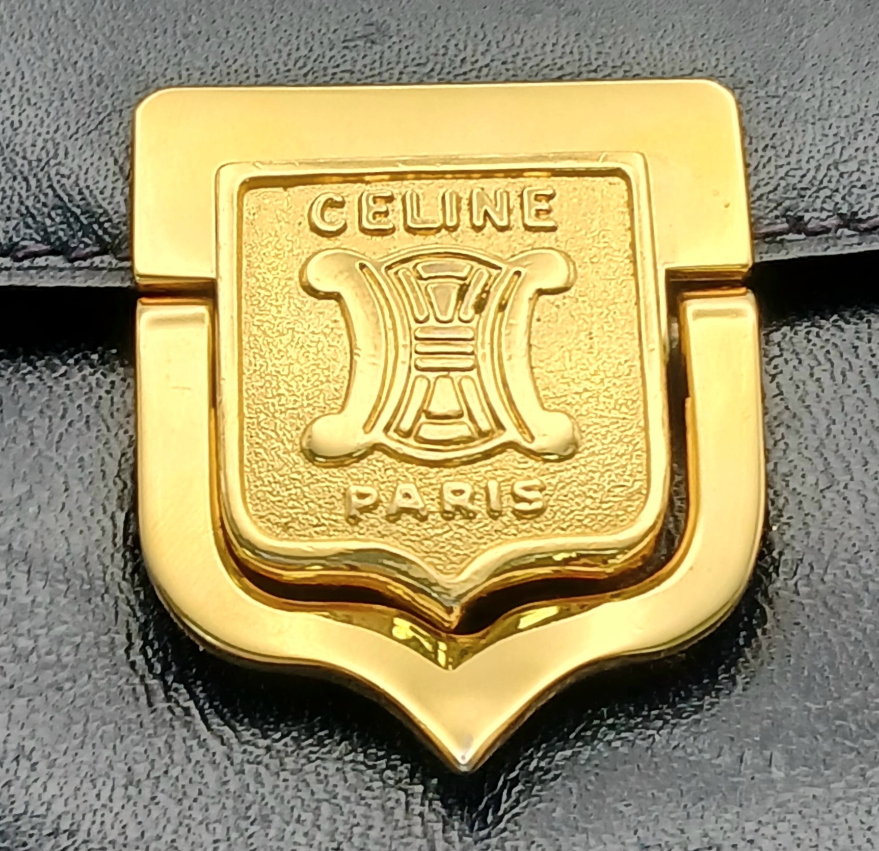 A Céline Vintage Navy Triomphe Shoulder Bag. Navy leather exterior with gold-tone hardware, Triomphe push-lock closure, adjustable shoulder strap and structured flap design. Beige leather interior with multiple compartments and a zipped pocket. Approximate size: 25cm length x 17cm height. Scratches and light creasing to the leather exterior. Please see photos for details condition or request a condition report. Ref: 27514