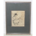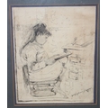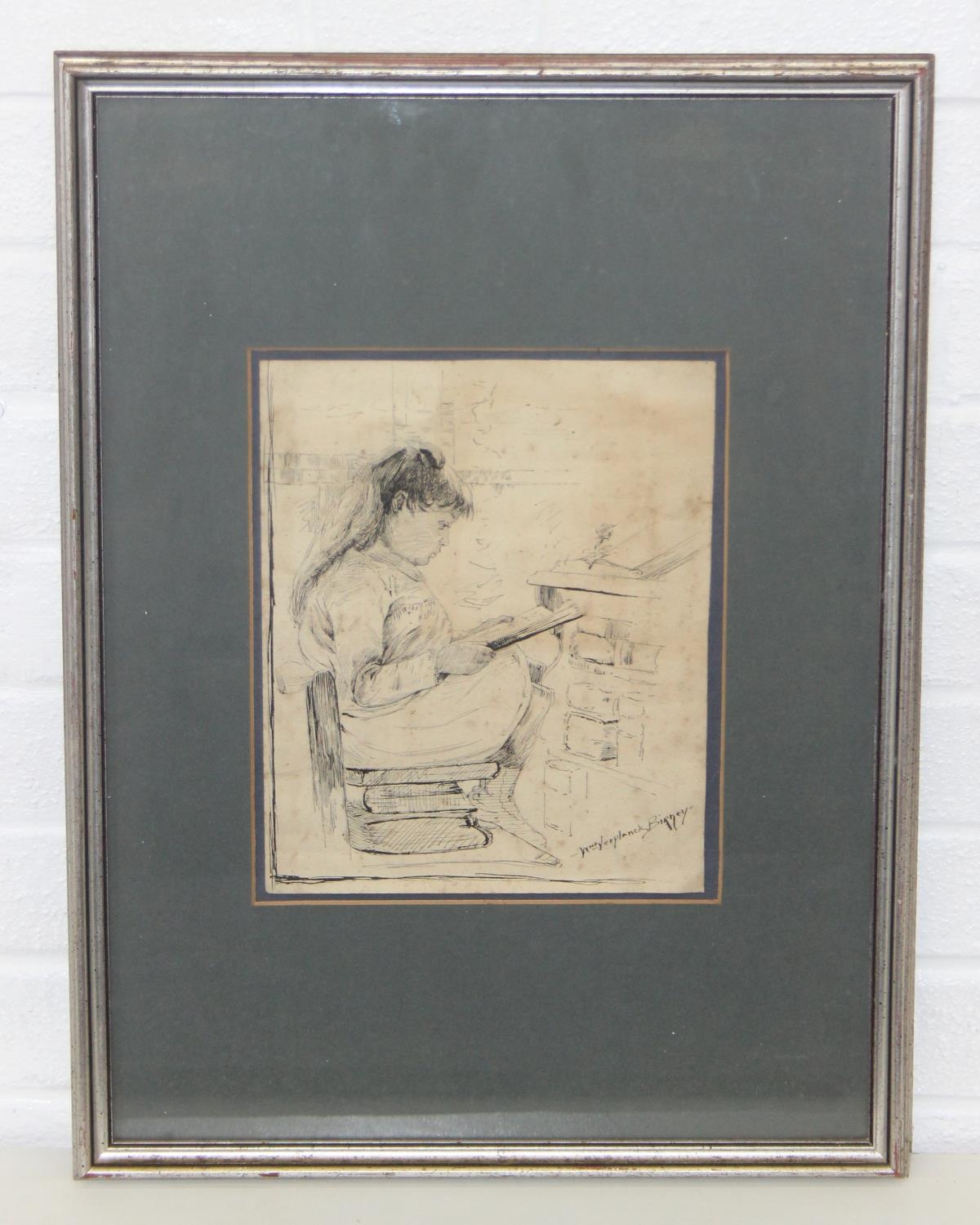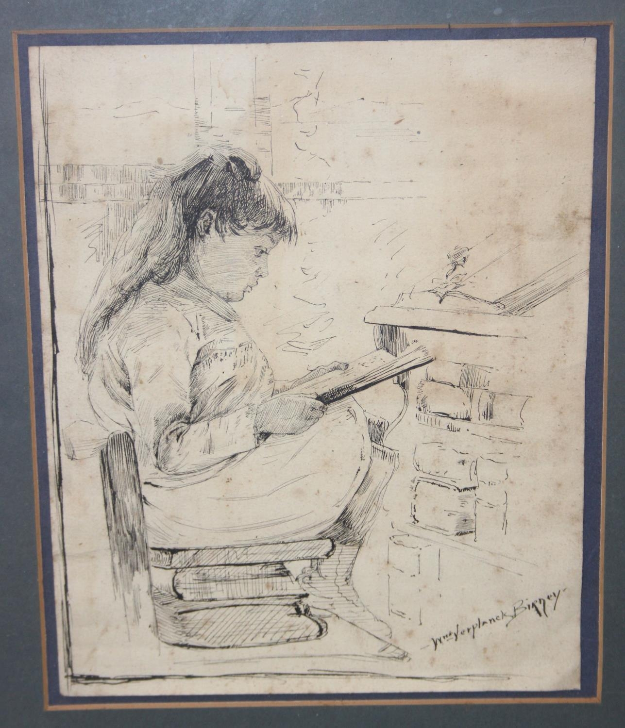 William Verplanck Birney (American, 1858-1909), ink sketch of a young girl studying, signed lower right, in modern silvered frame, 59cm x 44cm
