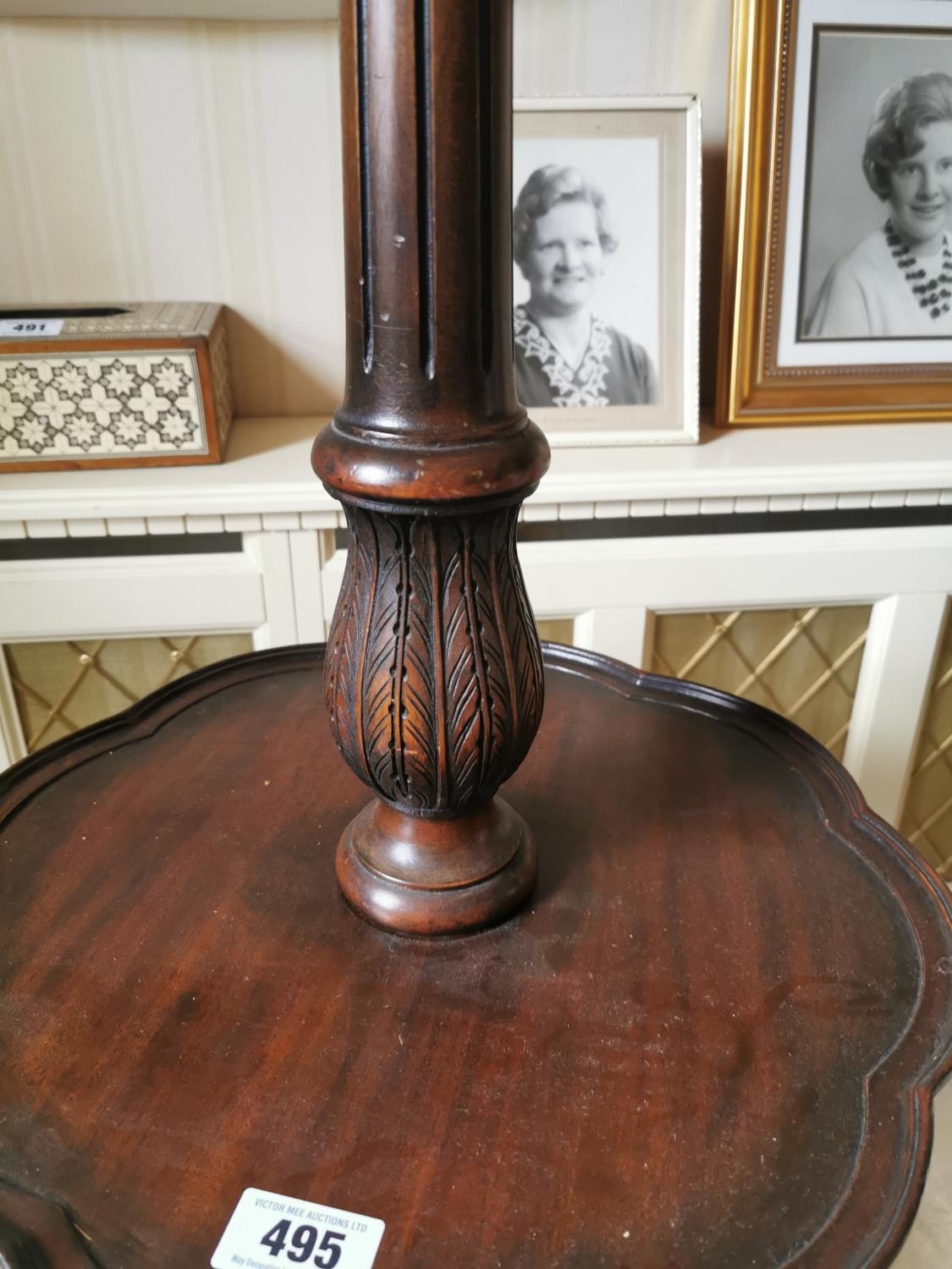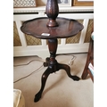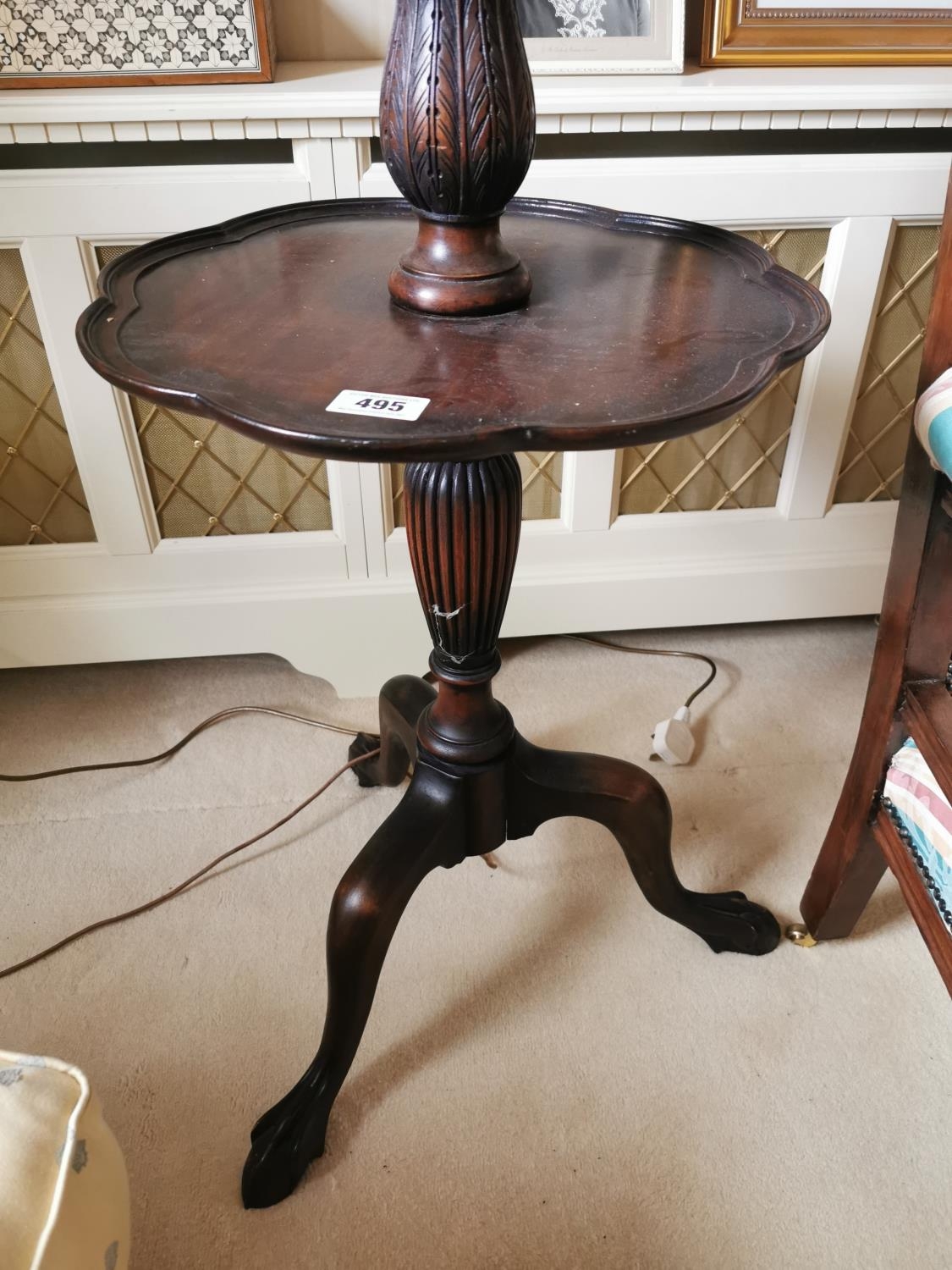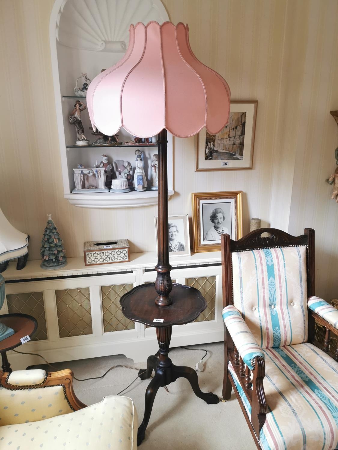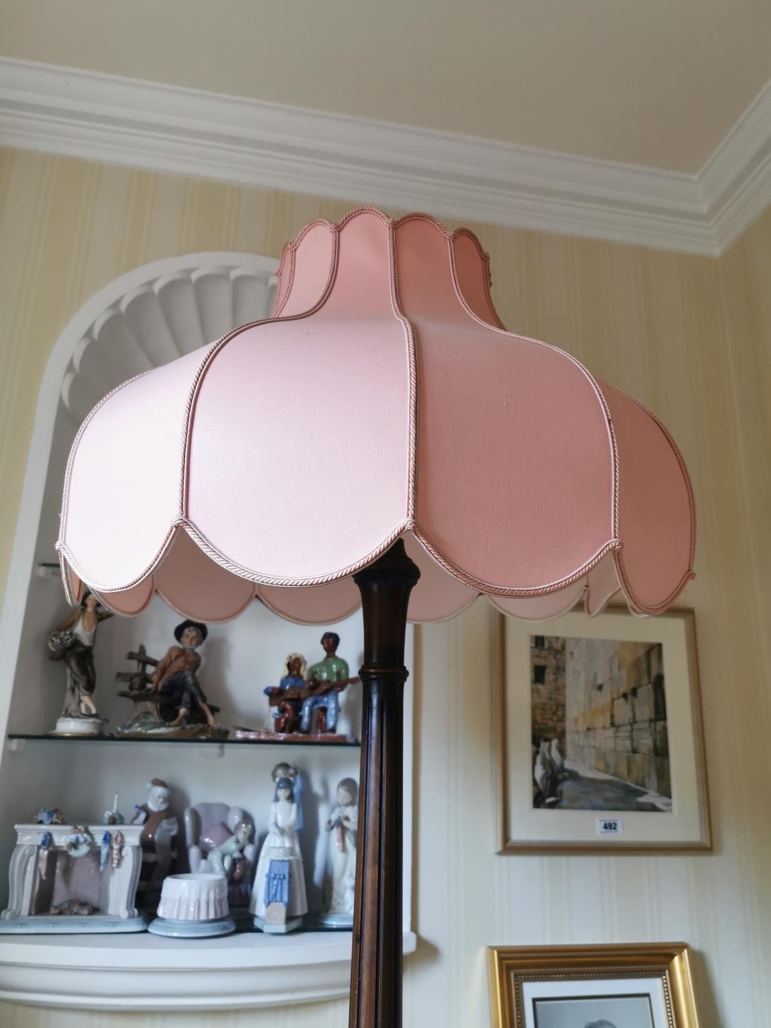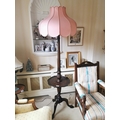 Mahogany standard lamp with reeded column and three outawept legs on claw and ball feet, with original cloth shade. { 117cm H X 54cm Dia }.