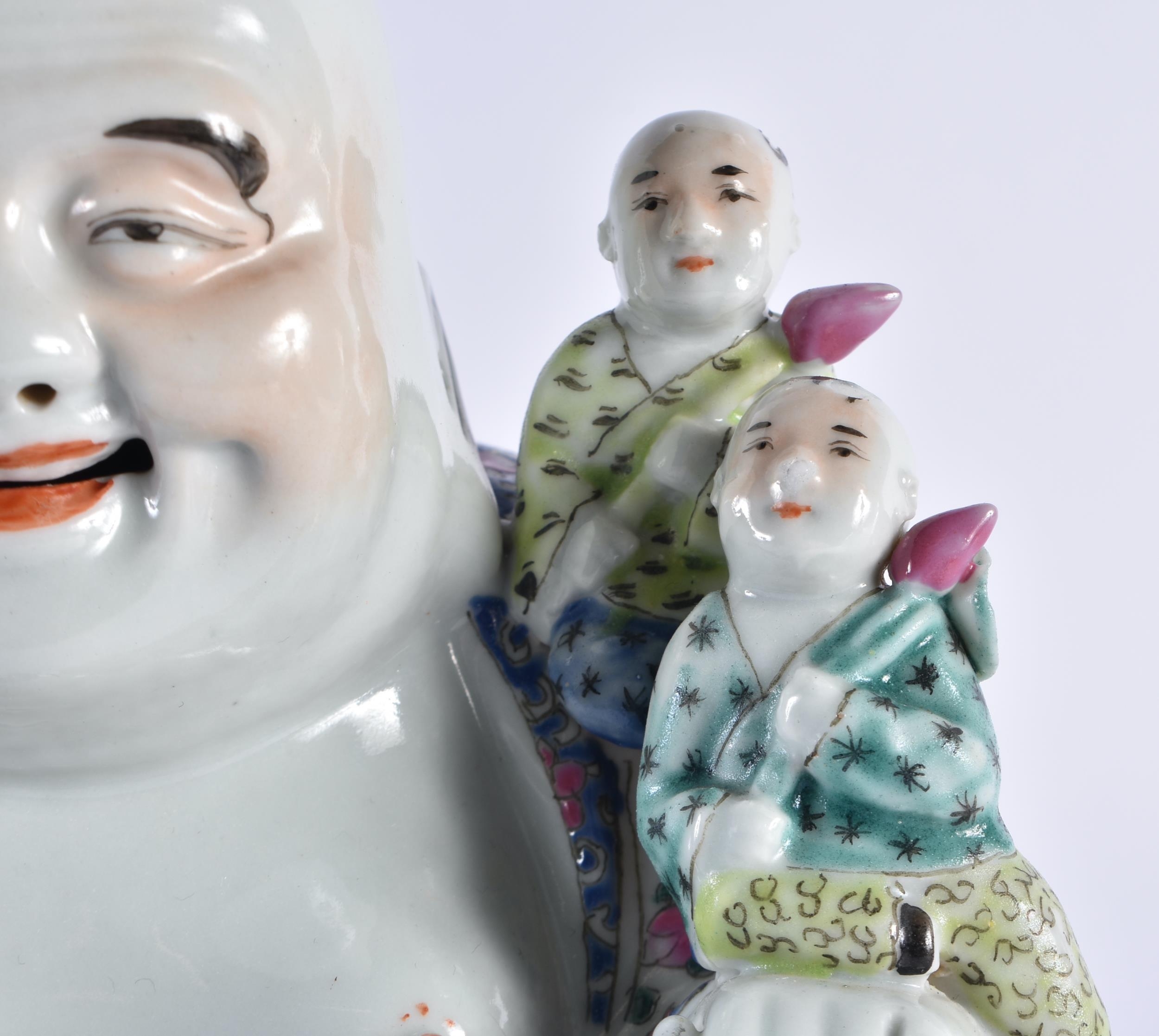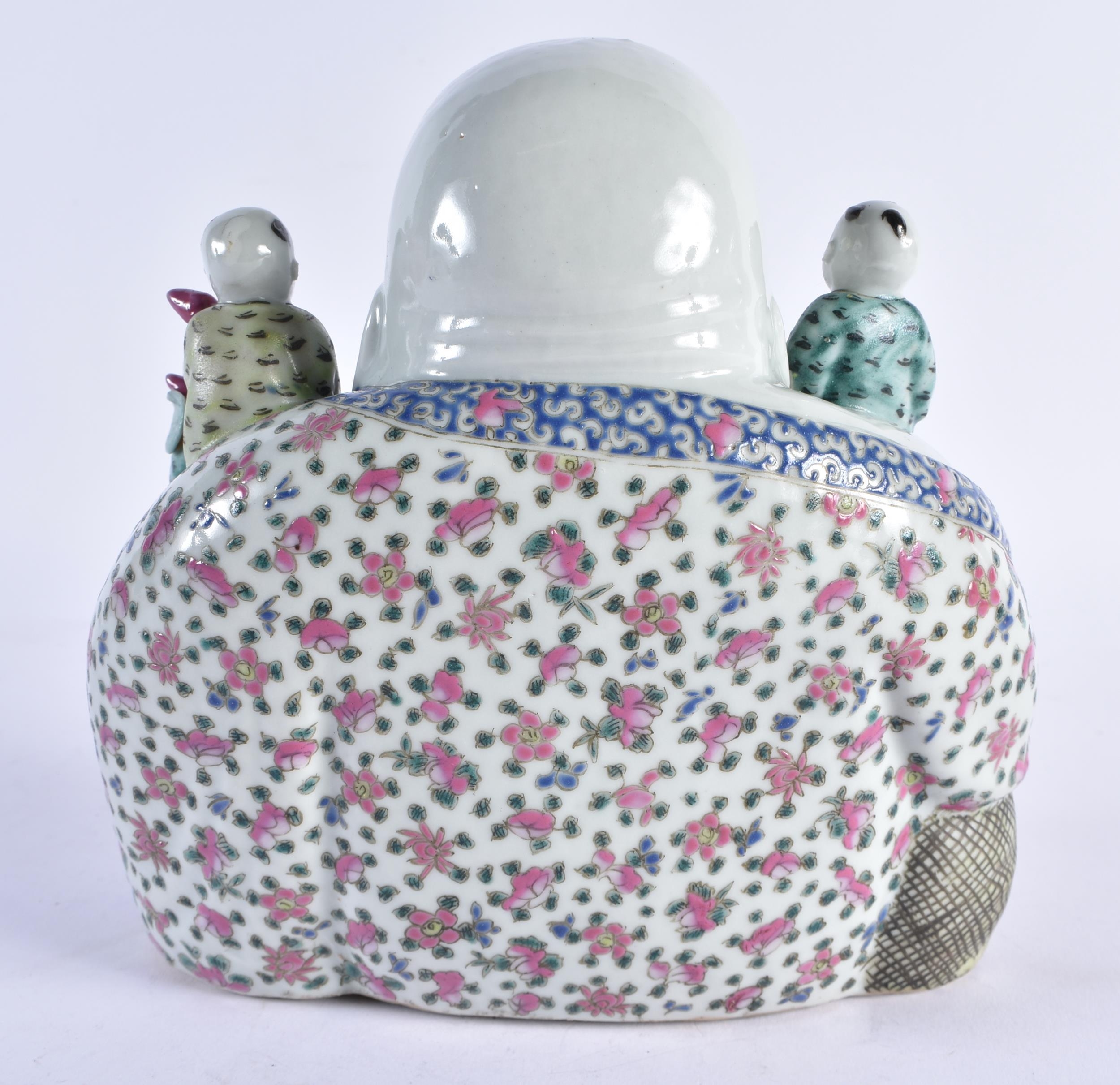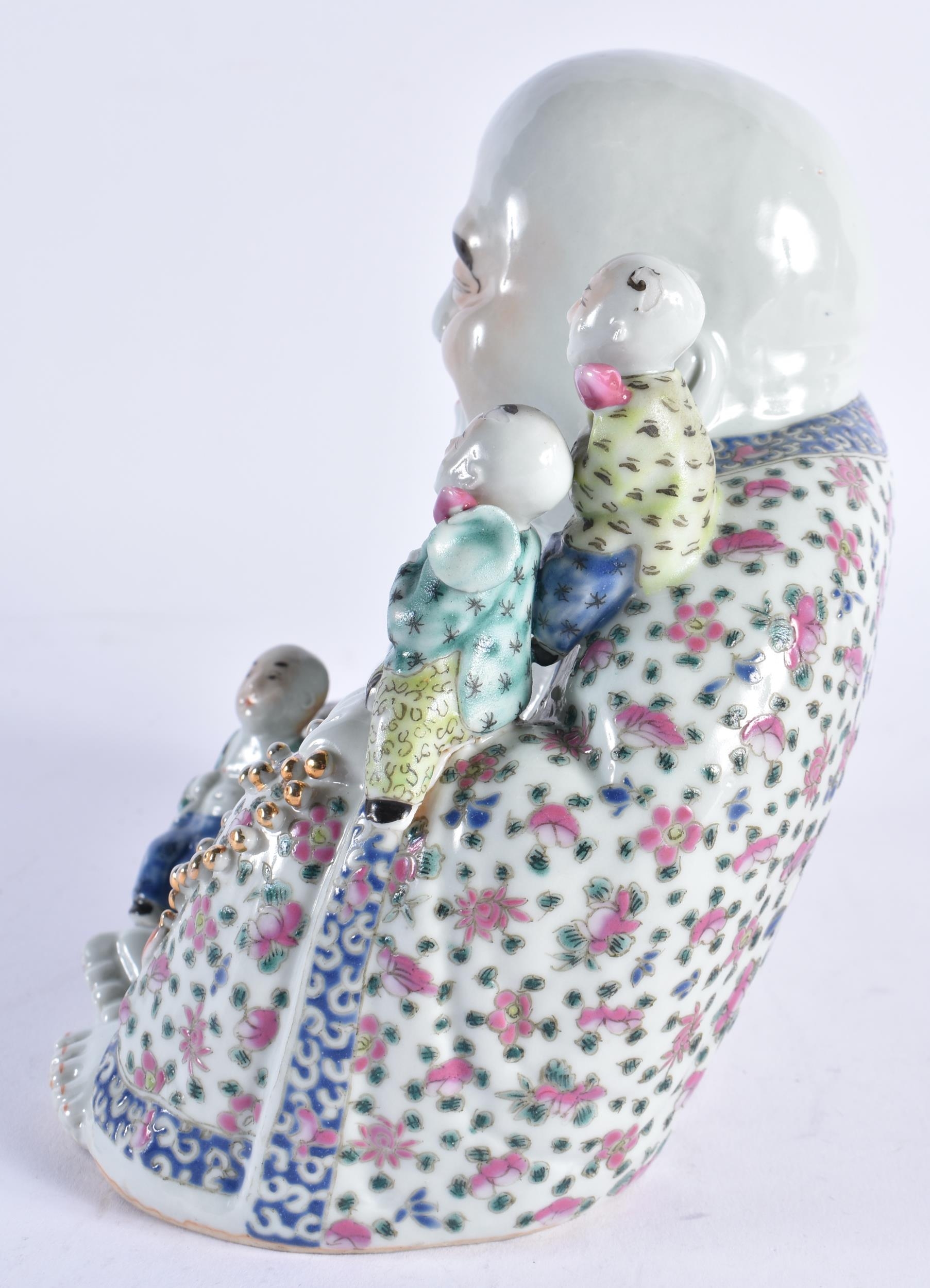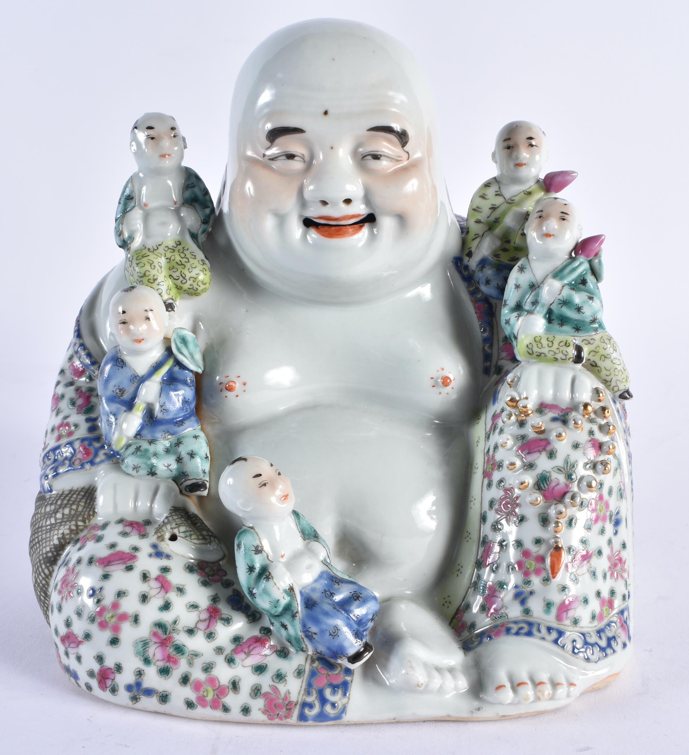 AN EARLY 20TH CENTURY CHINESE FAMILLE ROSE PORCELAIN FIGURE OF A BUDDHA Late Qing/Republic, modelled with five children, wearing foliate embellished robes. 18 cm x 15 cm.