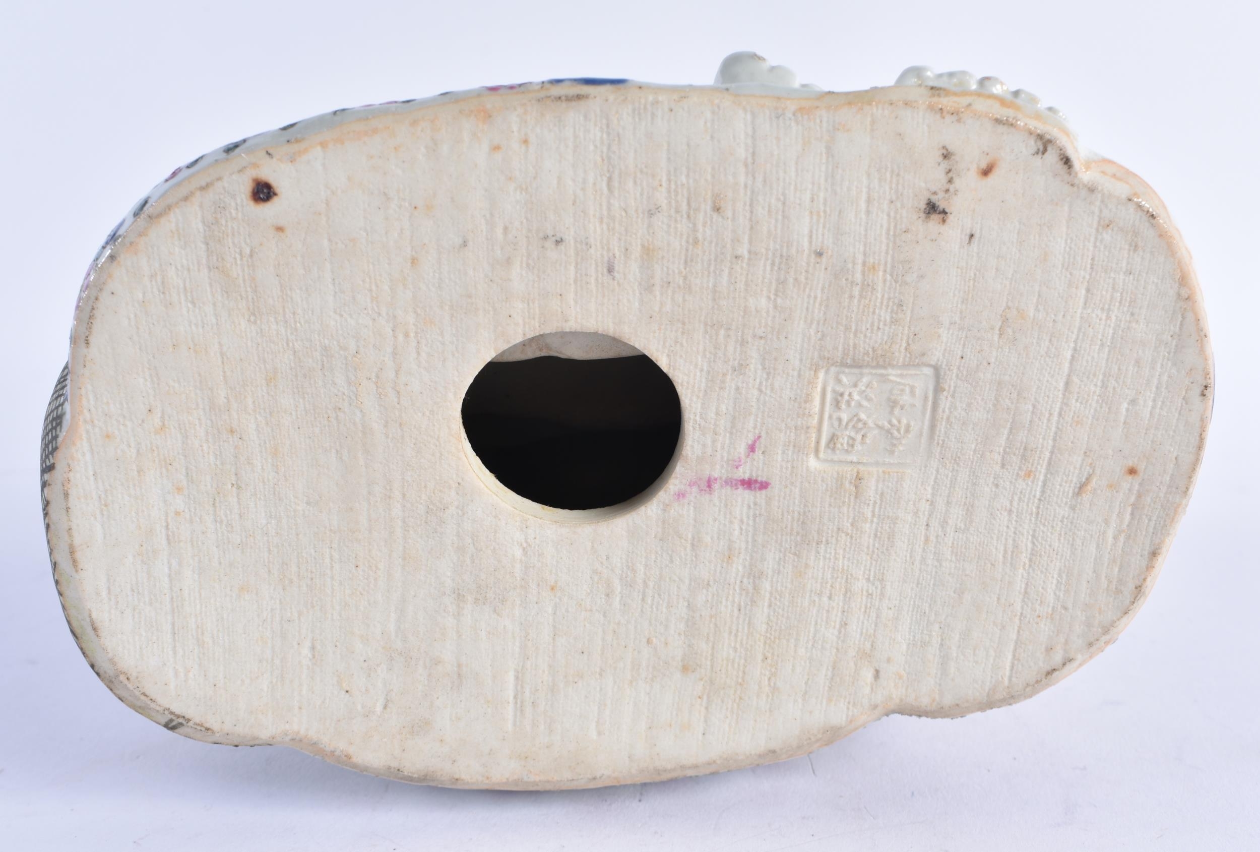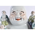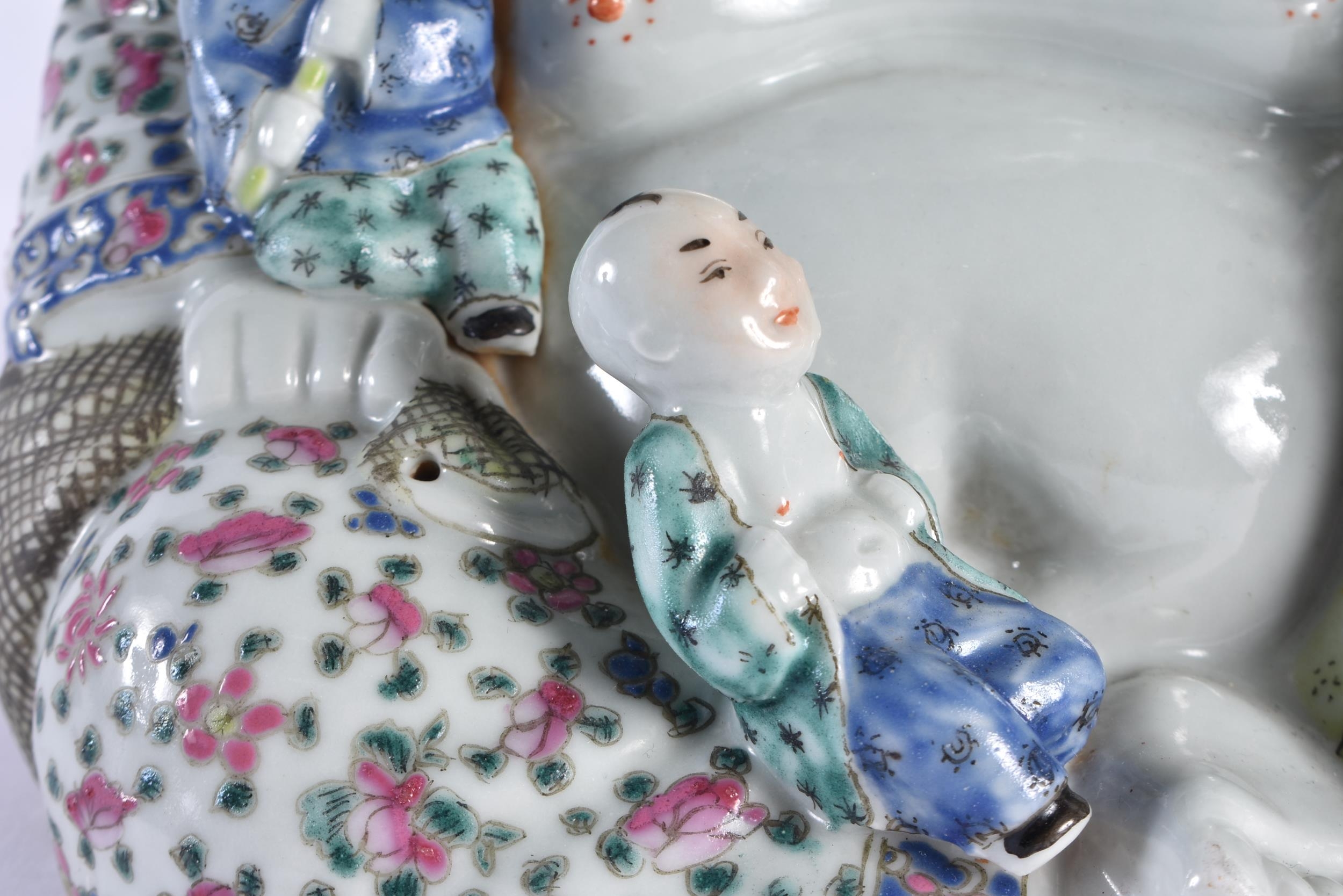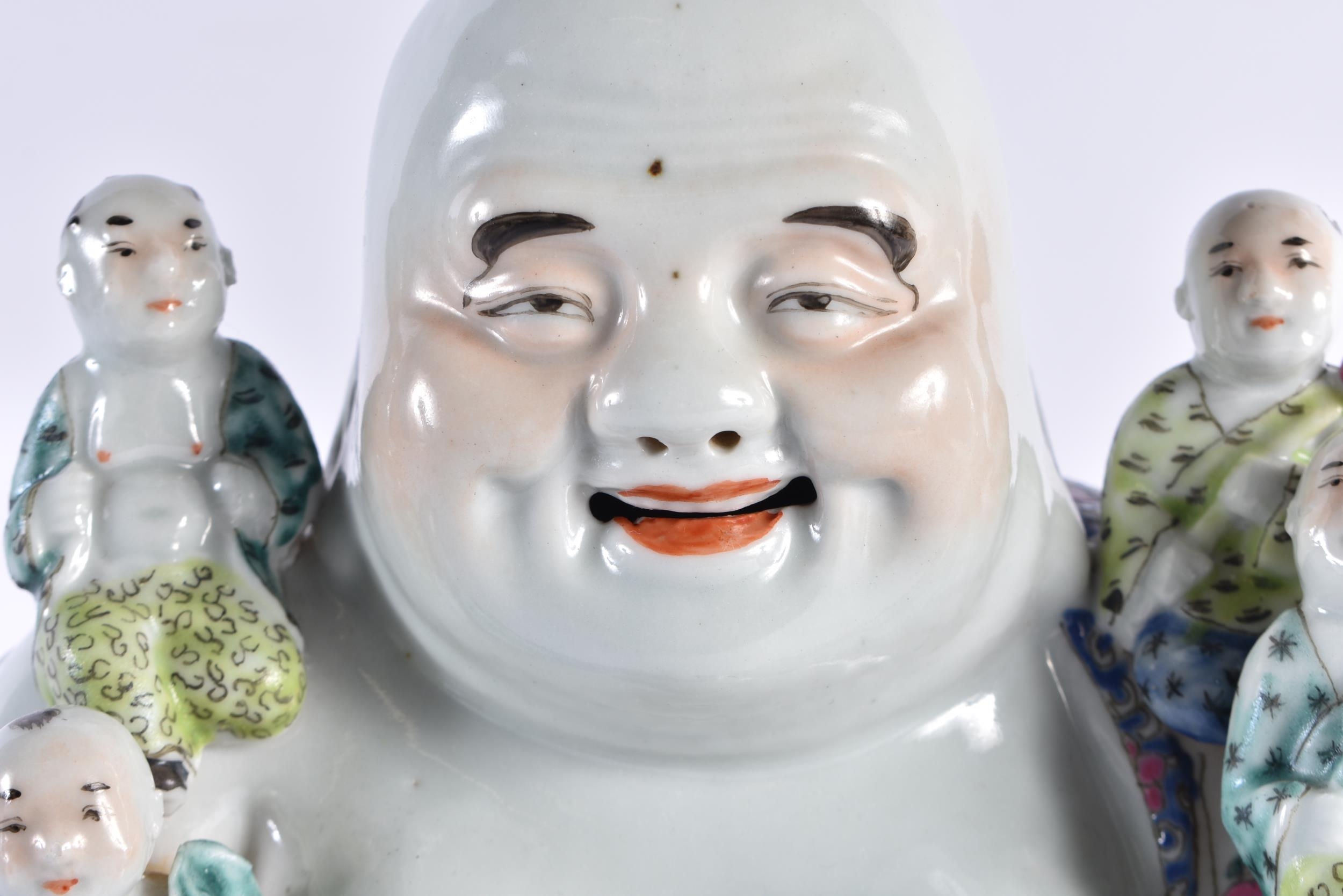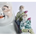 AN EARLY 20TH CENTURY CHINESE FAMILLE ROSE PORCELAIN FIGURE OF A BUDDHA Late Qing/Republic, modelled with five children, wearing foliate embellished robes. 18 cm x 15 cm.