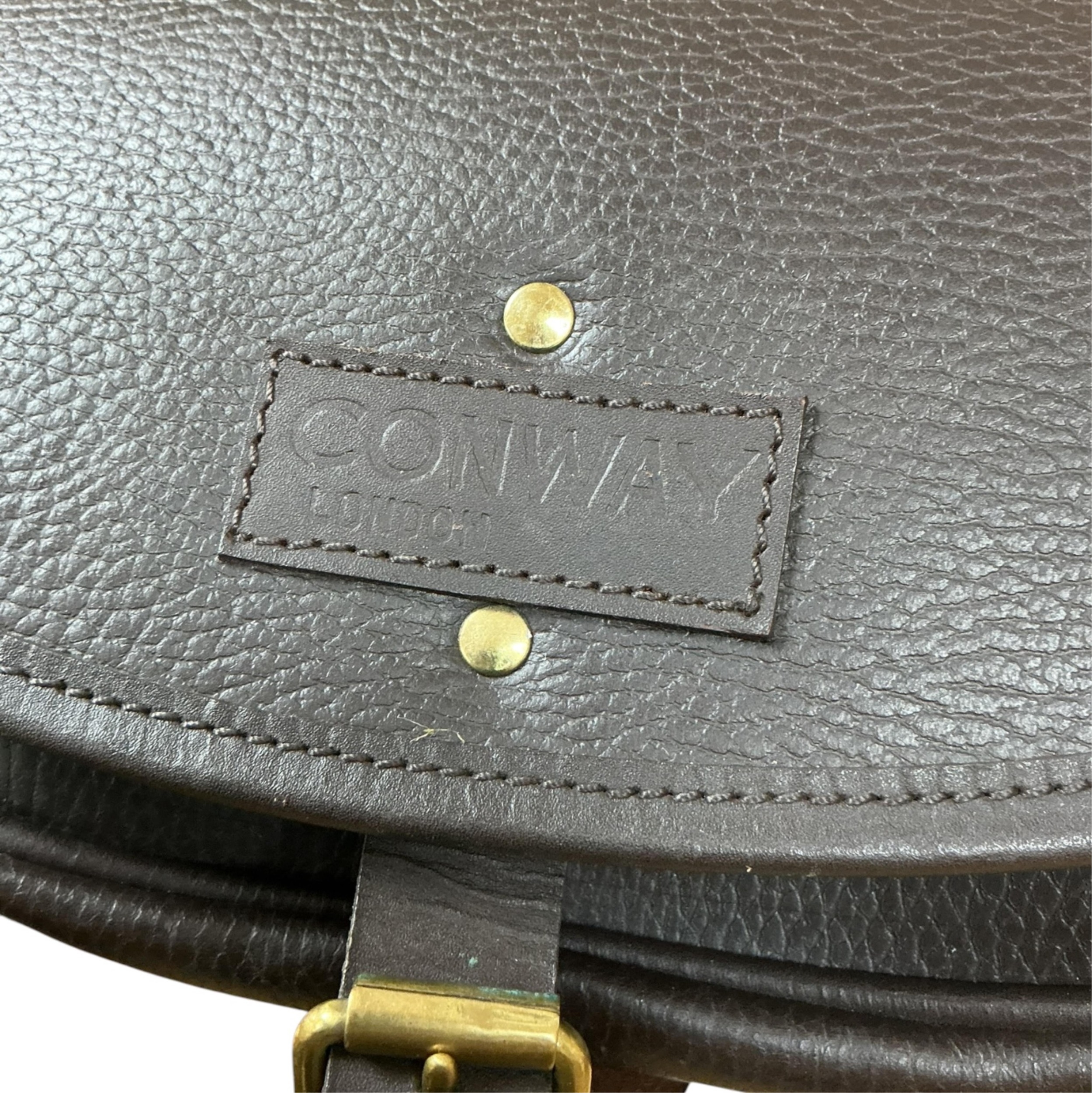 A Conway brown leather cartridge case with shoulder strap.