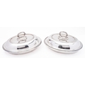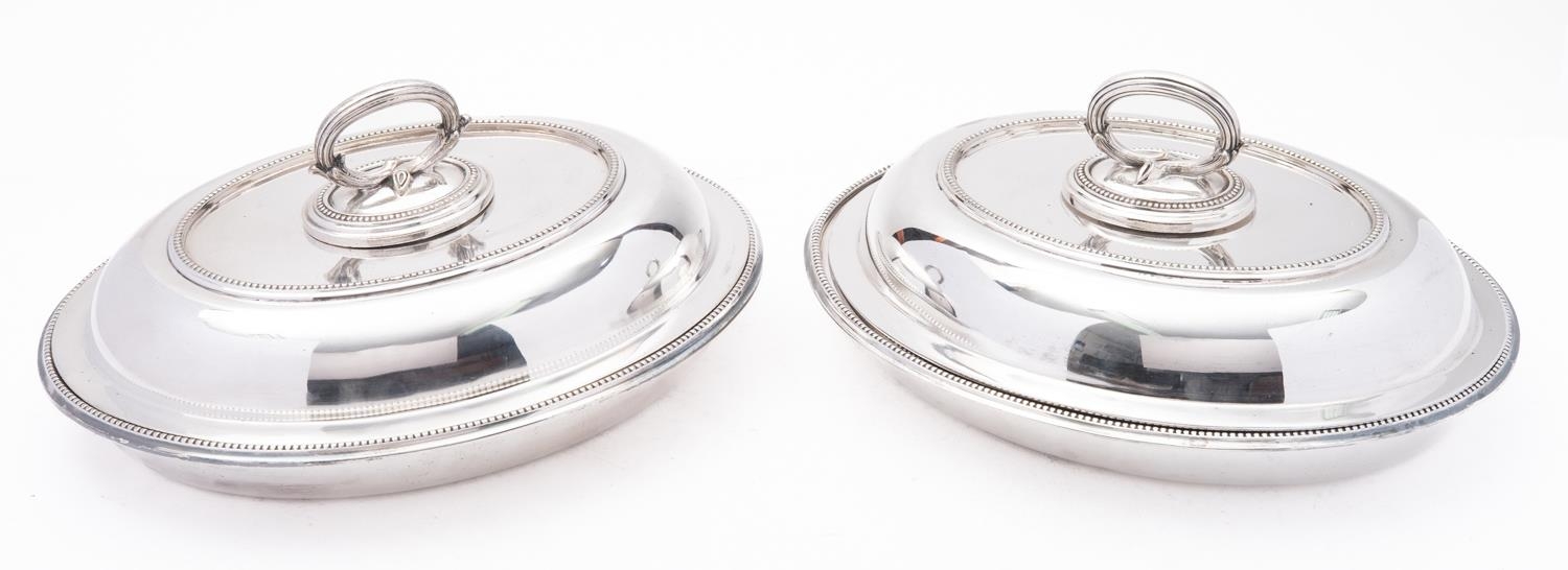 A pair of mid 20th century silver plated entree dishes, marks rubbed, of oval form, detachable handles and beaded rims, (2)