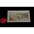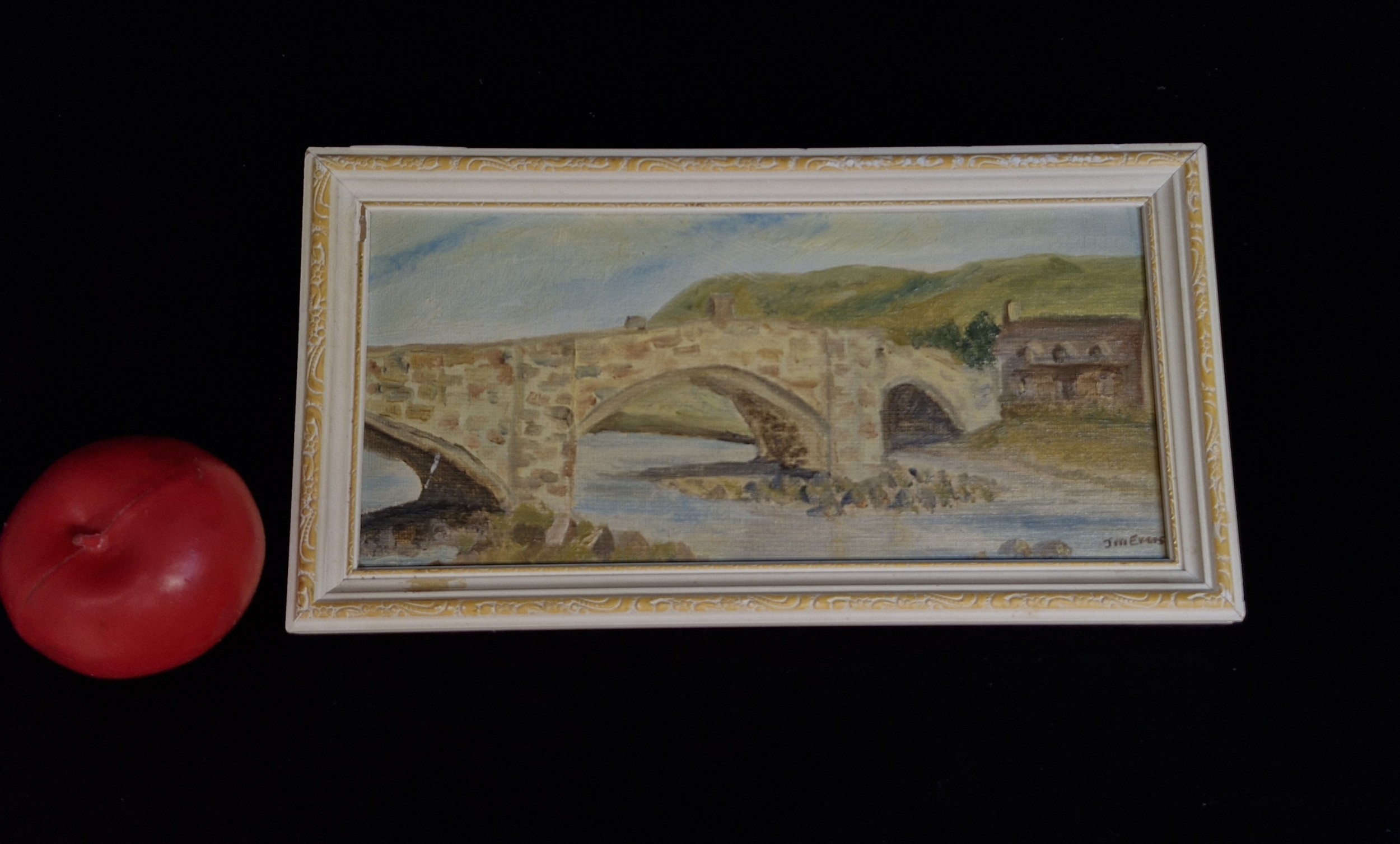 A sweet original oil on board painting featuring landscape with arched bridge. Signed J.M. Evans lower right and housed in painted wooden frame.