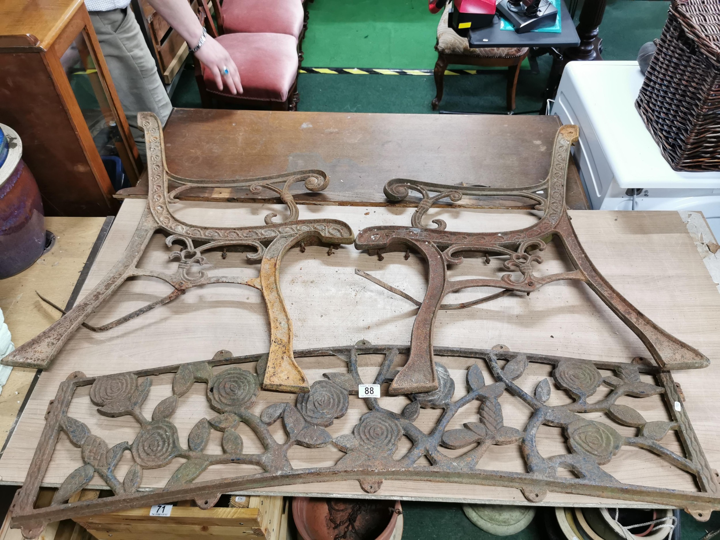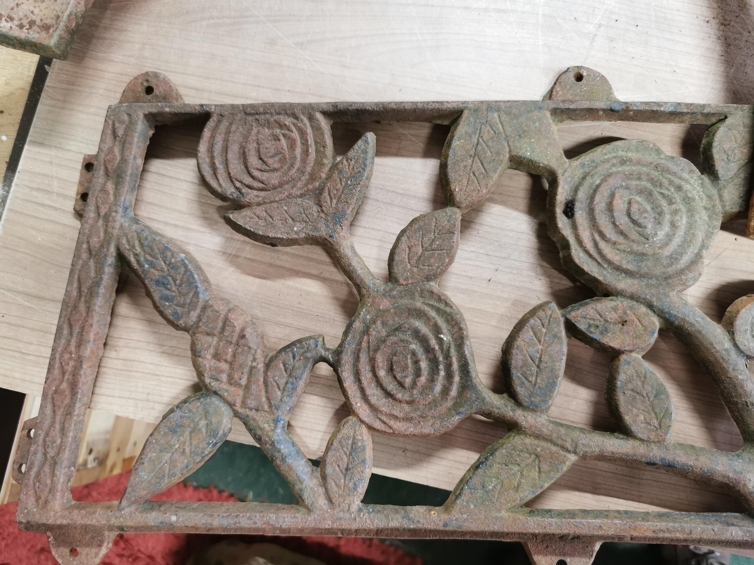 Cast iron park bench with bench ends and ornate floral design back rest, length 112cm in good order, in need of restoration