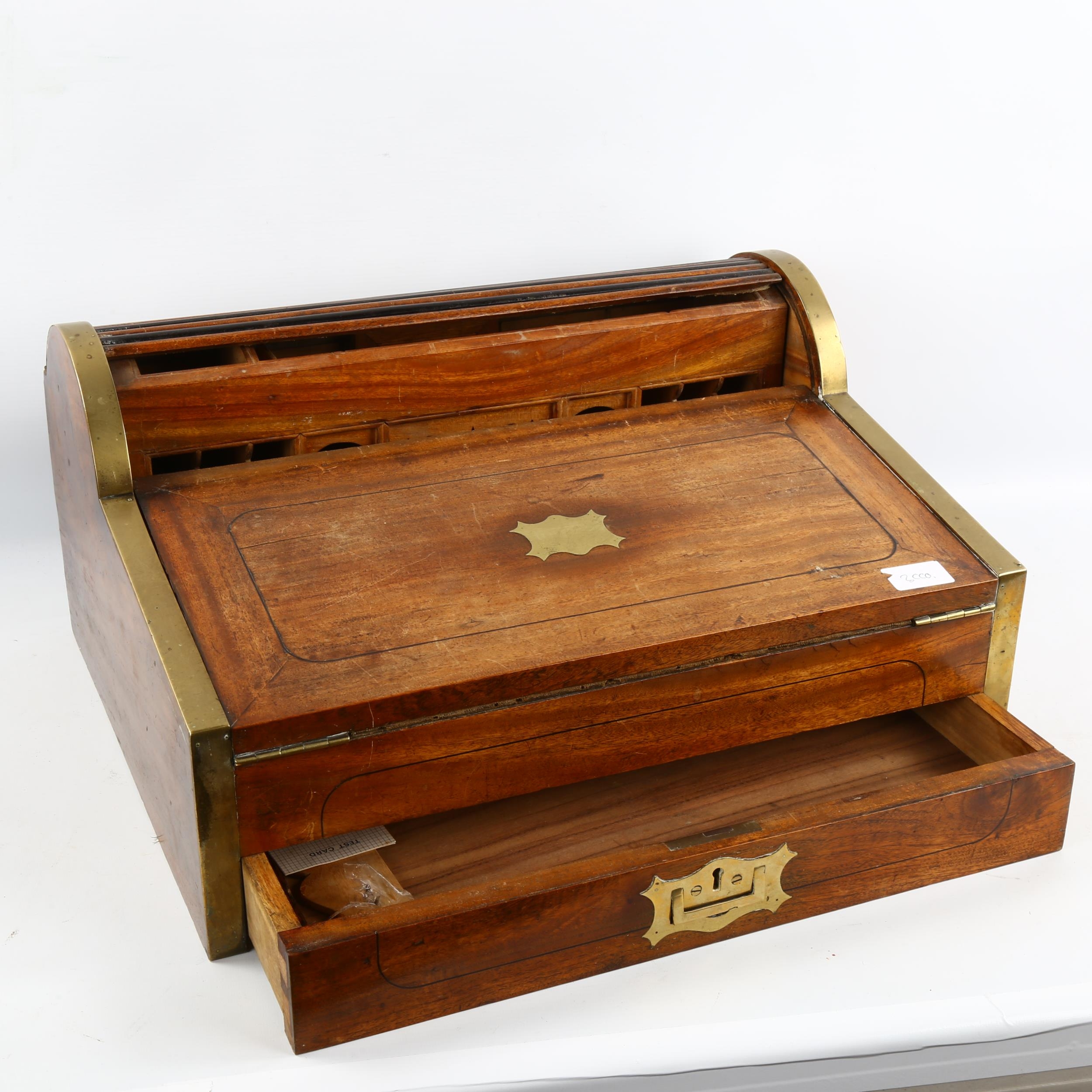 19th century brass-bound hardwood campaign writing slope with tambour top, width 49cm