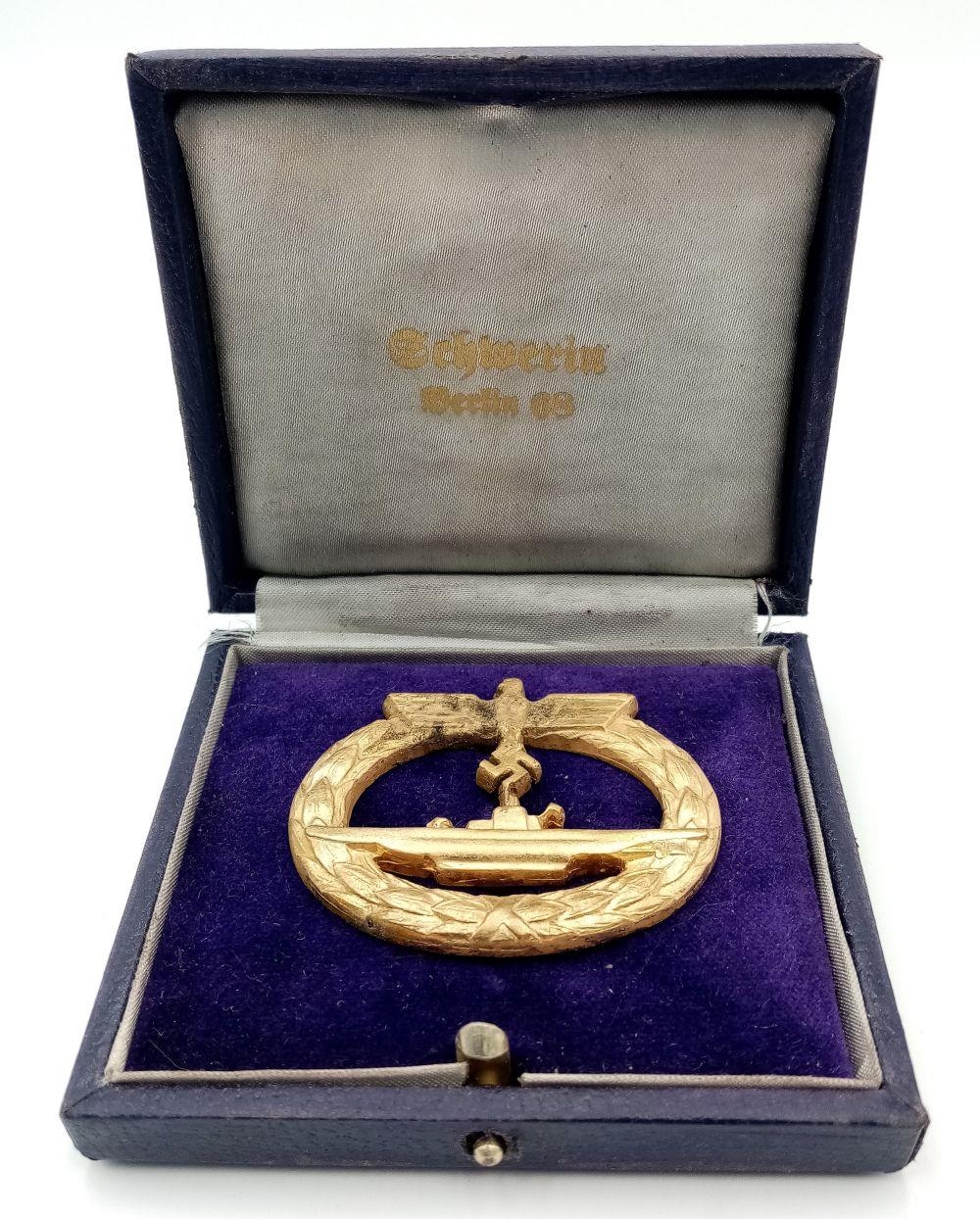 A WW2 German Kriegsmarine U-Boat Crew Badge. & Case. Maker Schwein, Berlin.