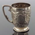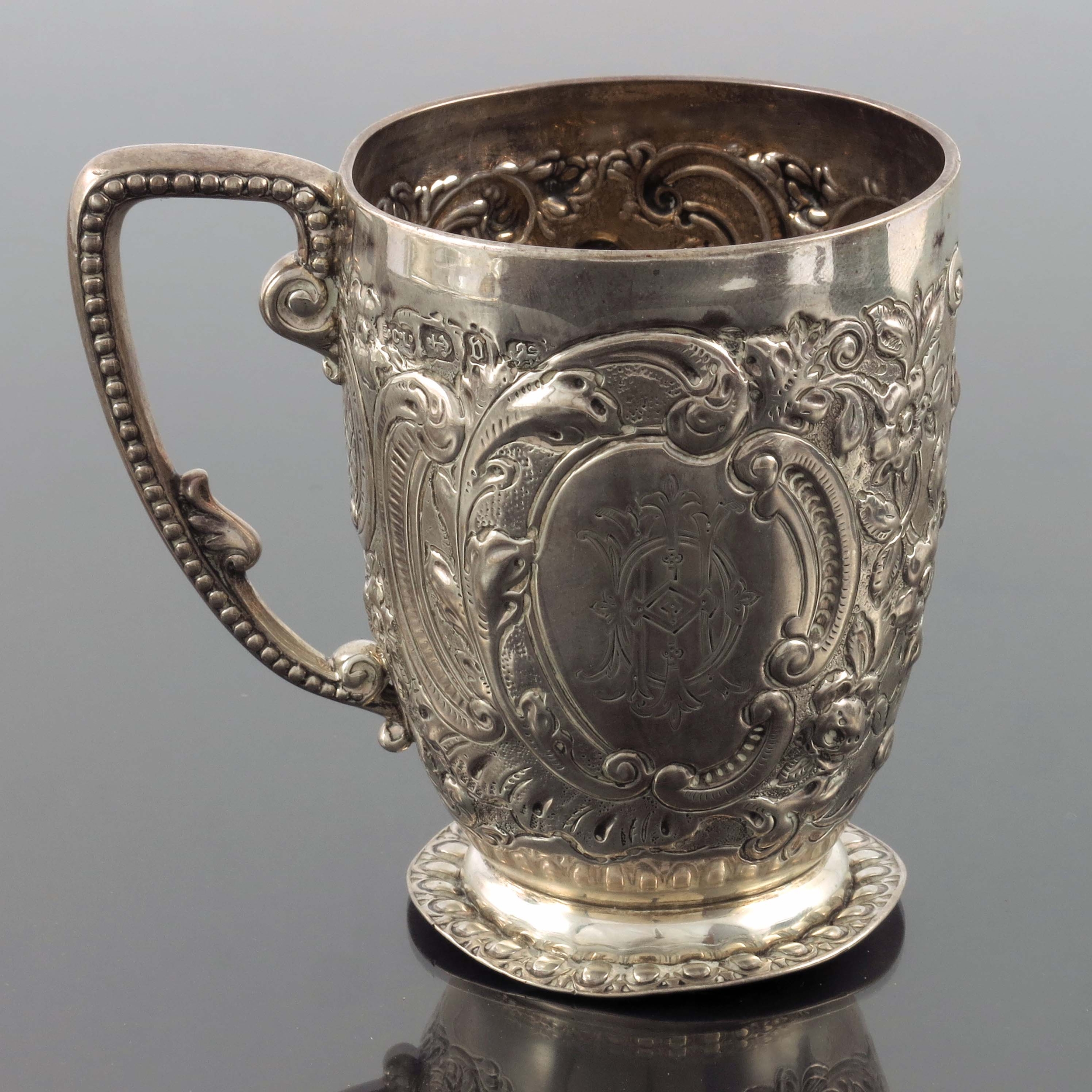 A Victorian silver mug, Elkington and Co., Birmingham 1876, footed beaker form, embossed with Rococo C scrolls and floral garlands, winged putti, egg and dart cast foot and beaded handle, 9.5cm high, 4.69ozt