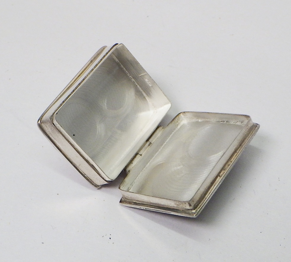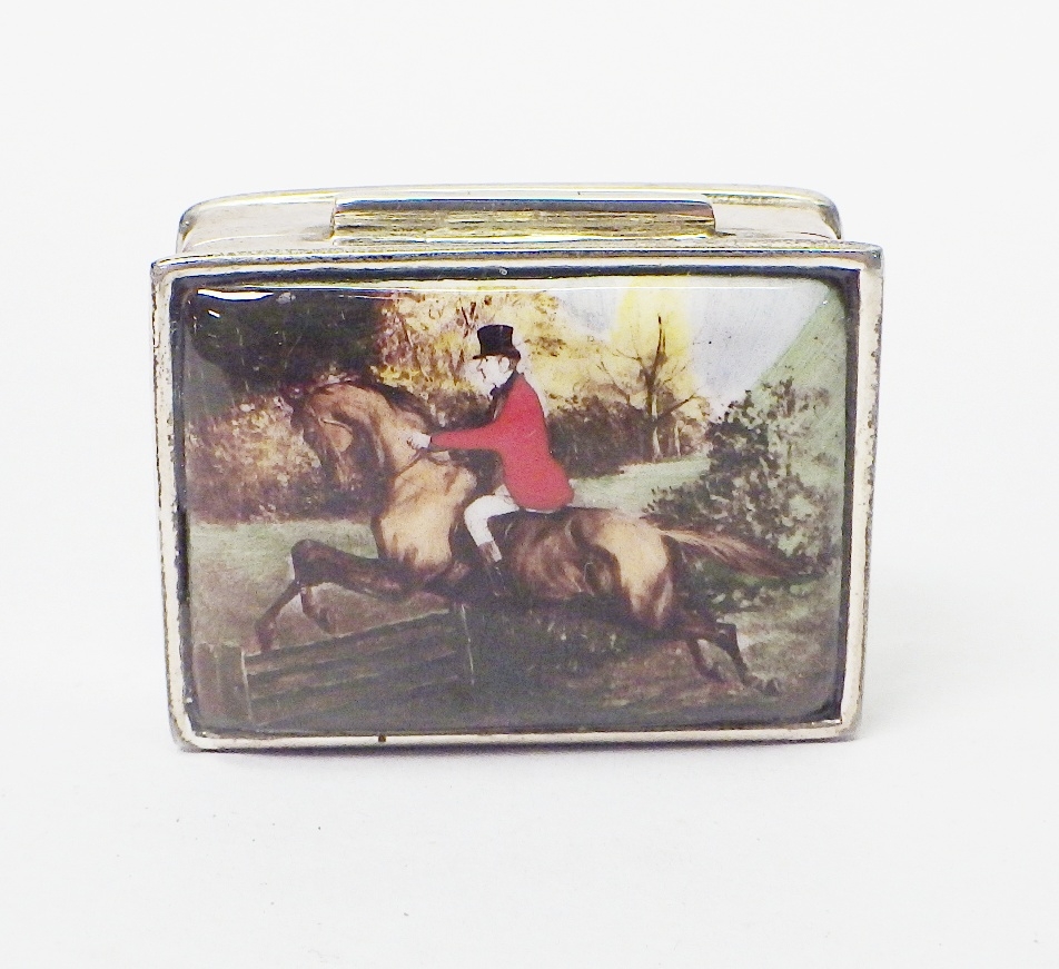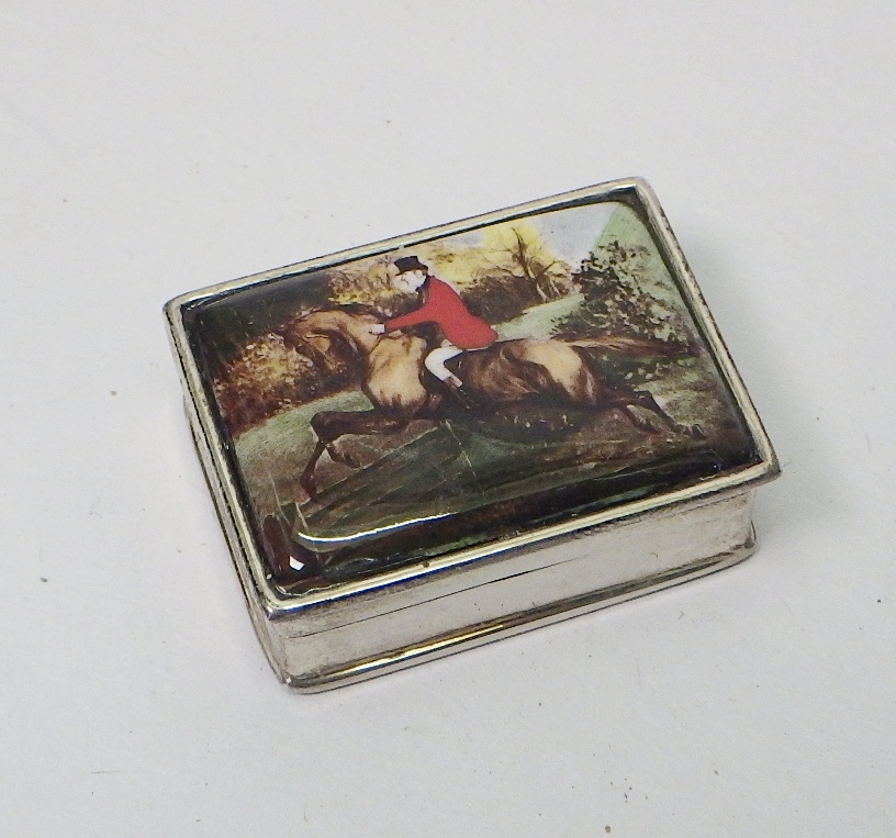 A silver and enamel trinket box, the hinged lid depicting a huntsman, London 2009. 36 x 27mm
