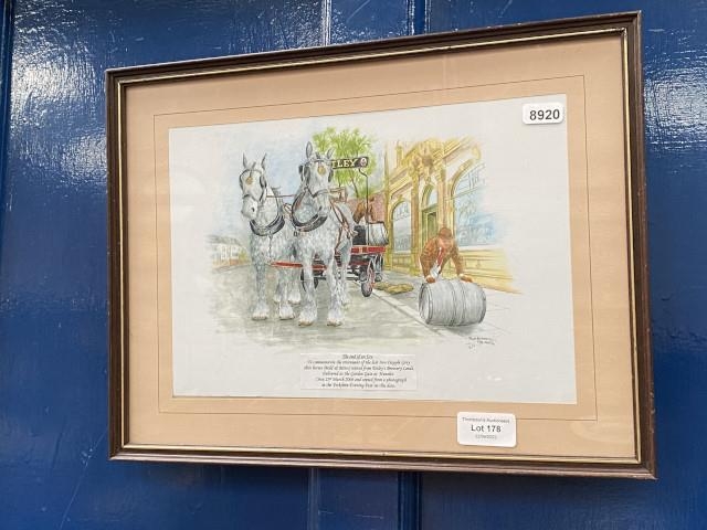 Jack Barstow print 56/250 "The end of an era" to commemorative the retirement of the last 2 dapple grey shire horses "Mild" & "Bitter" retired from Tetley's Brewery Leeds (29 x 39 cm)