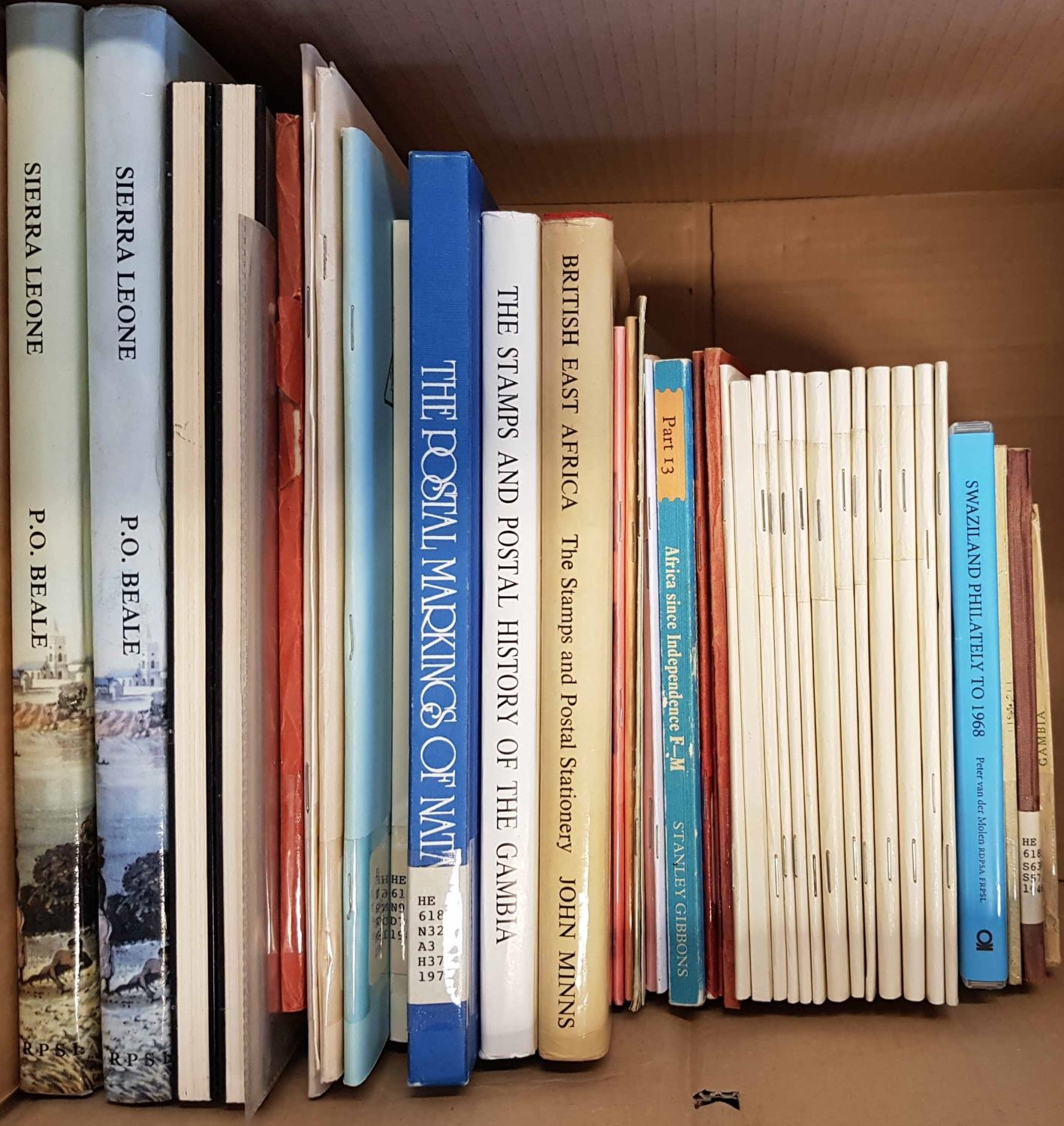 AFRICA: One box containing a large number of publications. Noted: Sierra Leone by Belae (2 copies), BEA by Minns, 13 titles from Cockrill Series, SG Part 13 Catalogue Africa Since Independence F-M, Swaziland eBook by van der Molen, Gambia by Andrew, Nyasaland-Rhodesia Field Force 1914-18 by Drysdall & Pennycuick, WEP Series: Sierra Leone, Togo and Sudan. (45) Cross Reference: SIERRA LEONE, GAMBIA, RHODESIA AND NYASALAND