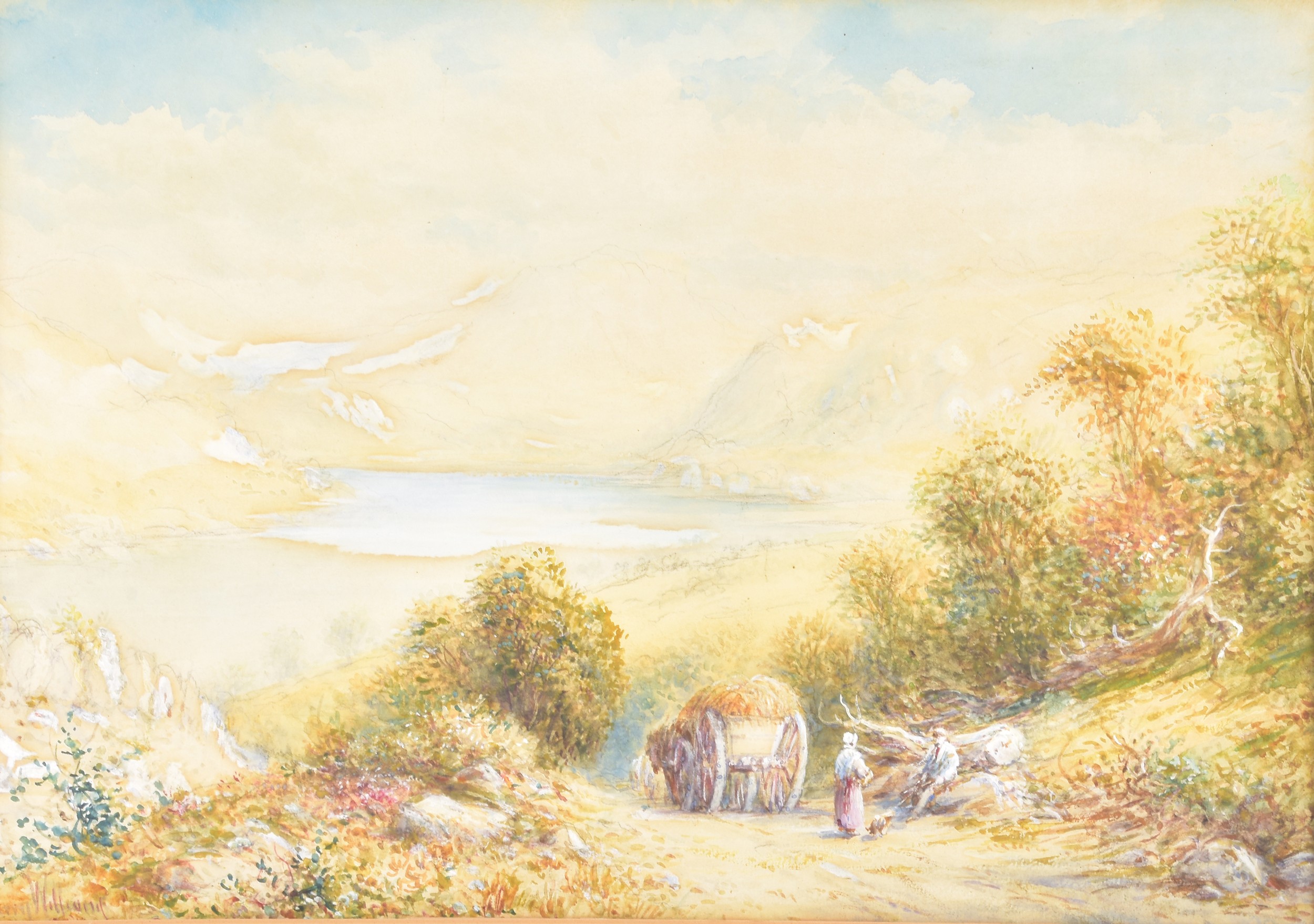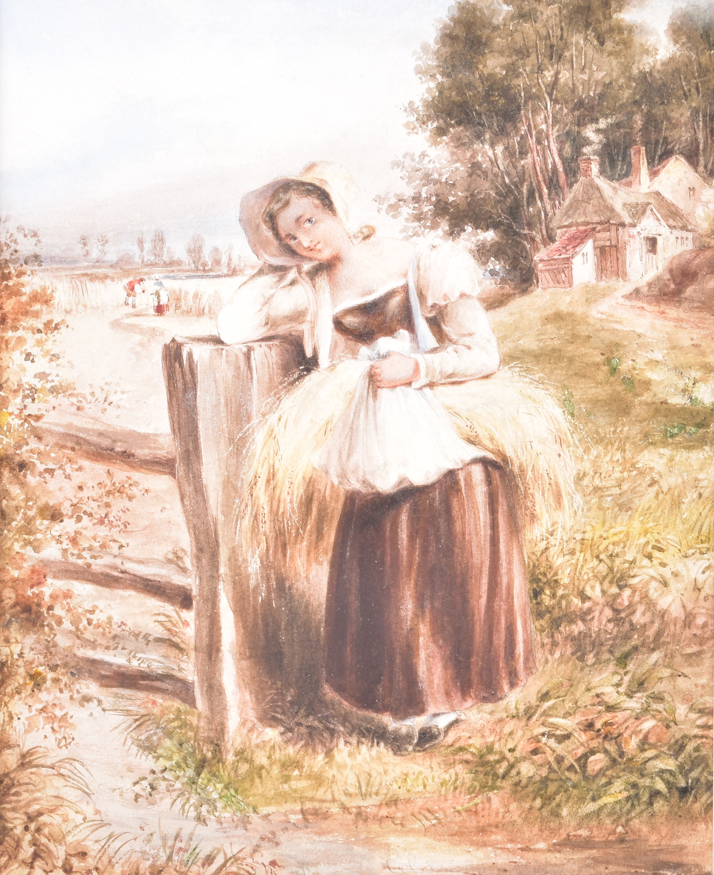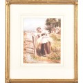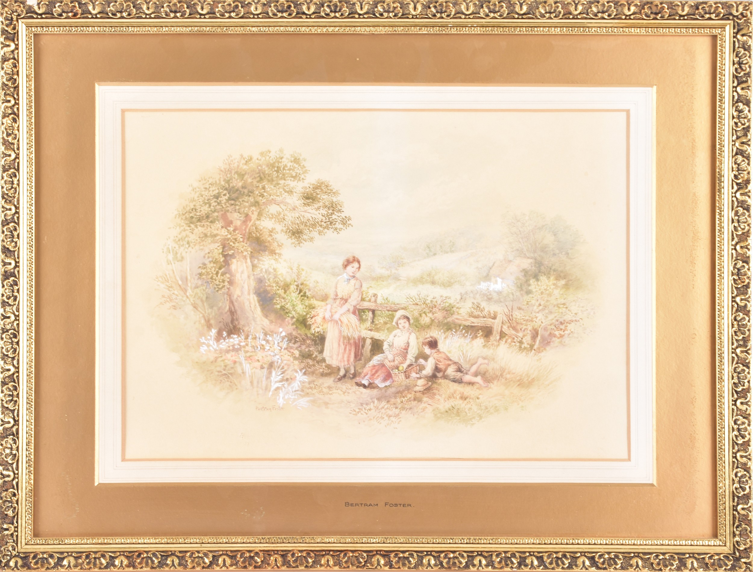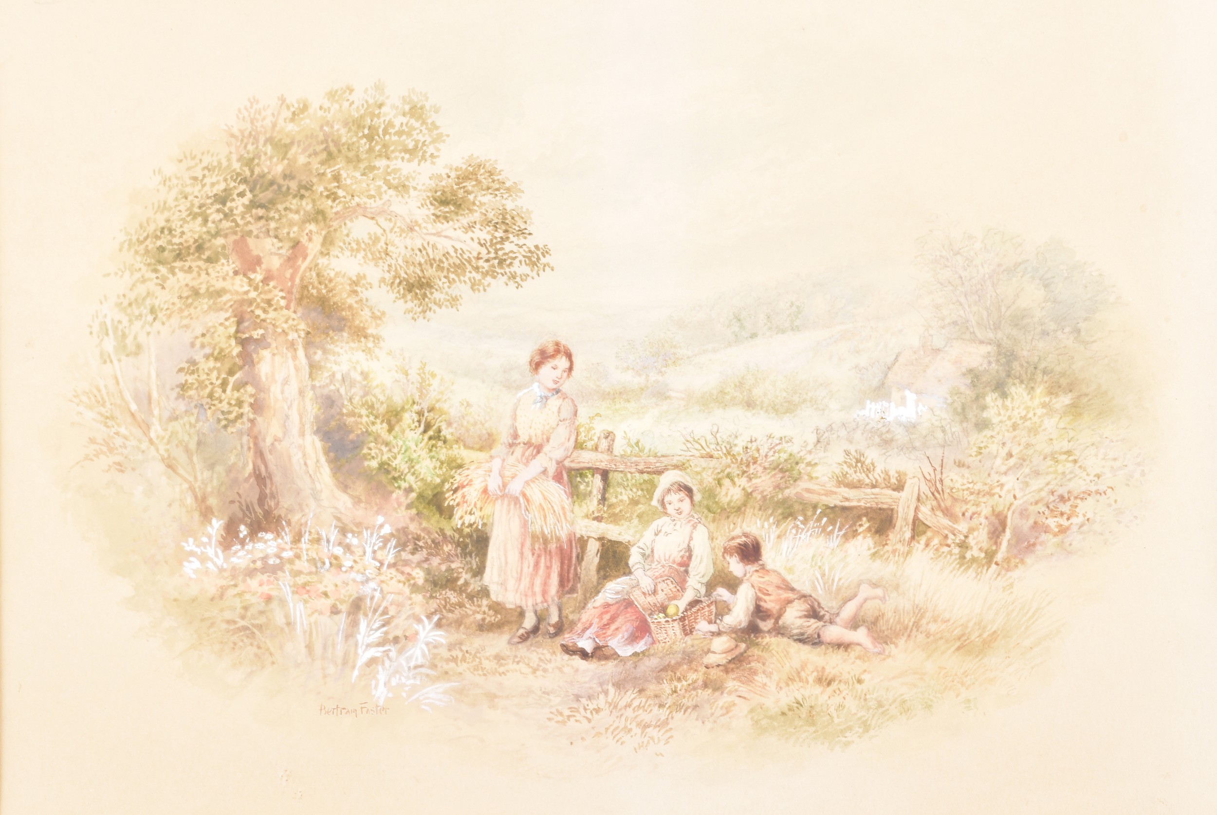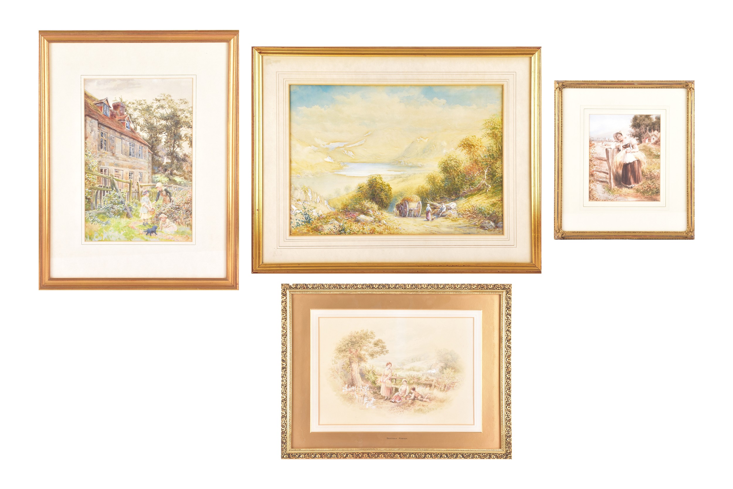 A collection of four paintings, including 'House Marlborough' by W.P Cathourne(?), depicting a pastoral scene showing a stone cottage and garden, with an adult and two children near a wooden fence, unsigned, provenance to verso 35 x 23 cm, a watercolour depicting a rural scene showing three children gathered by a wooden fence, surrounded by trees and wild grasses, signed Bertram Foster, signed to lower left, 23.2 x 34 cm, a watercolour by a follower of John Linnell (1792-1882) of a contemplative young woman pauses by a rustic fence, resting her head on her hand while holding gathered grain, against a peaceful countryside and cottage, indistinct signature, 20.7 x 17 cm, 'A View in the Lakes' by Harry P Williams (1854-77), a watercolour of a wide pastoral landscape depicting a winding dirt road, a small cart, and figures moving through rolling hills, signed to lower left, 32.5 x 46 cm, all framed and glazed. (4)