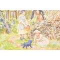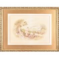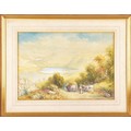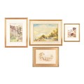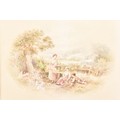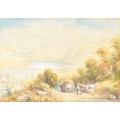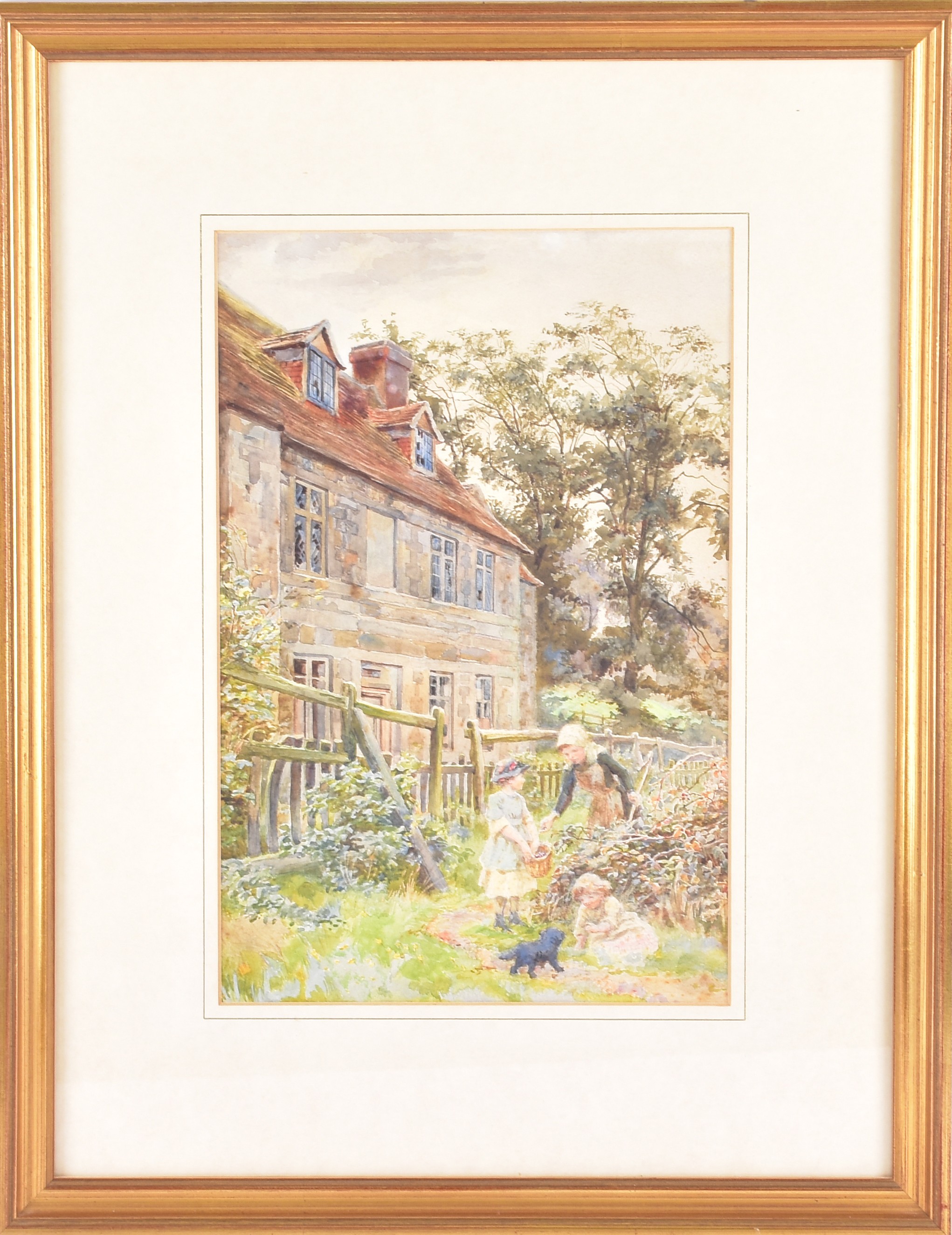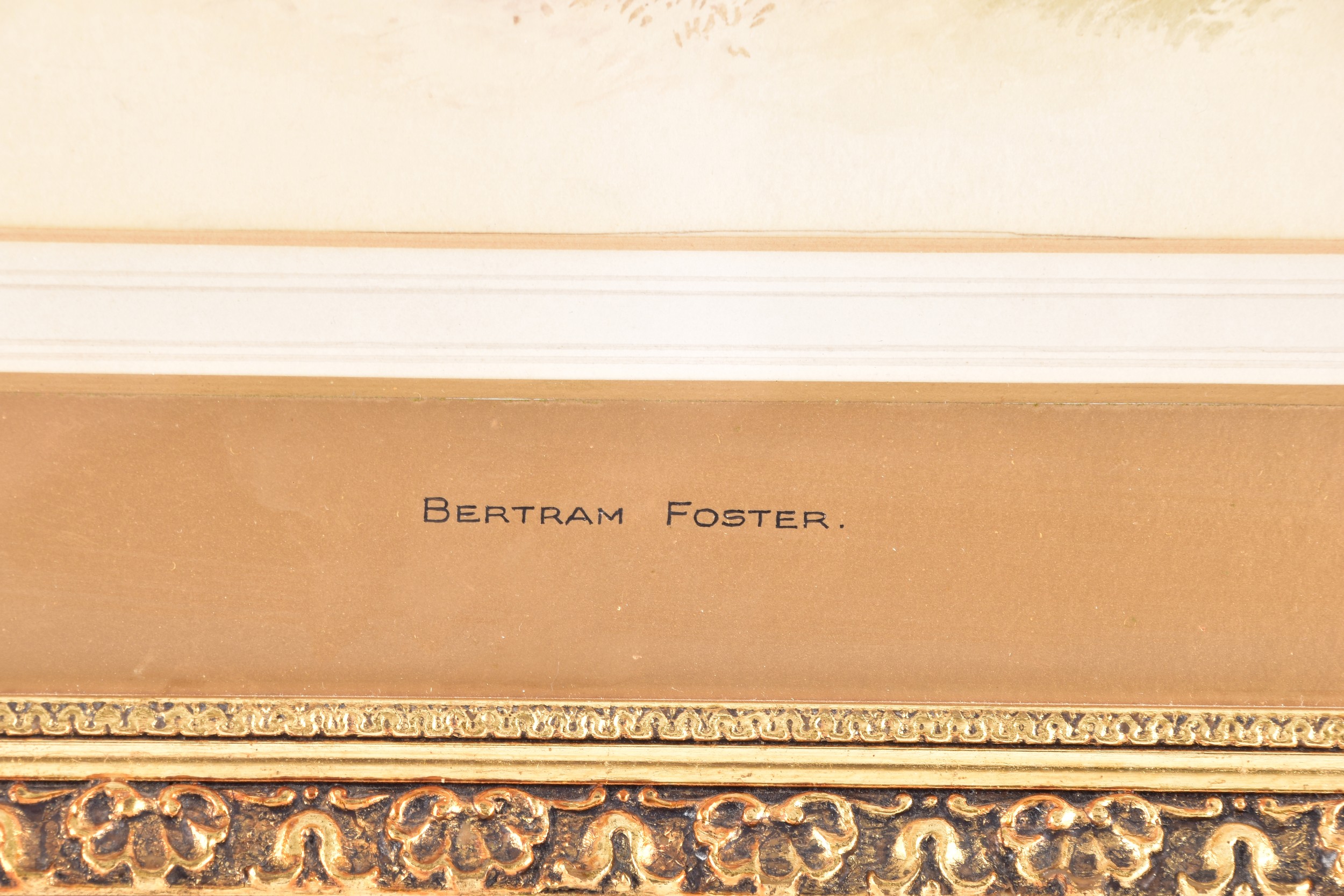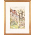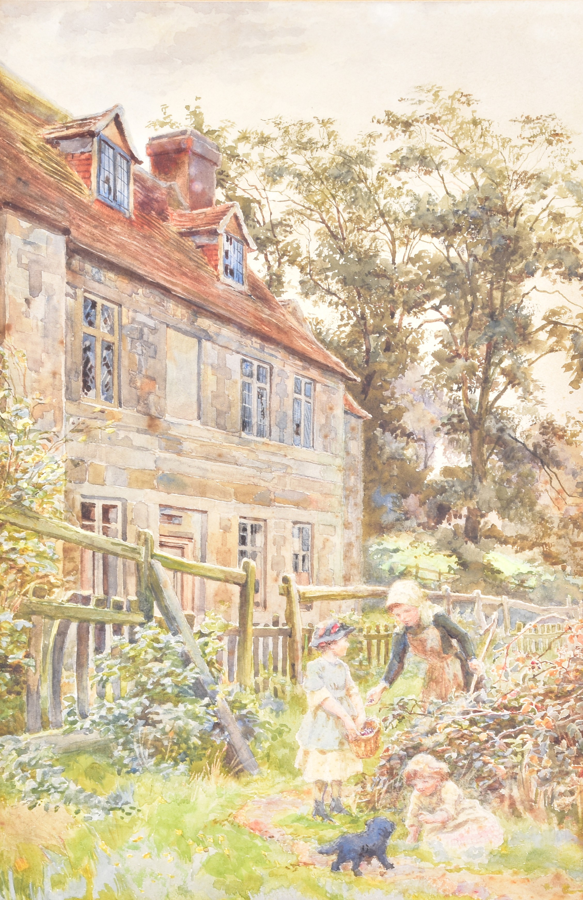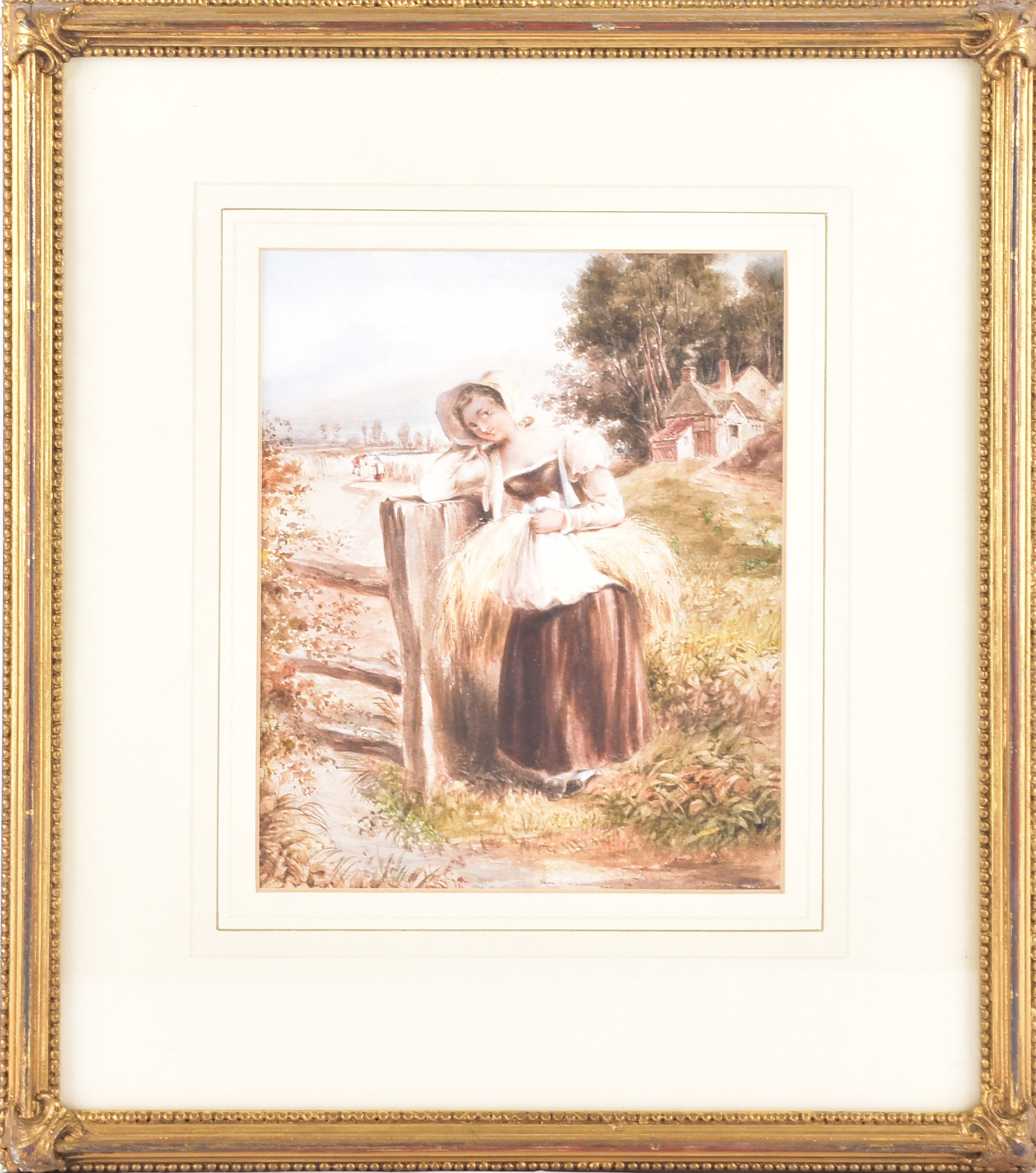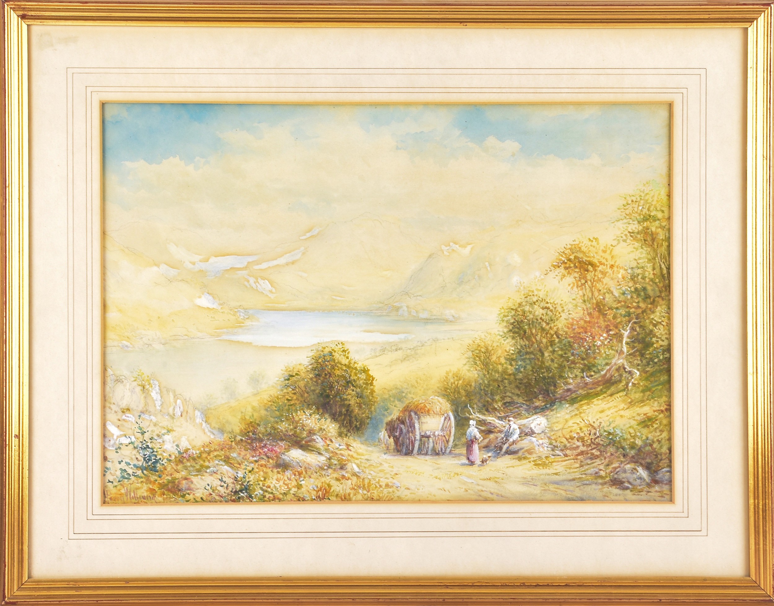 A collection of four paintings, including 'House Marlborough' by W.P Cathourne(?), depicting a pastoral scene showing a stone cottage and garden, with an adult and two children near a wooden fence, unsigned, provenance to verso 35 x 23 cm, a watercolour depicting a rural scene showing three children gathered by a wooden fence, surrounded by trees and wild grasses, signed Bertram Foster, signed to lower left, 23.2 x 34 cm, a watercolour by a follower of John Linnell (1792-1882) of a contemplative young woman pauses by a rustic fence, resting her head on her hand while holding gathered grain, against a peaceful countryside and cottage, indistinct signature, 20.7 x 17 cm, 'A View in the Lakes' by Harry P Williams (1854-77), a watercolour of a wide pastoral landscape depicting a winding dirt road, a small cart, and figures moving through rolling hills, signed to lower left, 32.5 x 46 cm, all framed and glazed. (4)