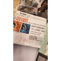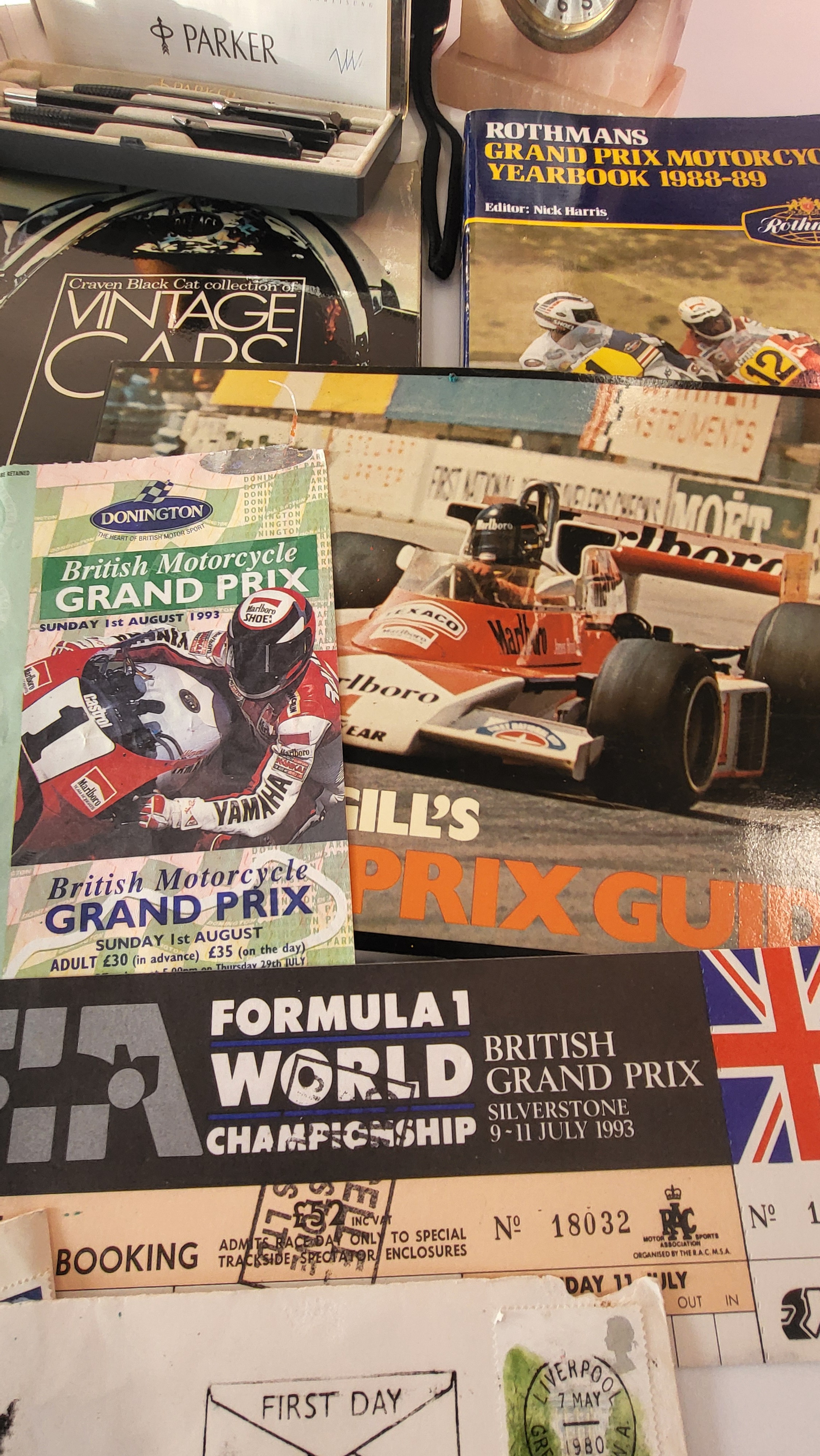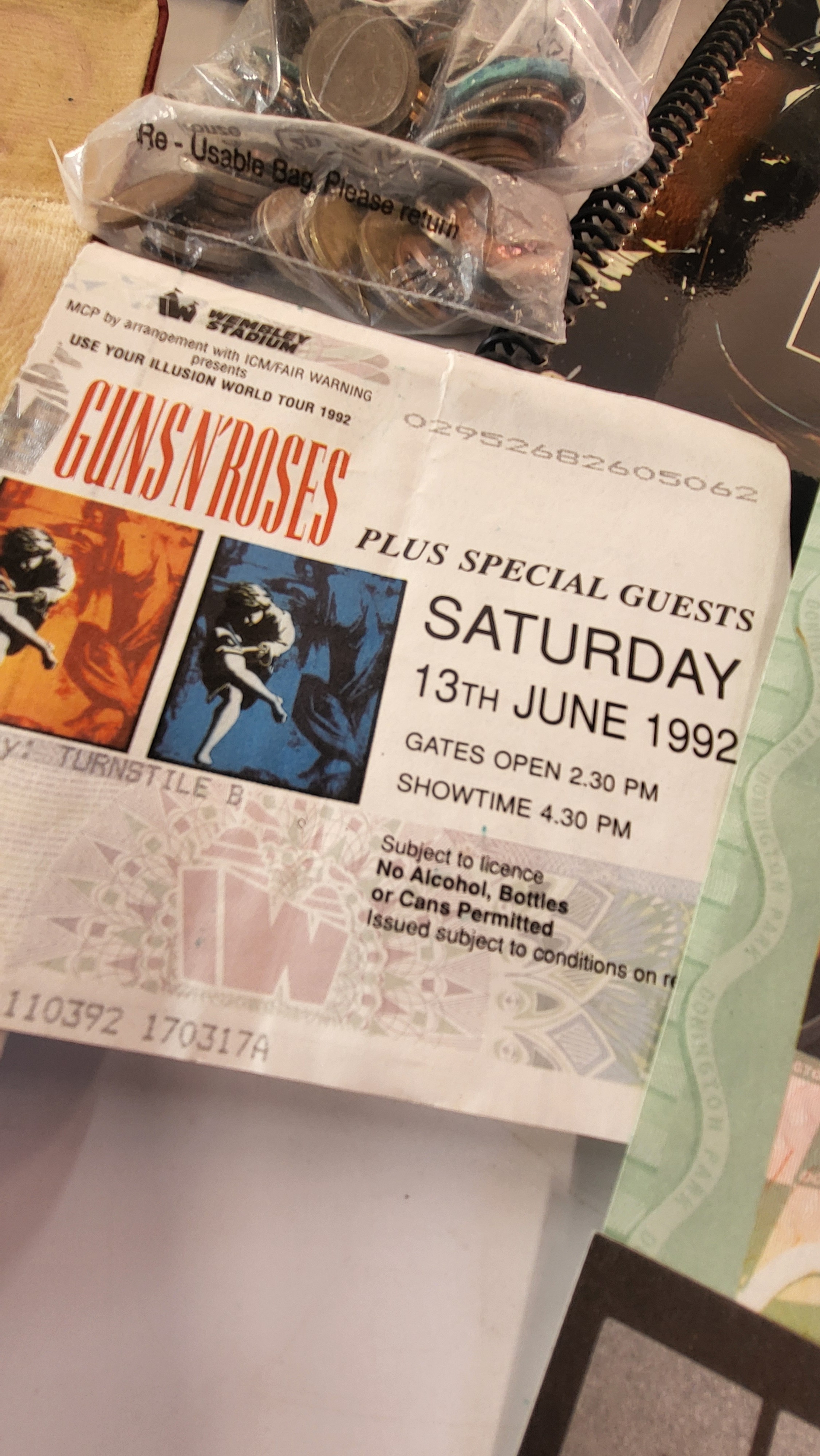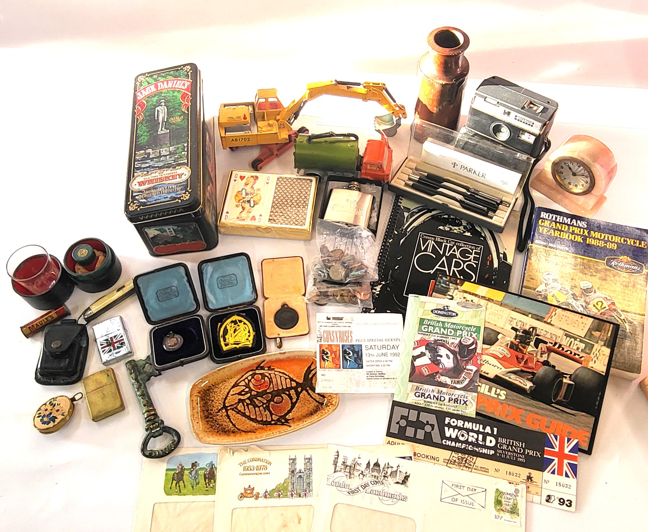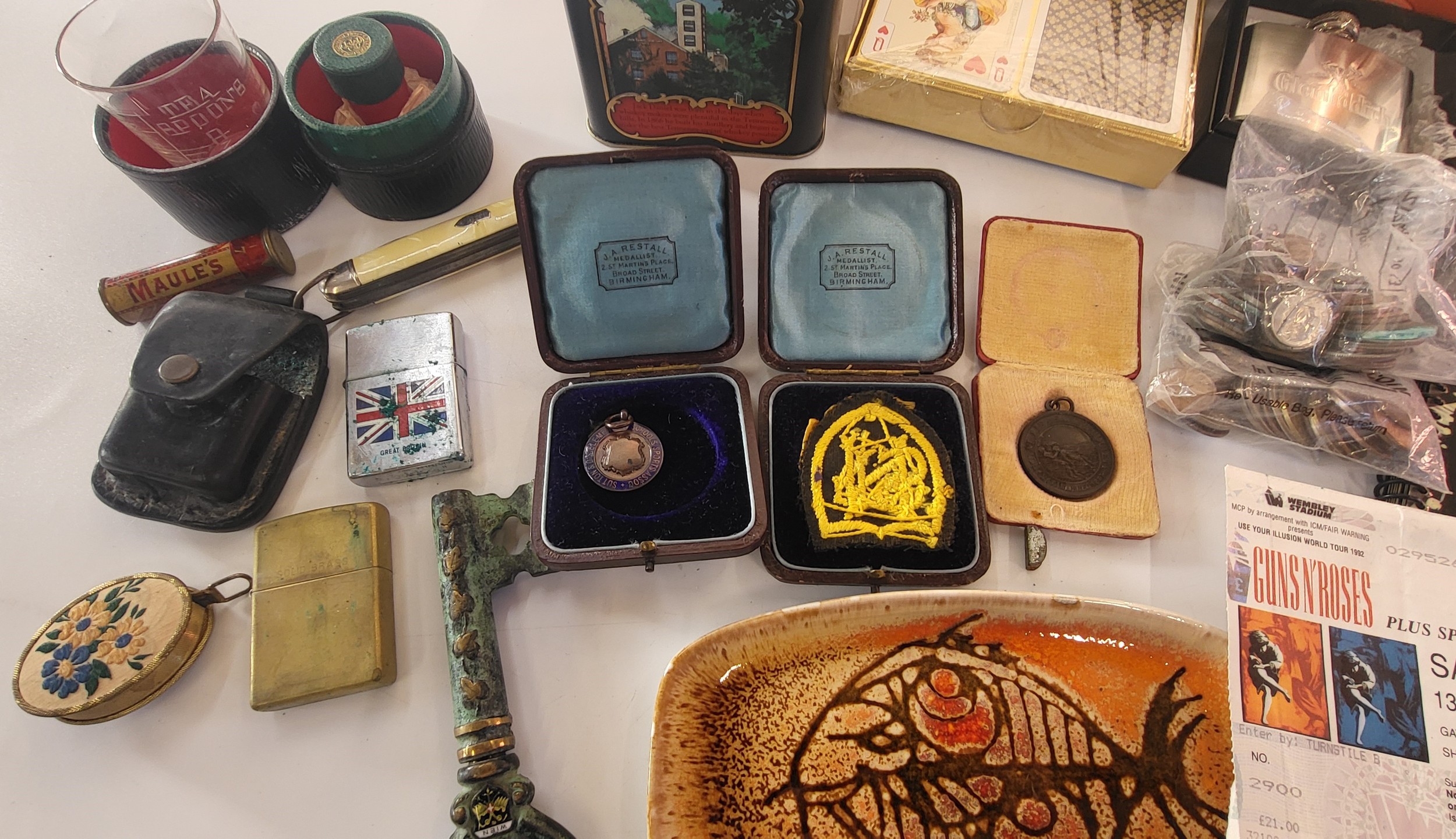 A mixed lot of house clearance including a Guns 'N Roses concert ticket stub 13th June 1992 Wembley Stadium, a Poole Pottery dish, coins, and a Maules needle case.