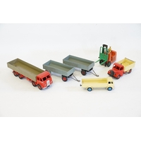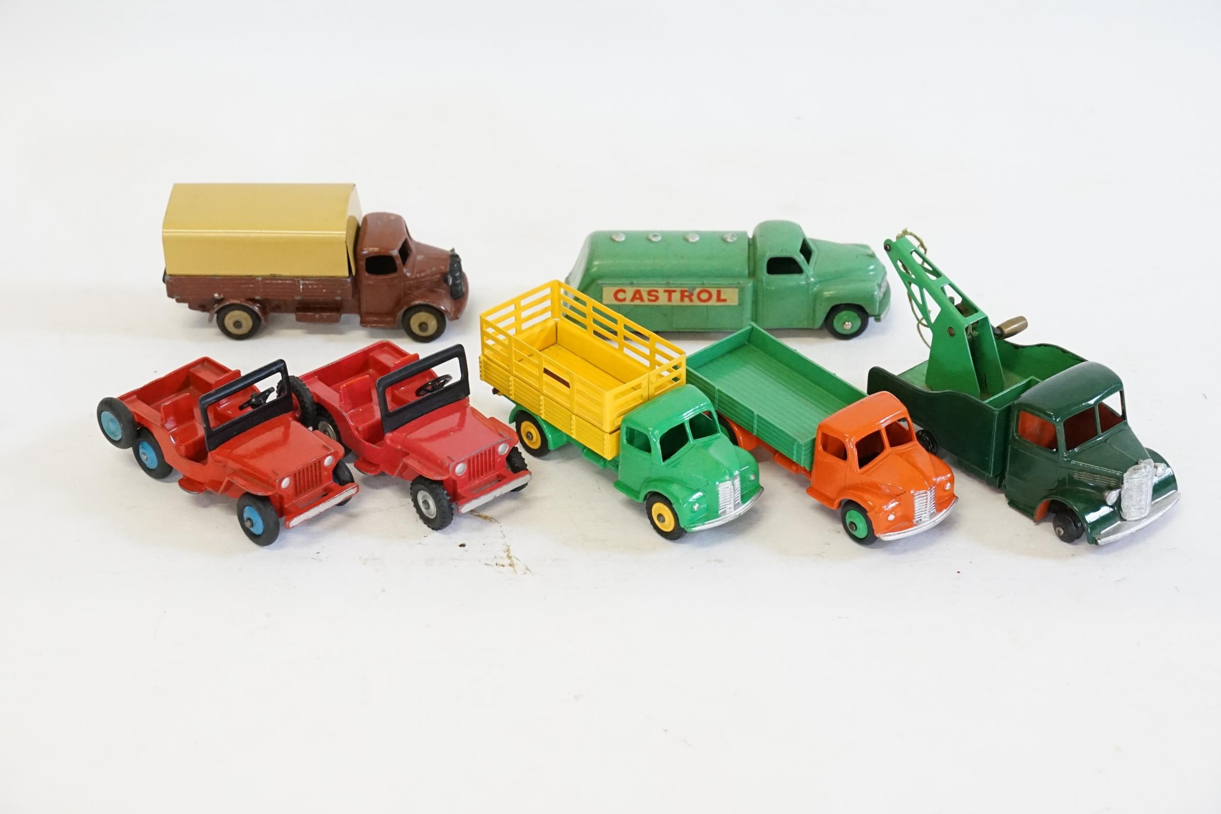 6 x Unboxed 1950s Dinky Models to include an Austin Wagon in Brown with a Tan Tilt, 2 x 25Y "Jeep's" in Red, a "Dodge Tipper Truck", a "Dodge Wagon" & a "Castrol Tanker" all in Good/Excellent Original Condition along with a Part Restored Bedford Breakdown Truck.