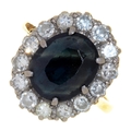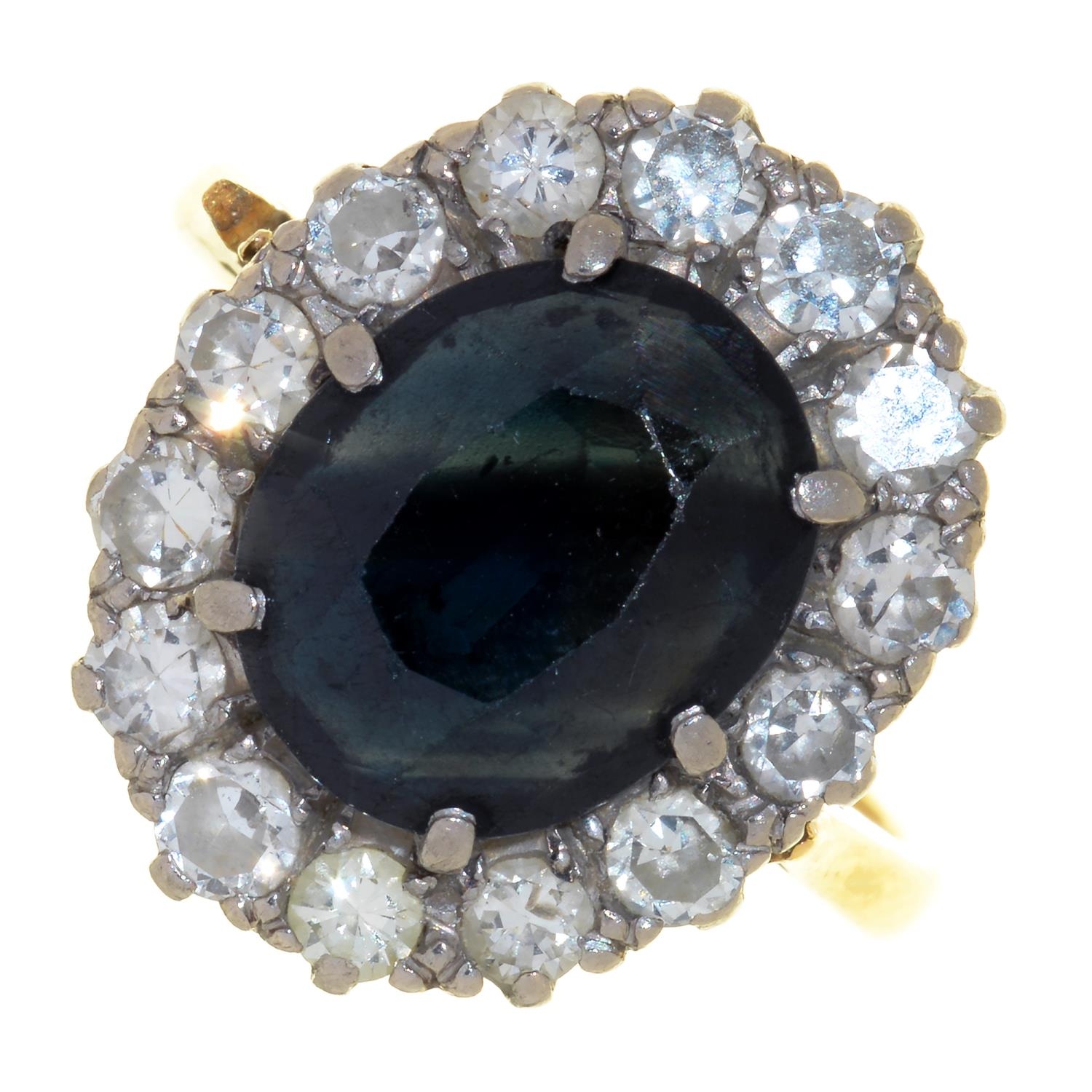 A SAPPHIRE AND DIAMOND CLUSTER RING IN GOLD, MARKED 18CT, 5.9G SIZE M½