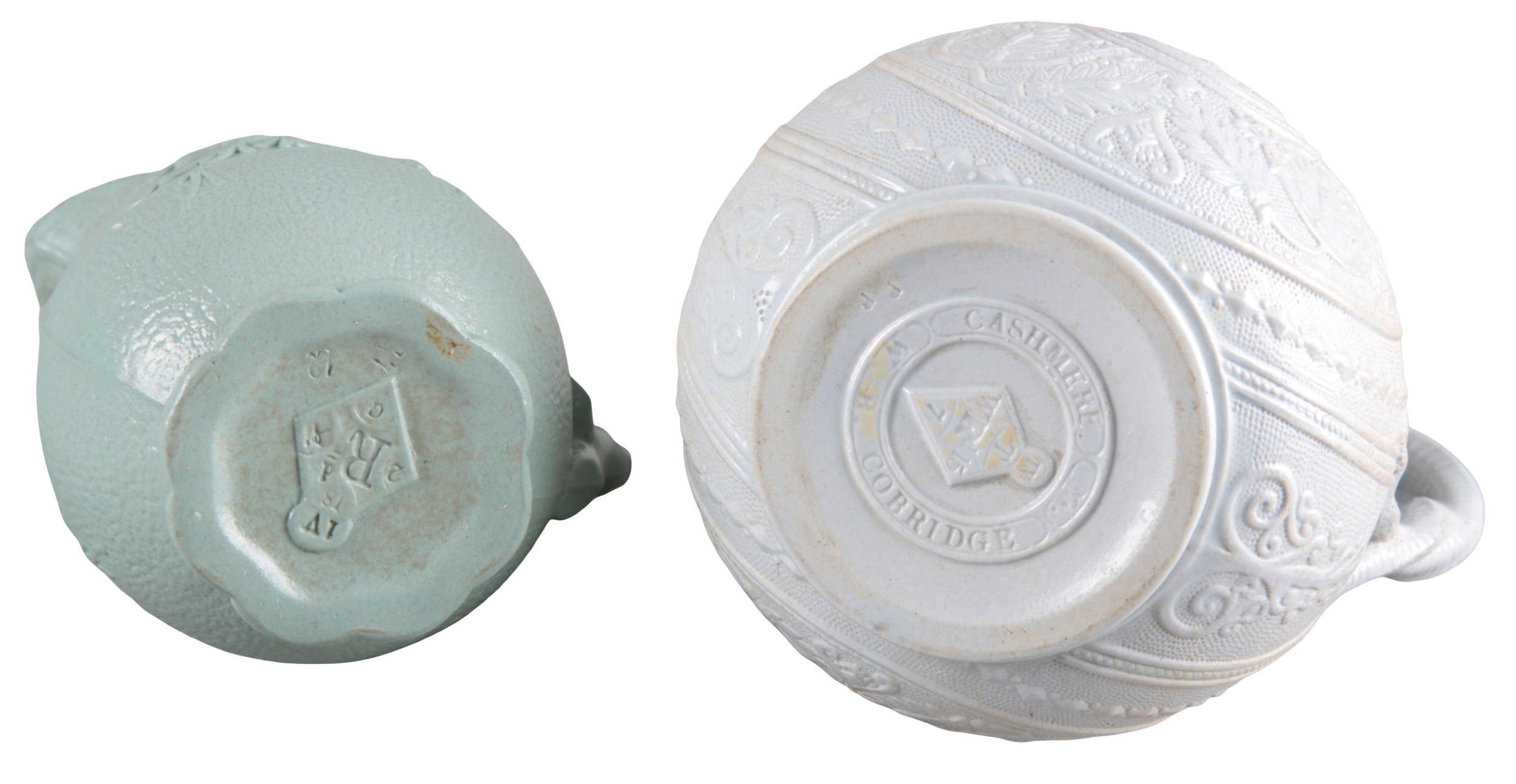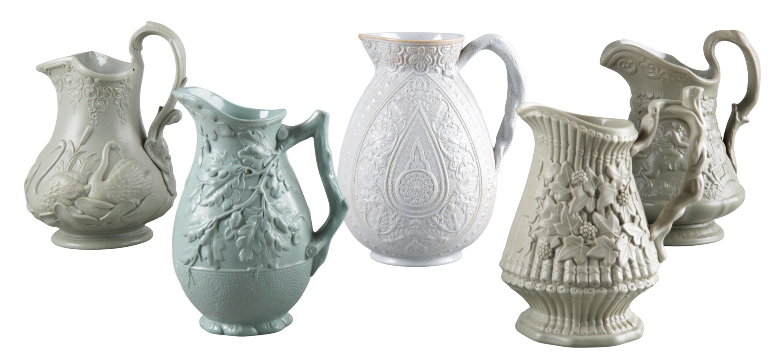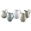 19th century, moulded in relief with scenes from the poems of Robert Burns, 16.5cm high; together with a jug by W. B. Cobridge, 17cm high; and three further similar (5)