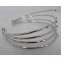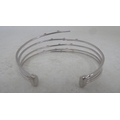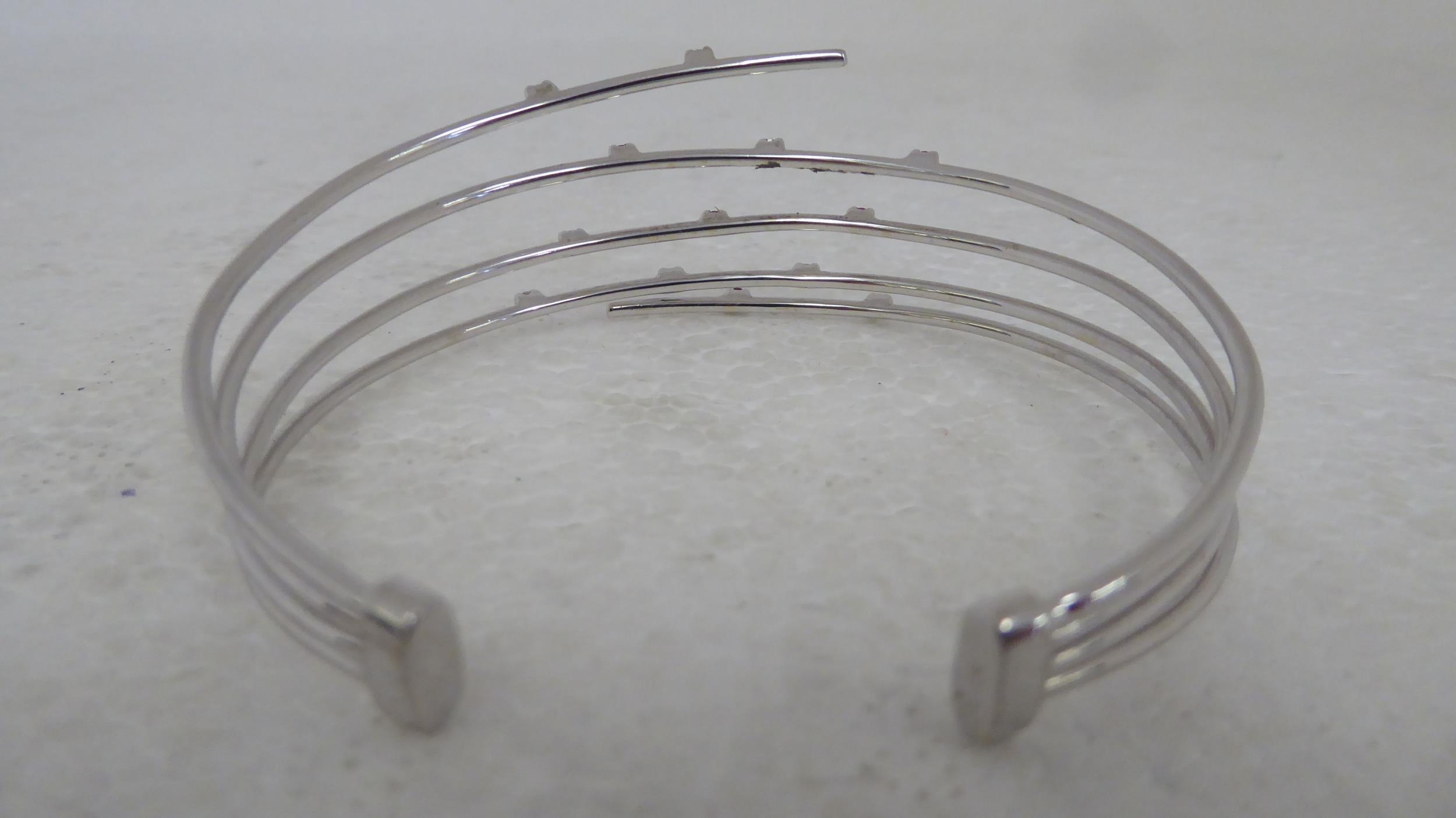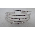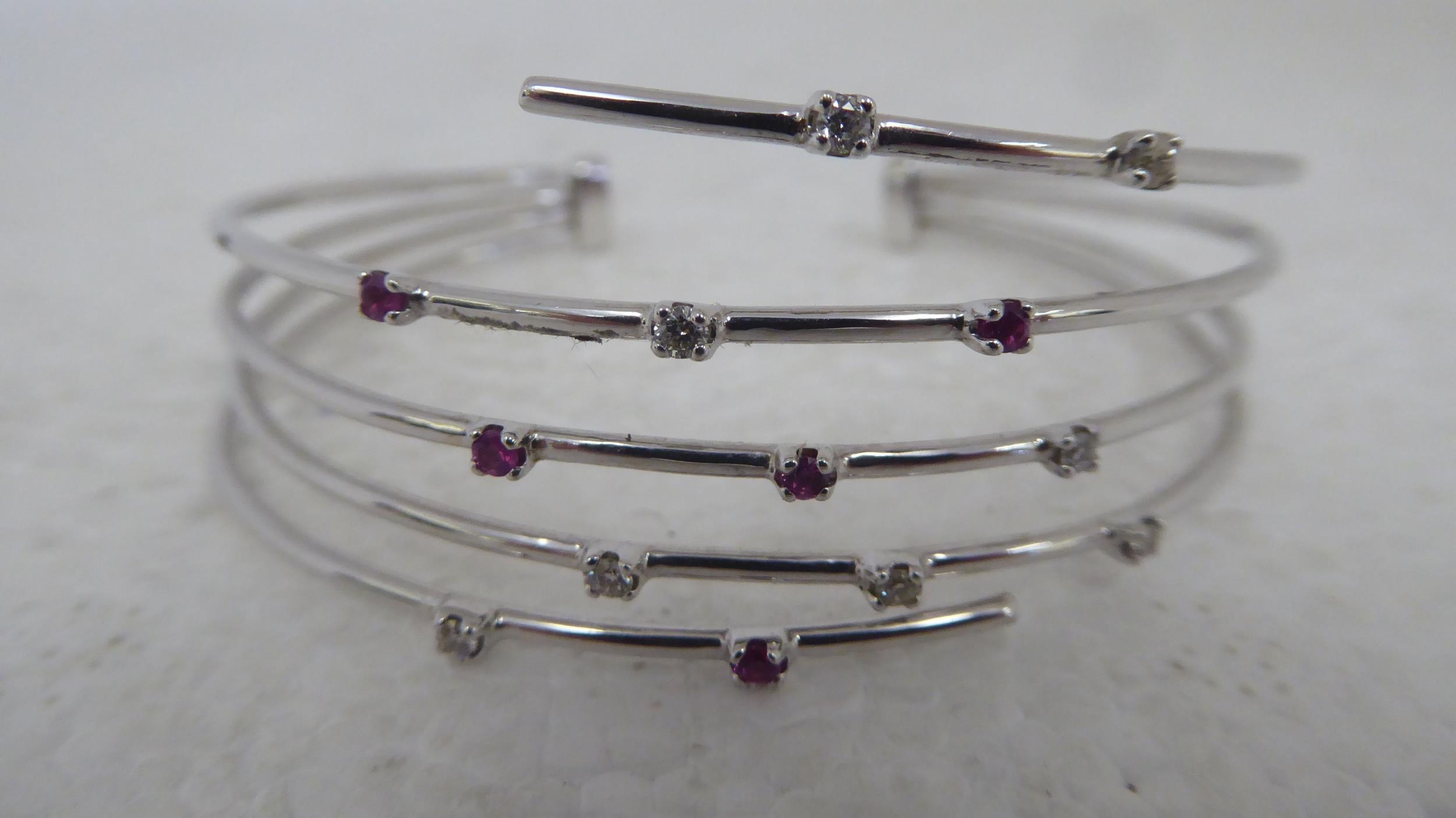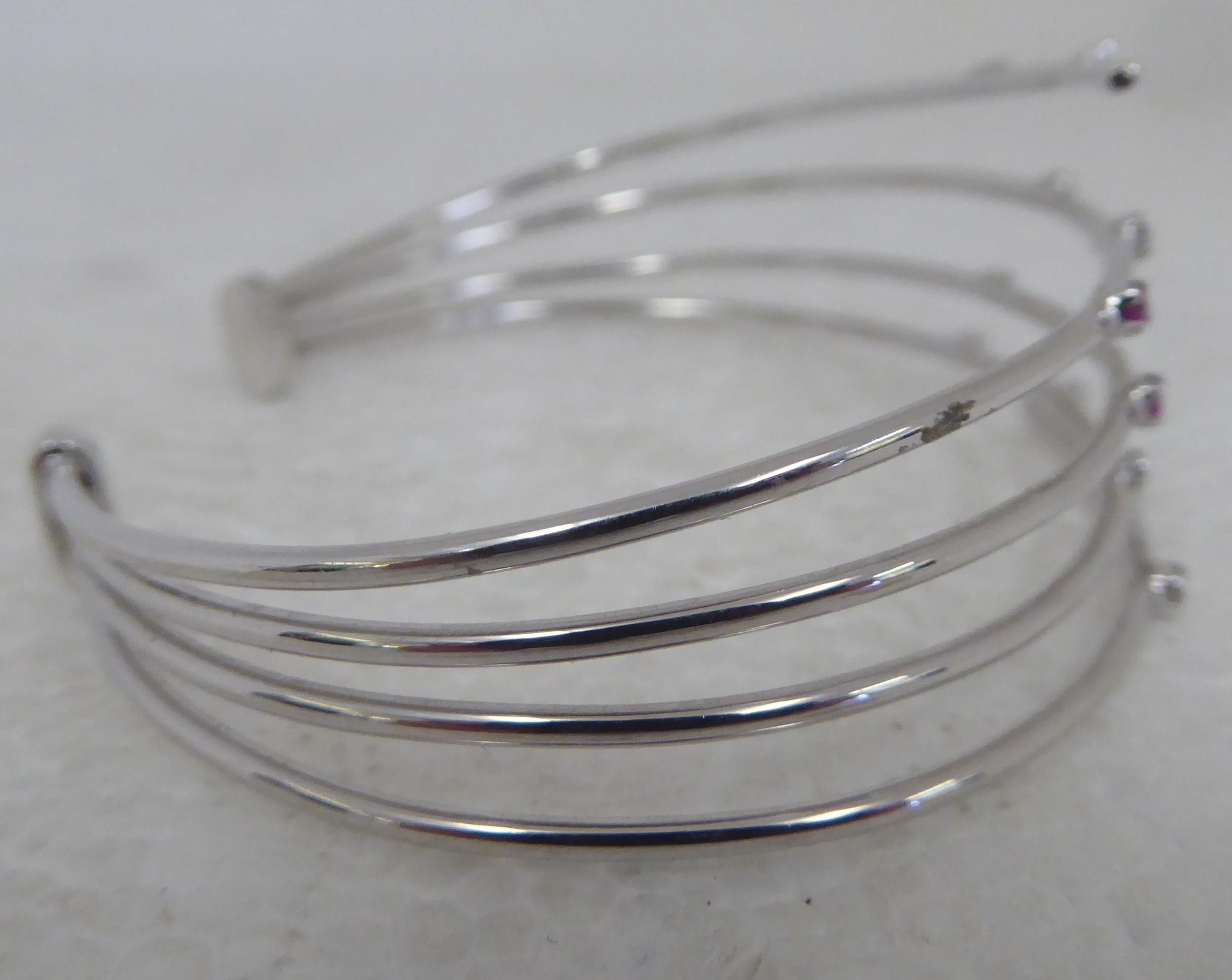 An 18ct white gold multi-strand open bangle, set with diamonds and pink sapphires