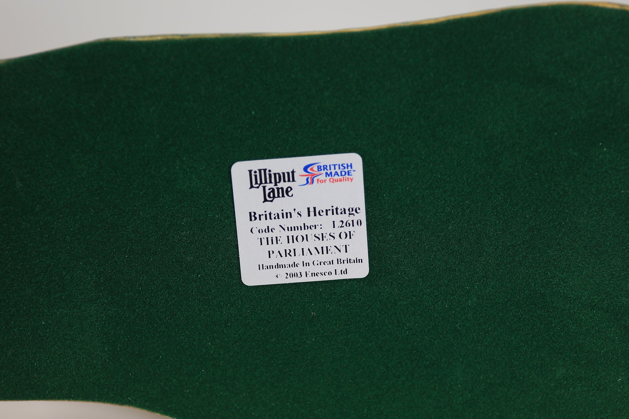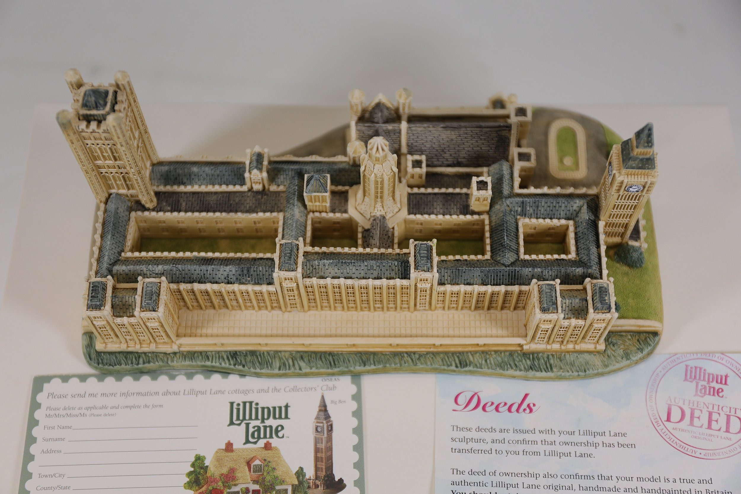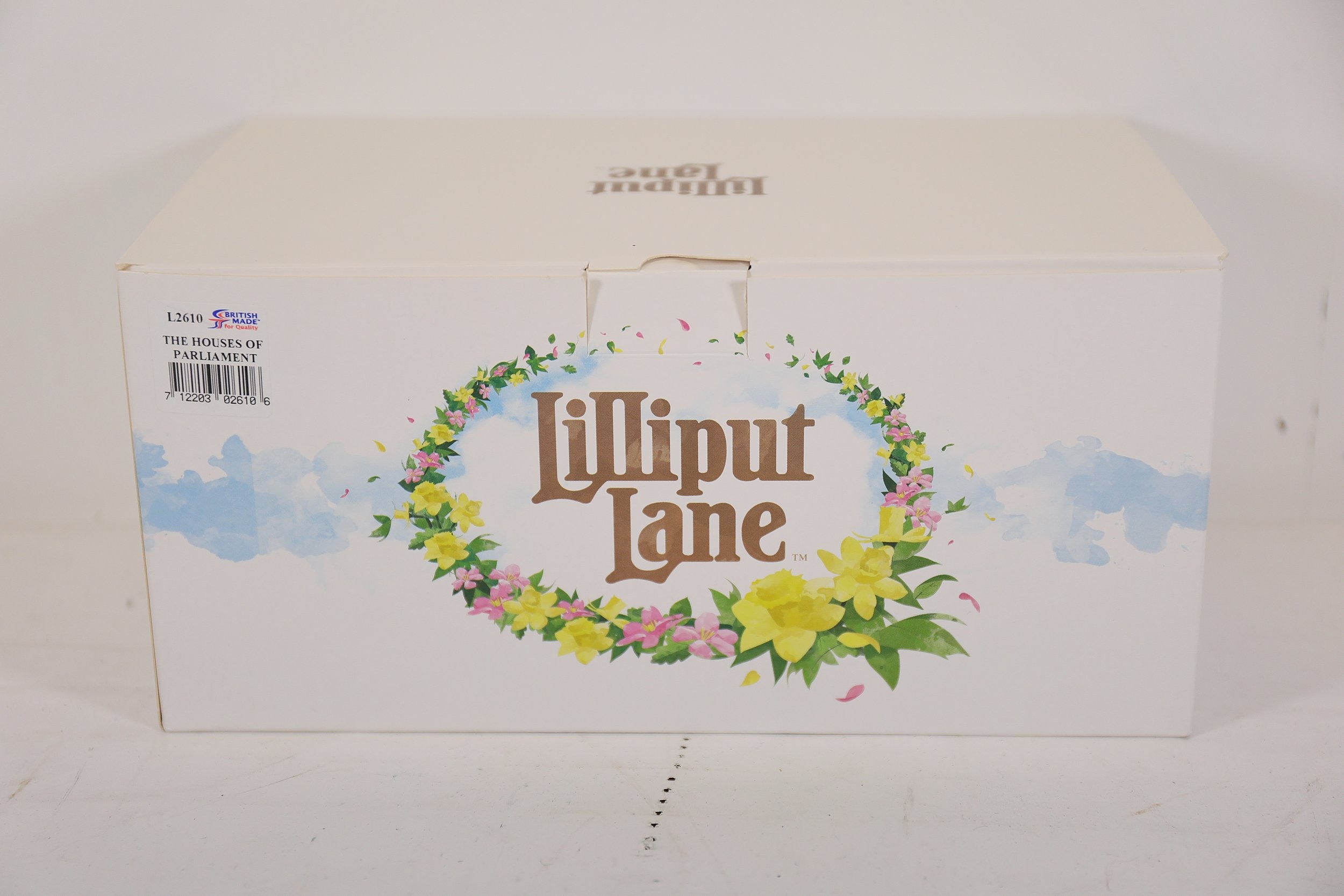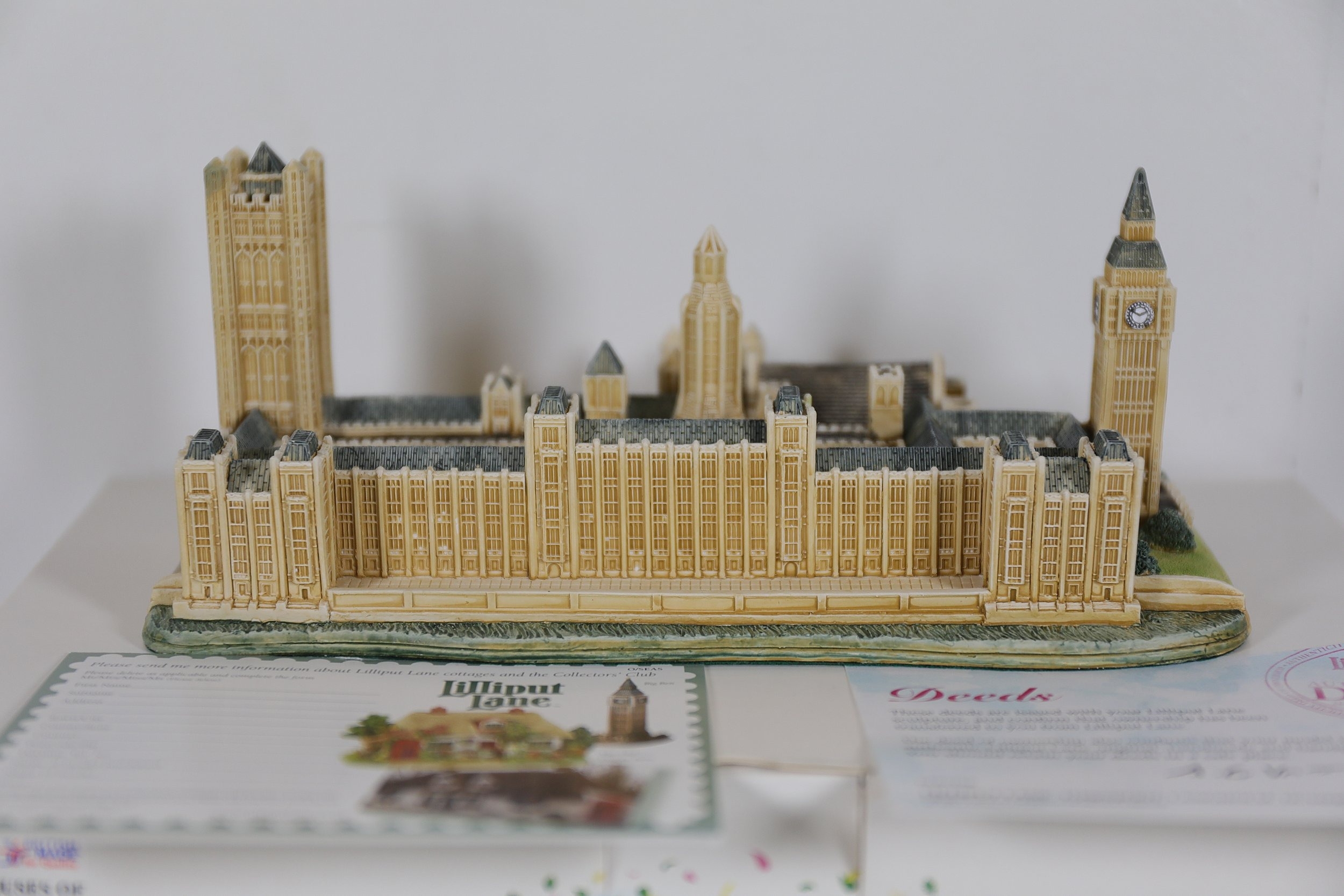 Hand-painted resin architectural miniature by Lilliput Lane, model L2610 The Houses of Parliament, depicting Westminster Palace with Elizabeth Tower Big Ben, Victoria Tower, spires, arched windows, pitched roofs and painted clock faces. The base is marked Lilliput Lane Made in Great Britain. Complete with original Deeds certificate and collectors leaflet, and the original branded box bearing the Lilliput Lane floral wreath logo, Treasured Worldwide slogan and side label reading L2610 The Houses of Parliament British Heritage Models with barcode. Approx 20 x 8 x 10 cm. Produced by Lilliput Lane, UK, 1982 to 2016.