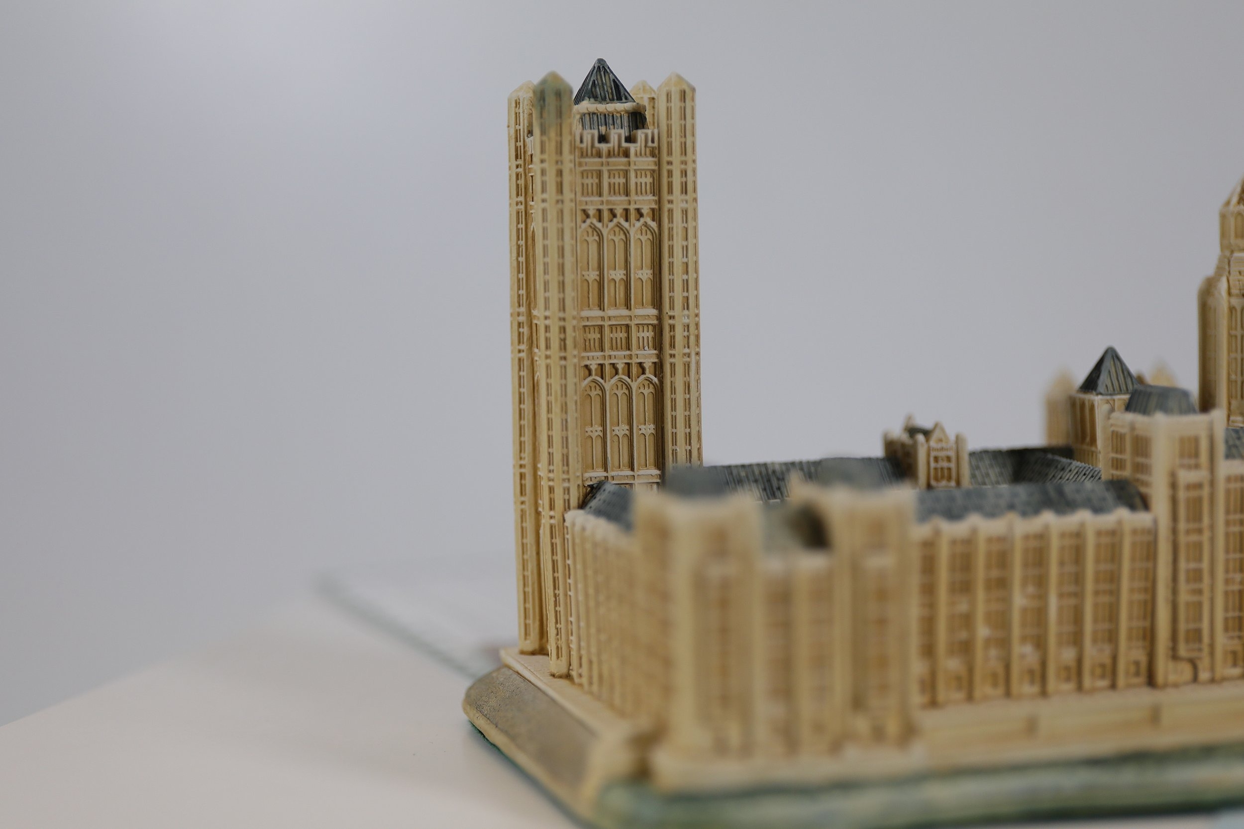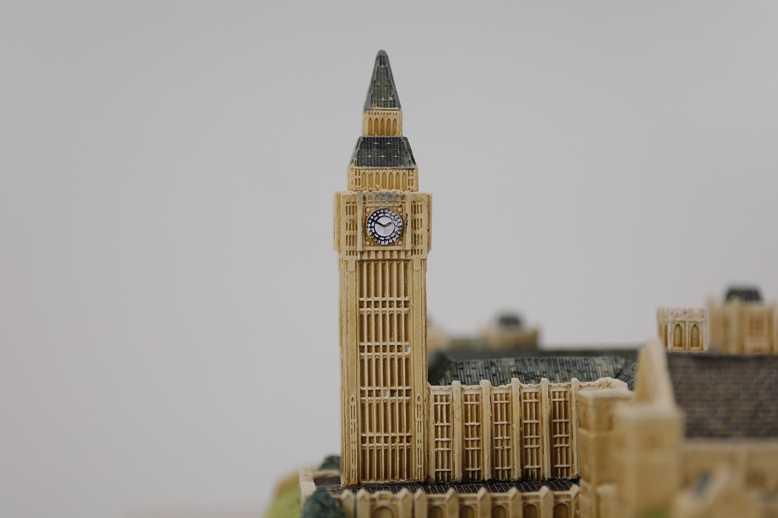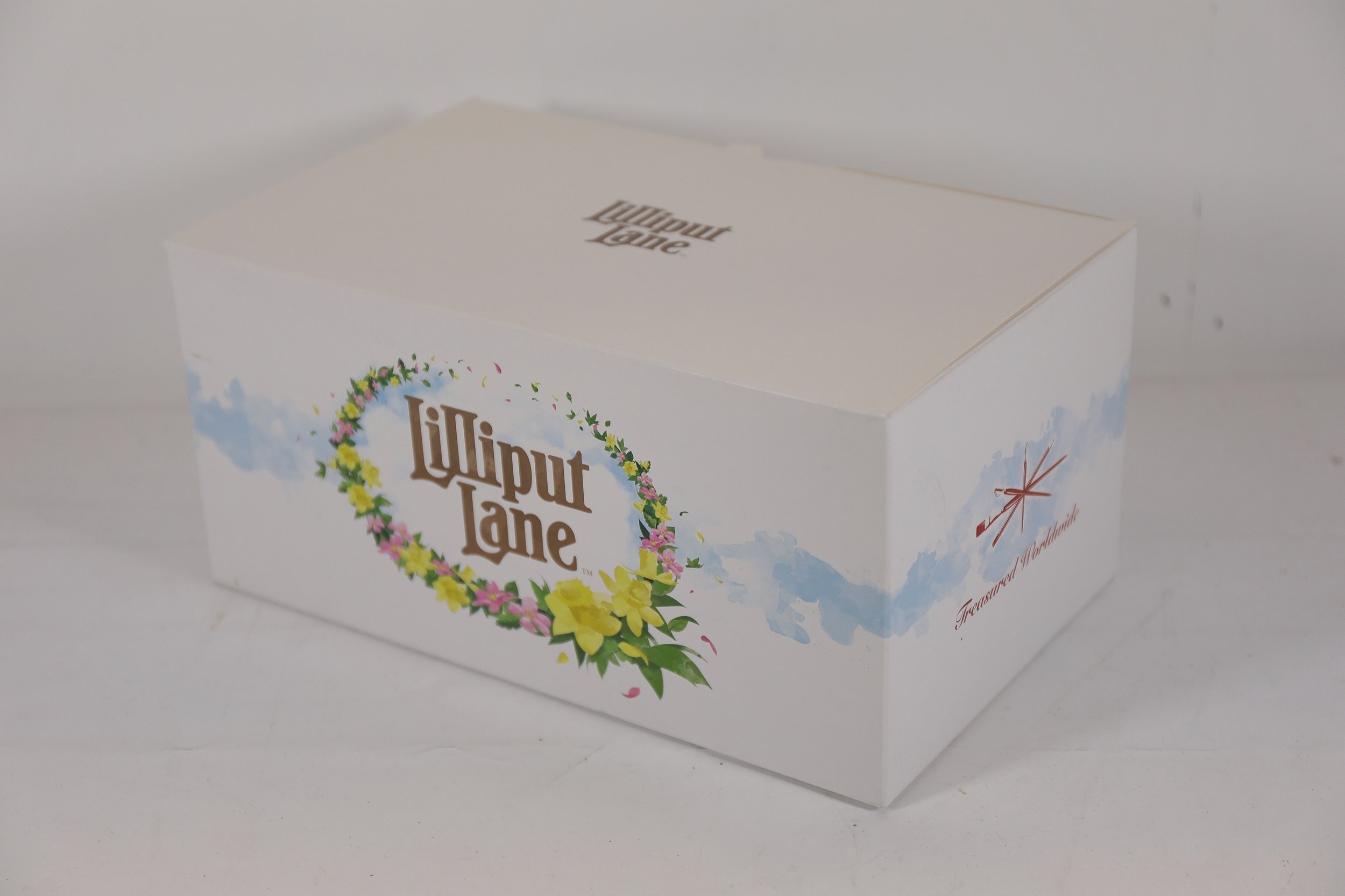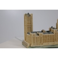 Hand-painted resin architectural miniature by Lilliput Lane, model L2610 The Houses of Parliament, depicting Westminster Palace with Elizabeth Tower Big Ben, Victoria Tower, spires, arched windows, pitched roofs and painted clock faces. The base is marked Lilliput Lane Made in Great Britain. Complete with original Deeds certificate and collectors leaflet, and the original branded box bearing the Lilliput Lane floral wreath logo, Treasured Worldwide slogan and side label reading L2610 The Houses of Parliament British Heritage Models with barcode. Approx 20 x 8 x 10 cm. Produced by Lilliput Lane, UK, 1982 to 2016.