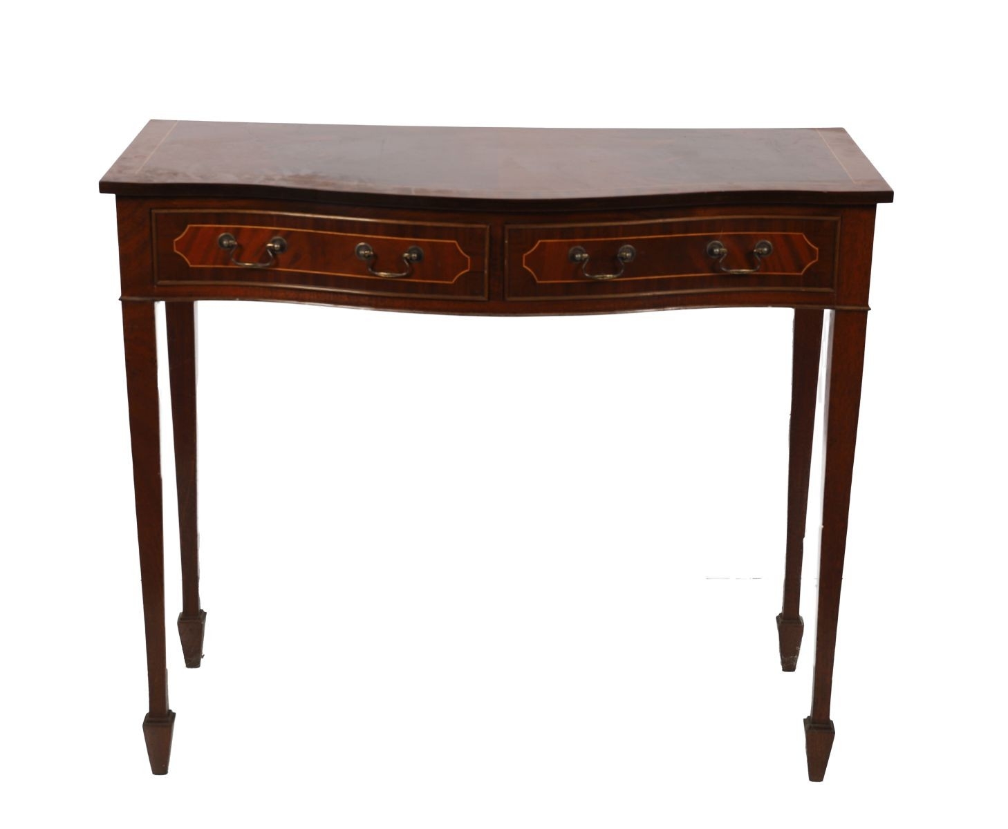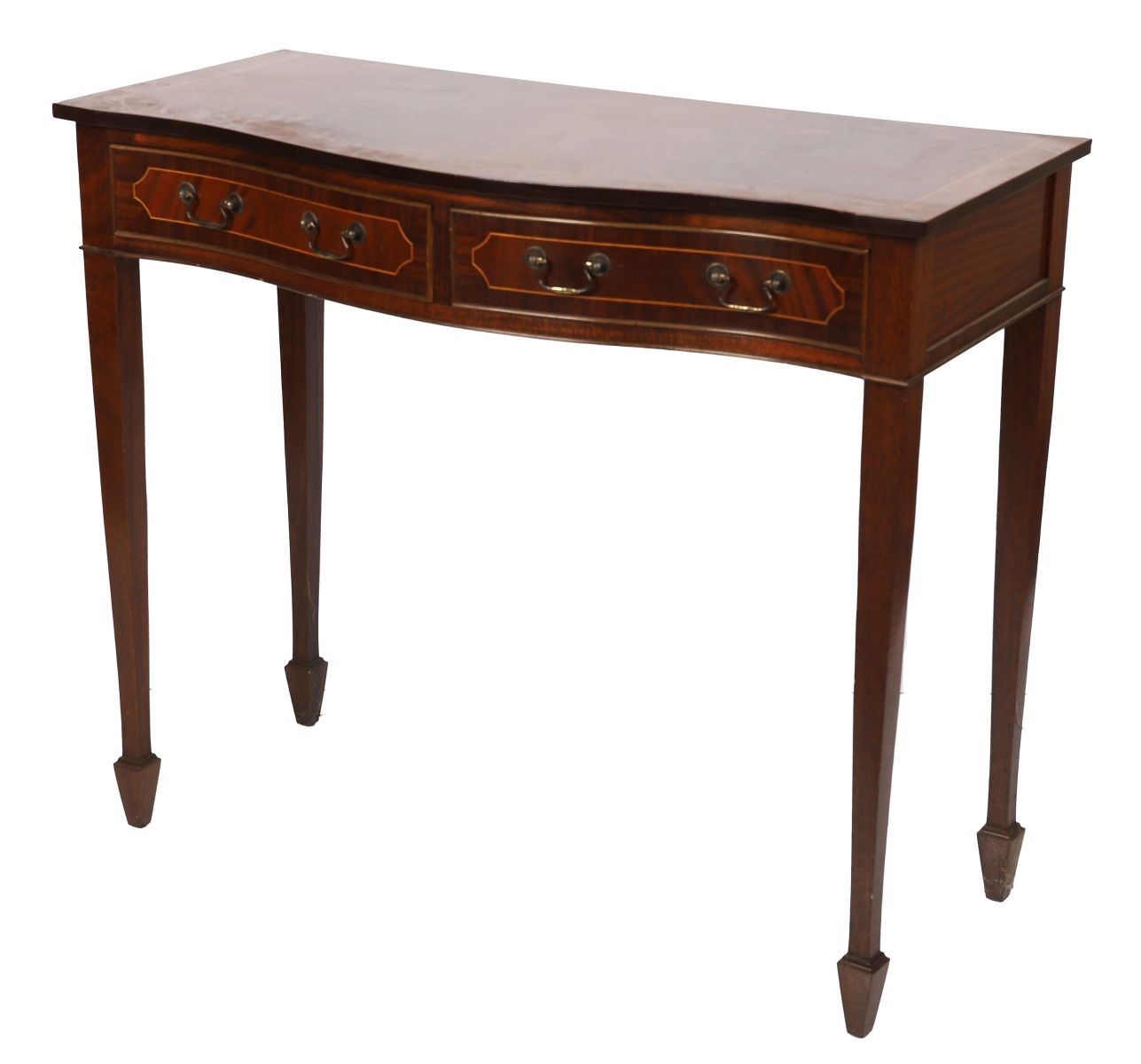 the rectangular-shaped top with serpentine front above two frieze drawers furnished with brass scroll handles, raised on square tapered legs terminating on spade feet. 85 cm. high; 100 cm. wide; 46 cm. deep FURNITURE Tuesday 25th November 2025 11:06:57