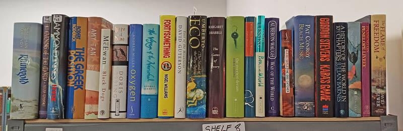 RHINEGOLD BY STEPHAN GRUNDY, SIGNED - 1994, BLACK DOGS BY IAN MCEWAN, SIGNED - 1992, THE ISLAND OF THE DAY BEFORE BY UMBERTO ECO, SIGNED - 1995, BEN, IN THE WORLD BY DORIS LESSING, SIGNED - 2000, AND VARIOUS OTHER BOOKS (SOME SIGNED) OVER SHELF