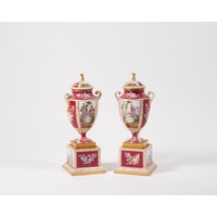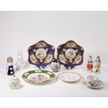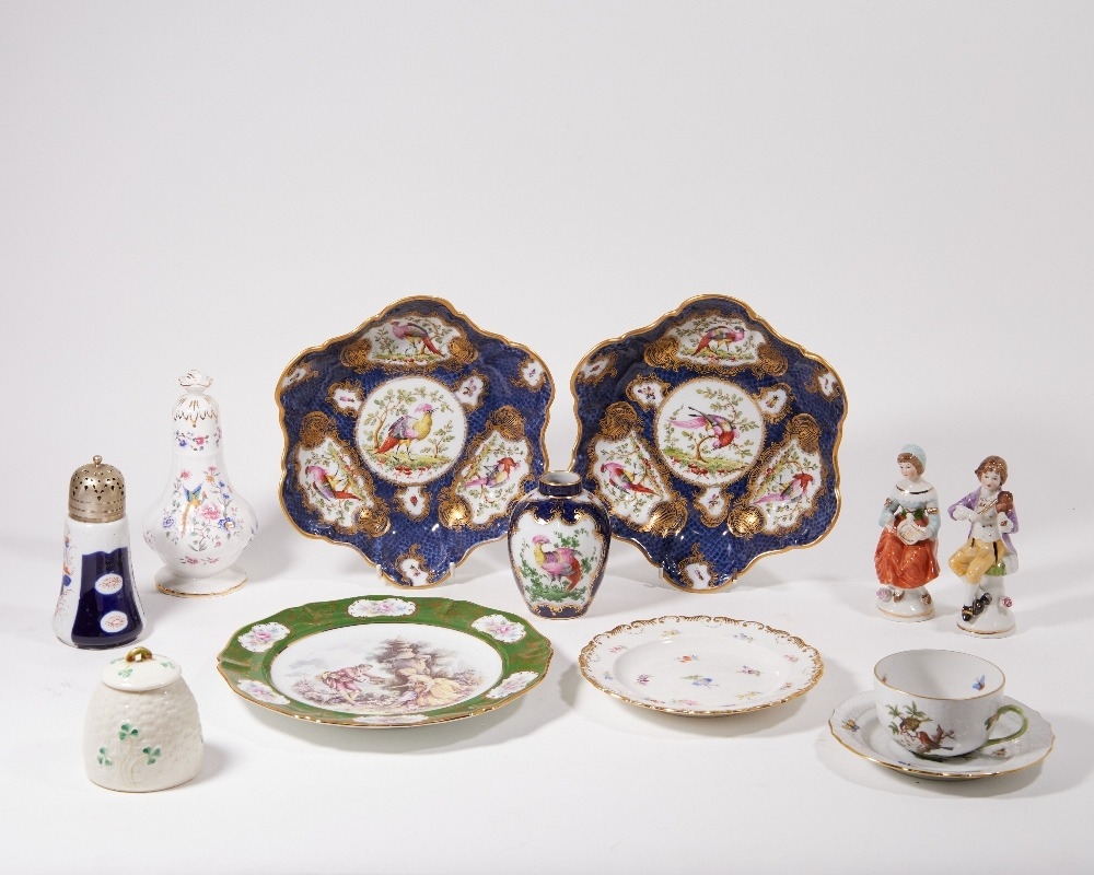 A mixed group of porcelain, late 19th - 20th centuries, comprising: a Meissen cake plate, blue crossed swords and pressnumern, painted with scattered floral sprays, with gilt scalloped rim, 18.4cm diameter; a Herend porcelain tea cup and saucer, blue printed marks, decorated in the 'Rothschild Birds' pattern with naturalistic tree branch handle, the cup 5.3cm high, the saucer 15.8cm diameter; a Belleek basketweave lidded pot, post-1891 green printed mark, with green-painted shamrocks, 9cm high; a Limoges porcelain cabinet plate, painted to the centre with a gallant and lady in a garden setting, the border with cartouches of floral sprays to a green ground, 25cm diameter; a pair of Worcester-style shaped dishes on tripod feet, decorated with cartouches of exotic birds to a blue scale ground, pseudo-Worcester fretted square marks, 8cm high, 25cm diameter; and two Continental porcelain figures of child musicians, unmarked, 14.5cm high; a Hammersley 'Bird of Paradise' pattern caster, of large proportions, with pierced top and rose finial, 19.5cm high; a Worcester-style vase, of ovoid form and decorated with panels of exotic birds to a blue scale ground, 12cm high; and a 19th century caster, with silver plated pierced cap and decorated in the Imari palette, 15.5cm high (12)