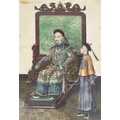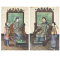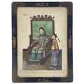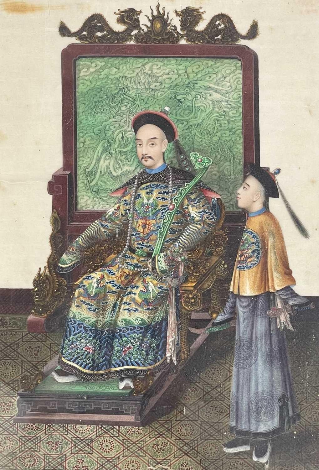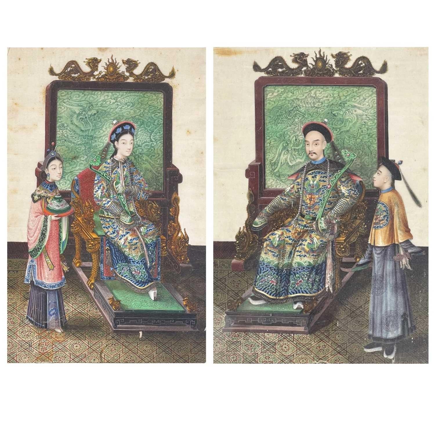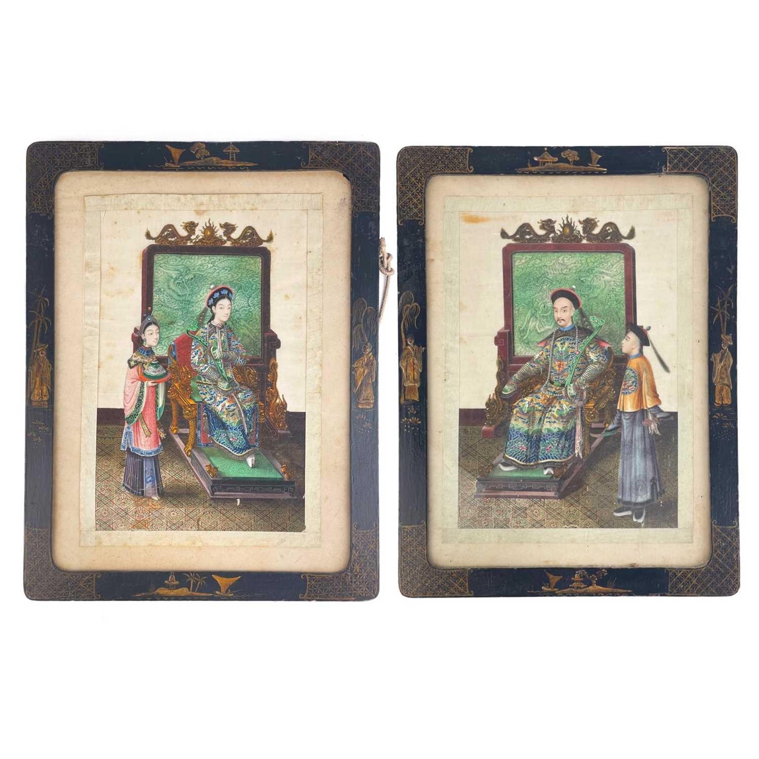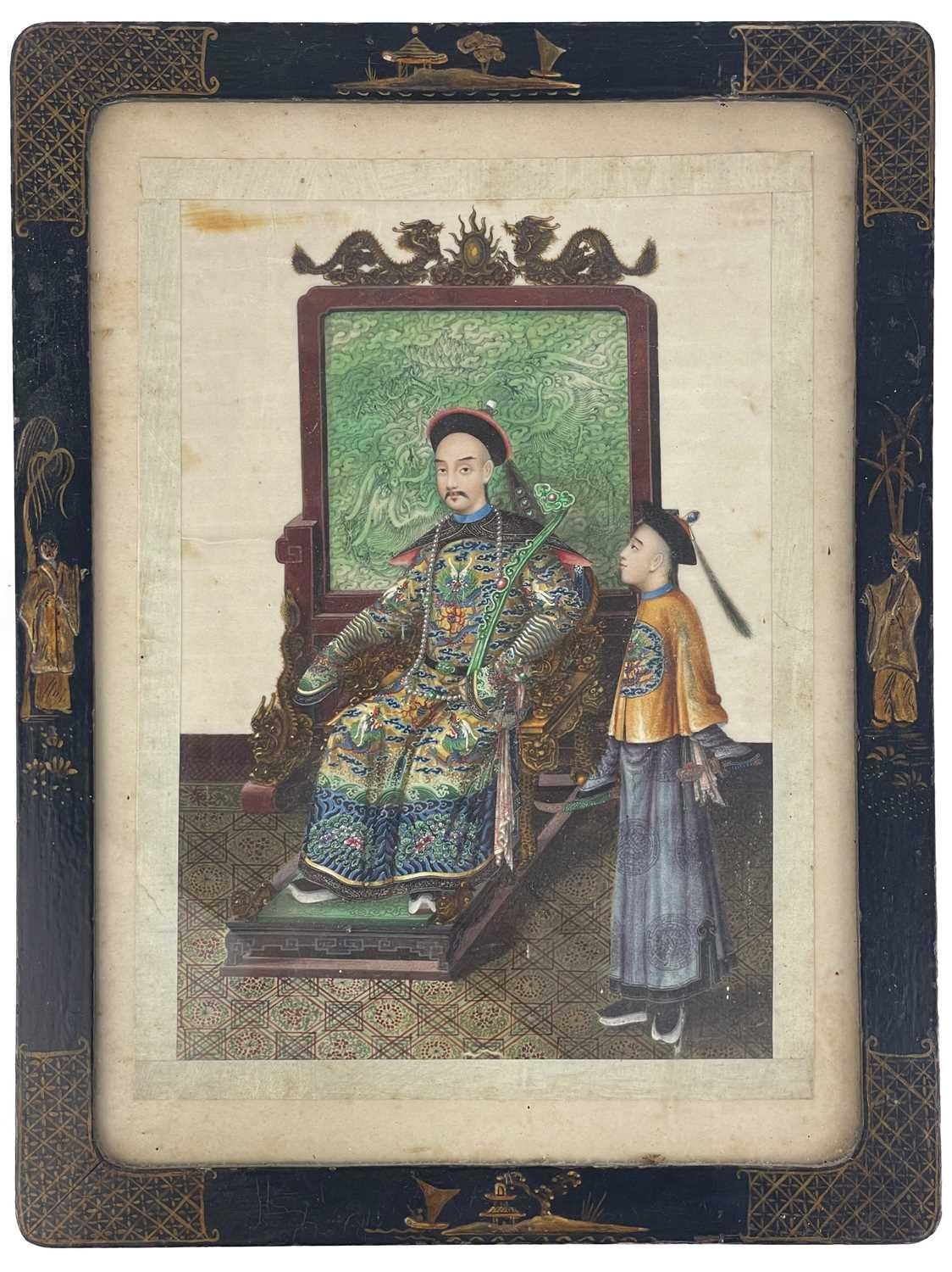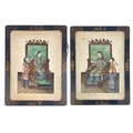 A pair of Chinese paintings on pith paper, late 19th century. Each of a seated young dignitary with an attendant beside, with dragon decorated screen to rear, in a black lacquered frame, 38.5 x 30cm. (2) Slight discoloration, foxing to paper, one is glazed the other has no glass.
