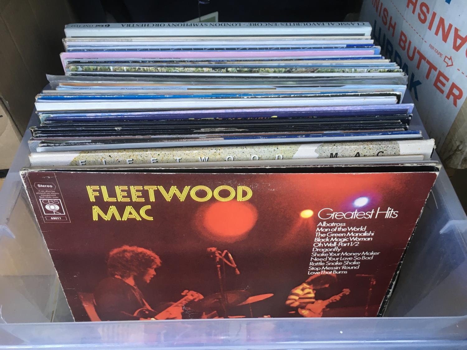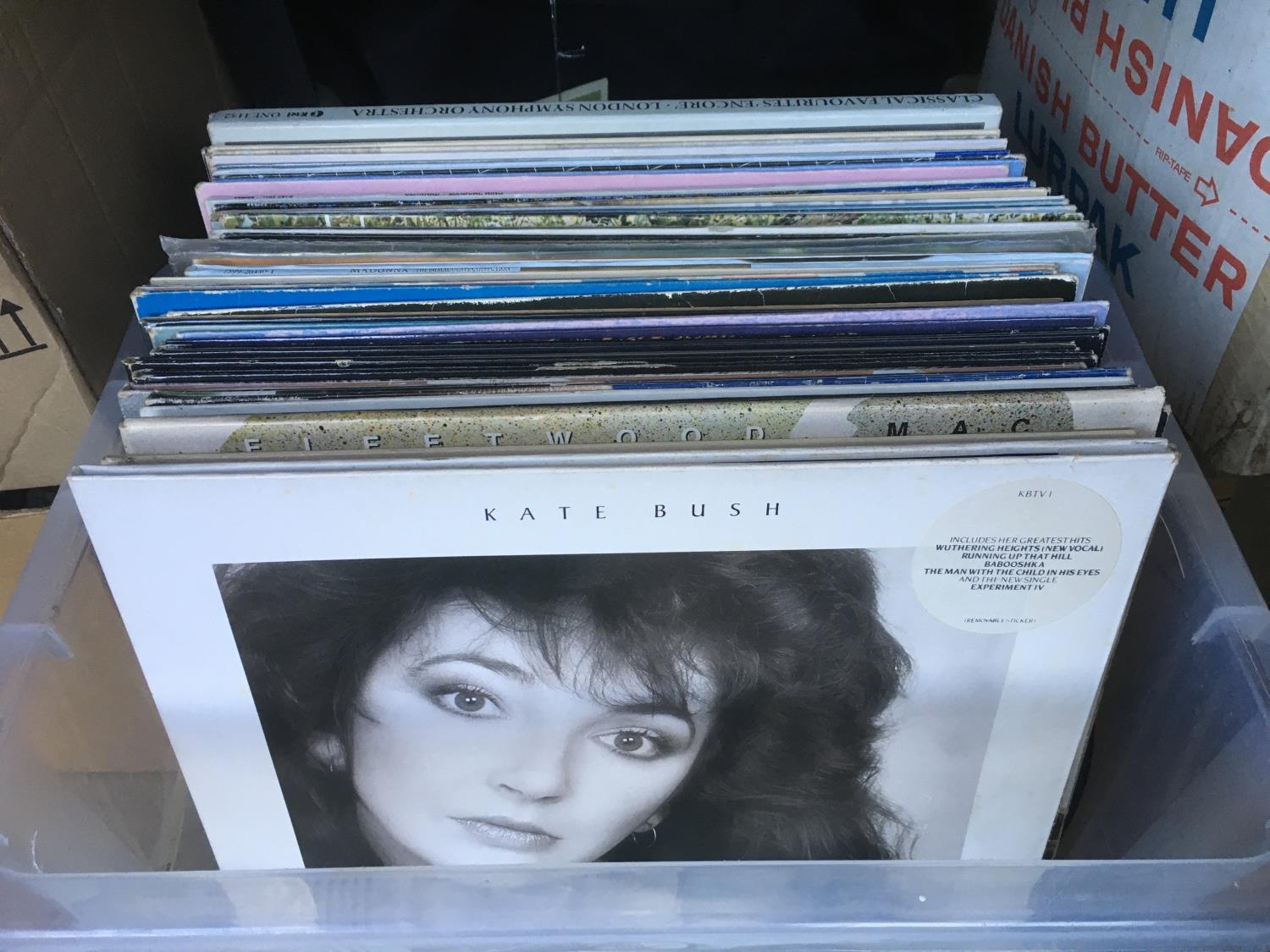A box containing a collection of LPs by various artists including Kate Bush, Rolling Stones, Fleetwood Mac and others.